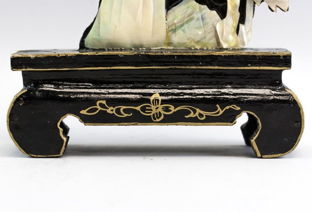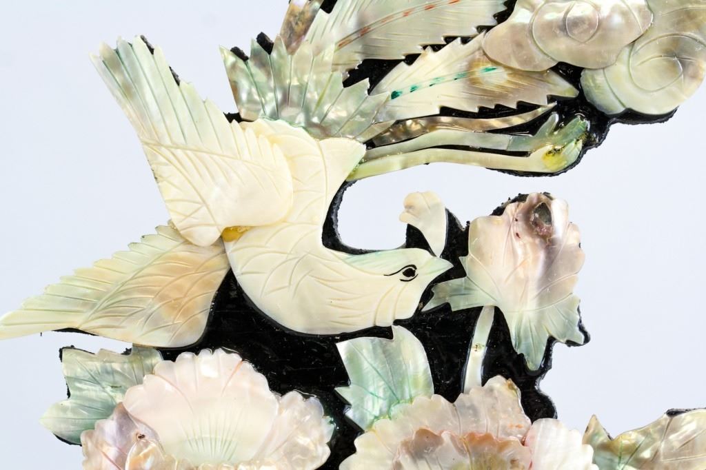 Chinese decorative plaque. Featuring birds and flowers. Rests on rectangular stand. H: 37 cm. W: 16 cm.