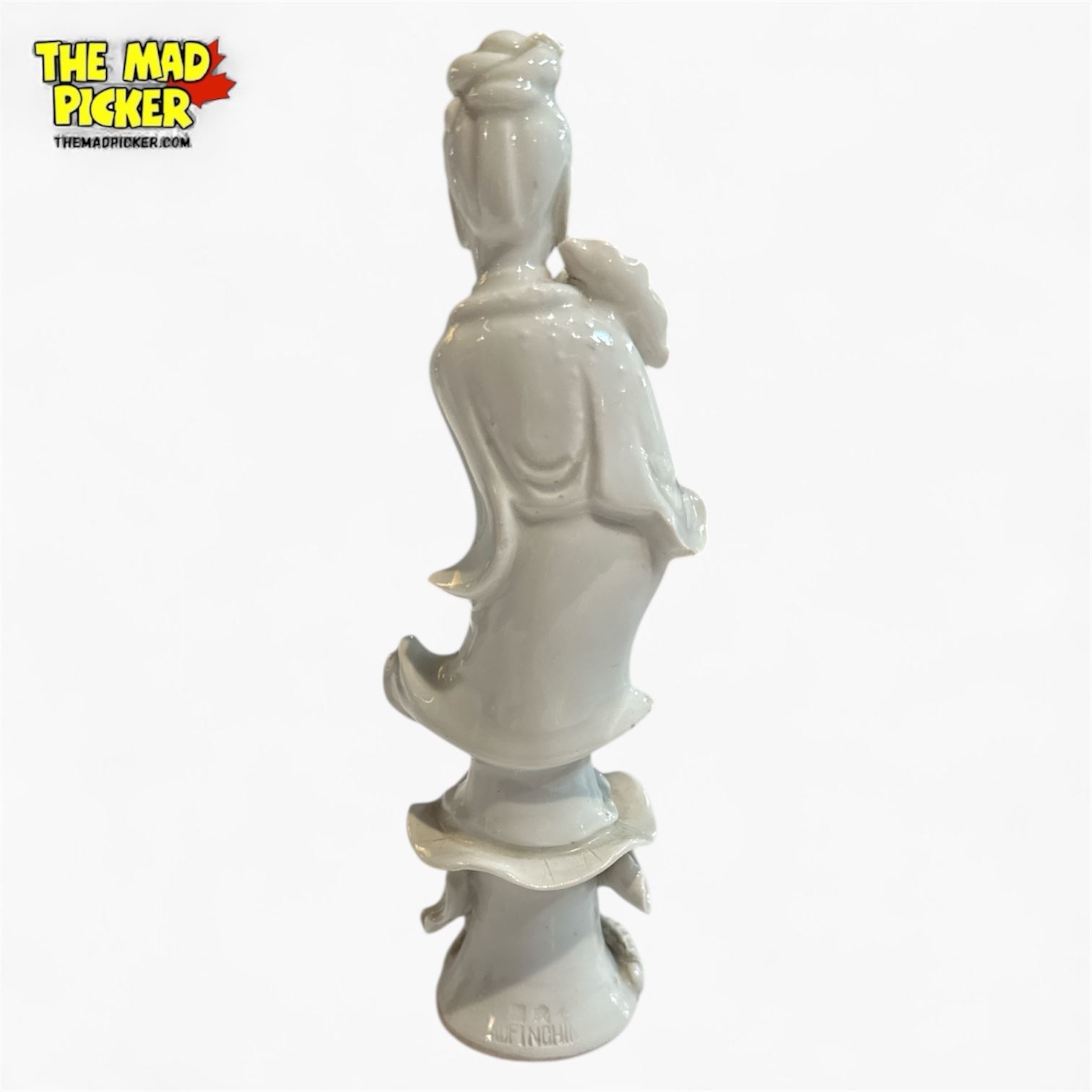 Chinese porcelain Dehua Blanc De Chine Guanyin statue from the Qing Dynasty. Measures 7 inches in height. Made of white-glazed porcelain characteristic of Dehua craftsmanship. Statue depicts the revered Guanyin. Displays damage, including a broken hand and surface chipping.