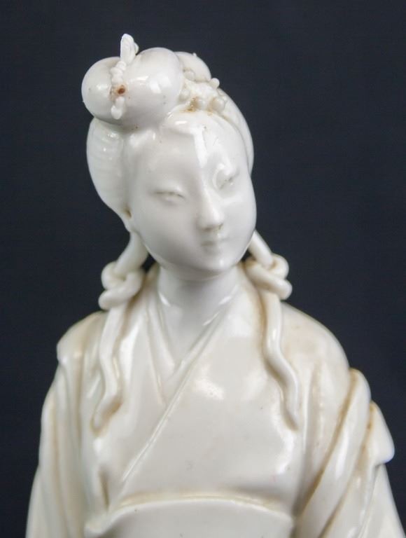 Chinese dehua porcelain. Of white tone. Of a woman carrying a basket with fish. 15 x 4 cm. 88 grams.