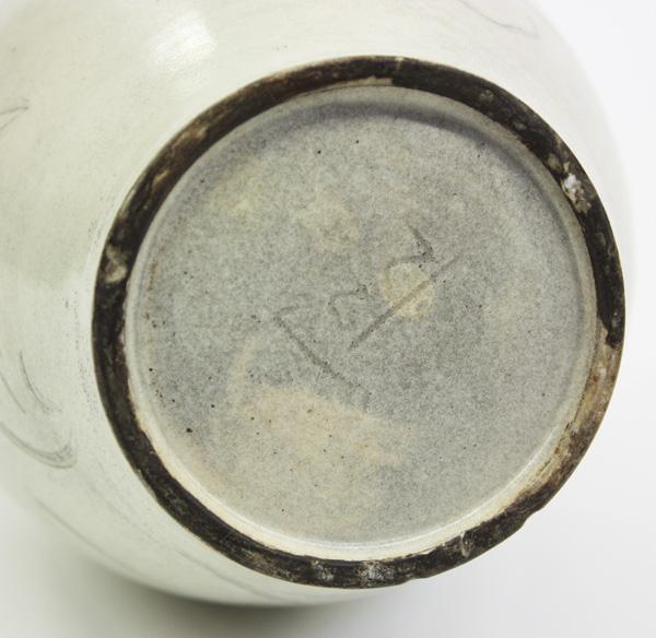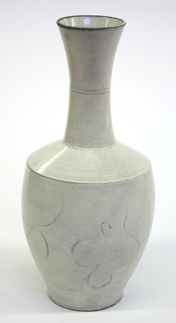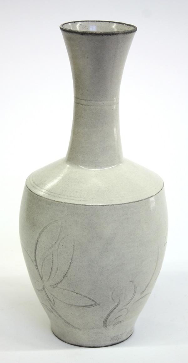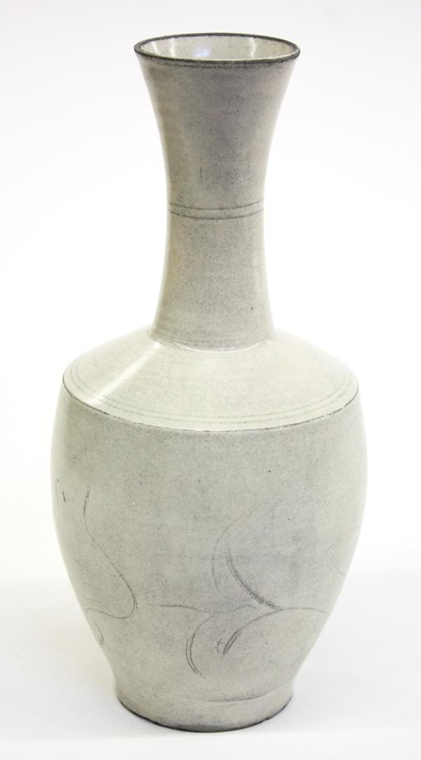 Chinese Ding ware style white glazed stick neck vase, with a slightly flaring neck above a prominent shoulder, the tapering body incised with stylized lotus, the recessed base incised 'guan', 11.2''h