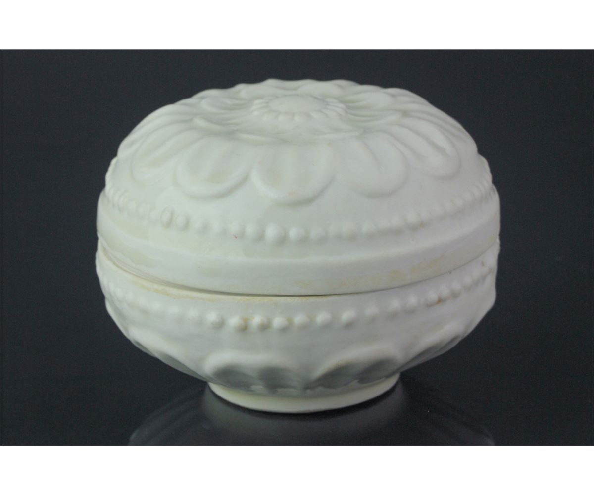 Chinese Dingyao white porcelain cosmetic box; featuring low-relief carvings of lotus petal on cover and body; H: 7 cm, D: 9.5 cm, 180 grams