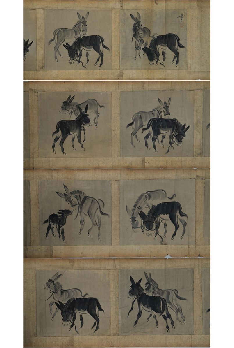 Donkeys, long hanging scroll, Chinese ink on paper, signed and sealed Wang Jian. 31 cm x 310 cm. Property of an Ottawa Estate