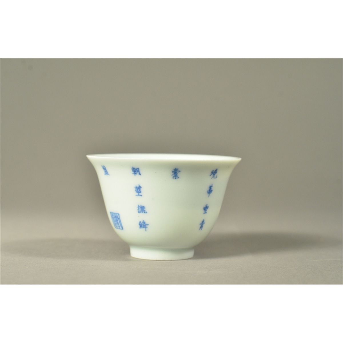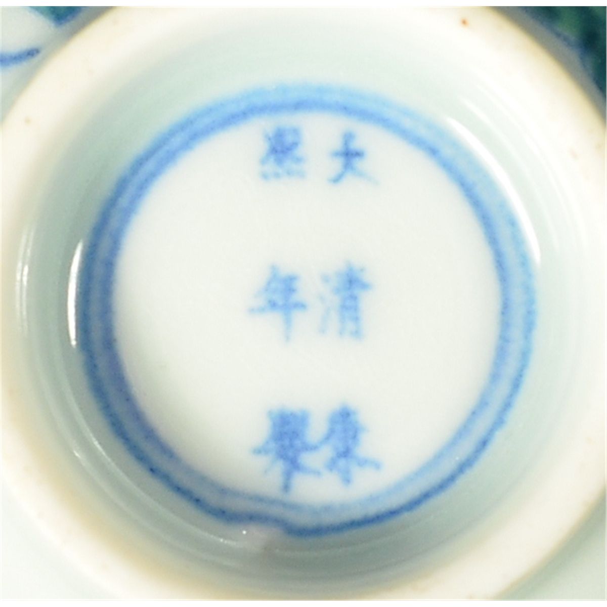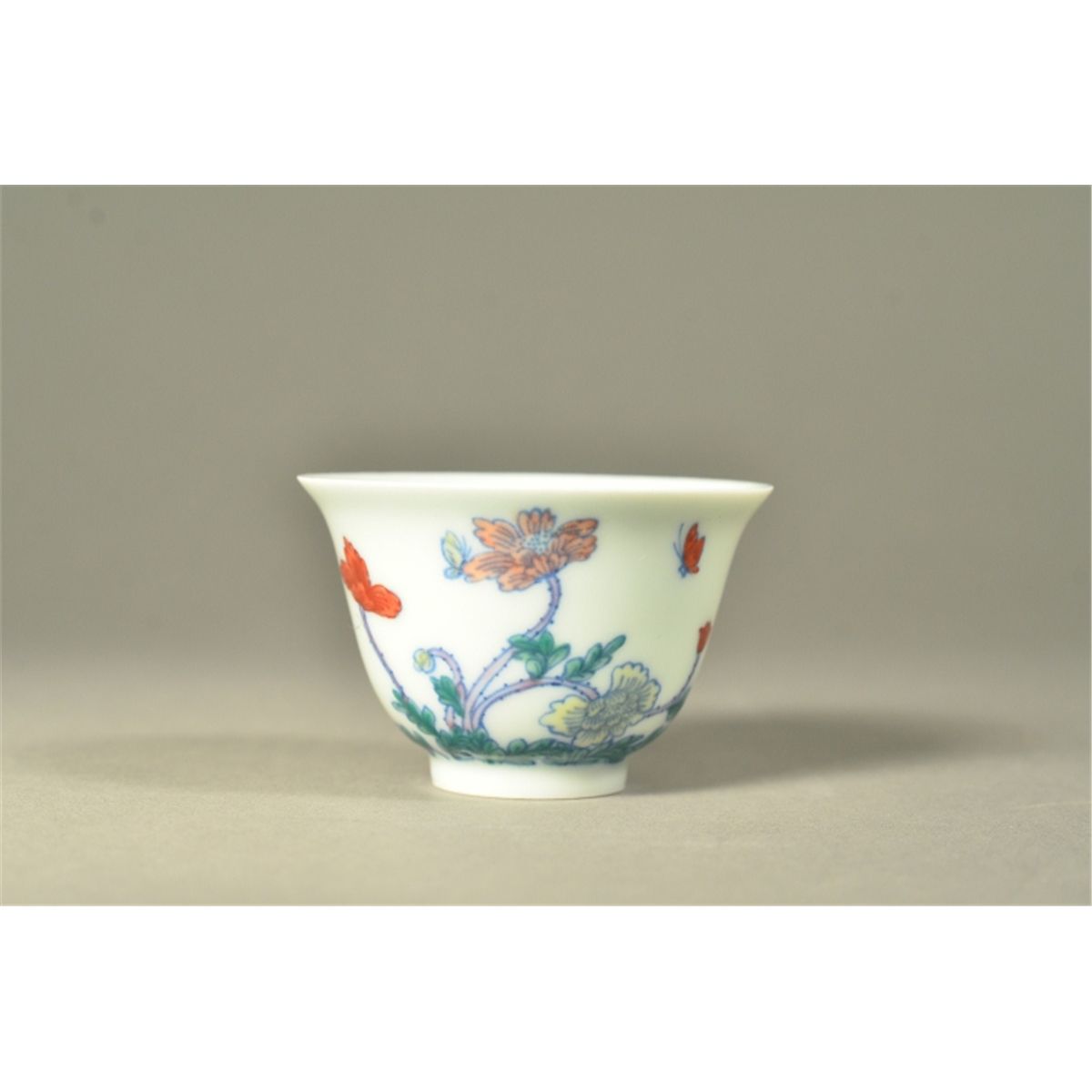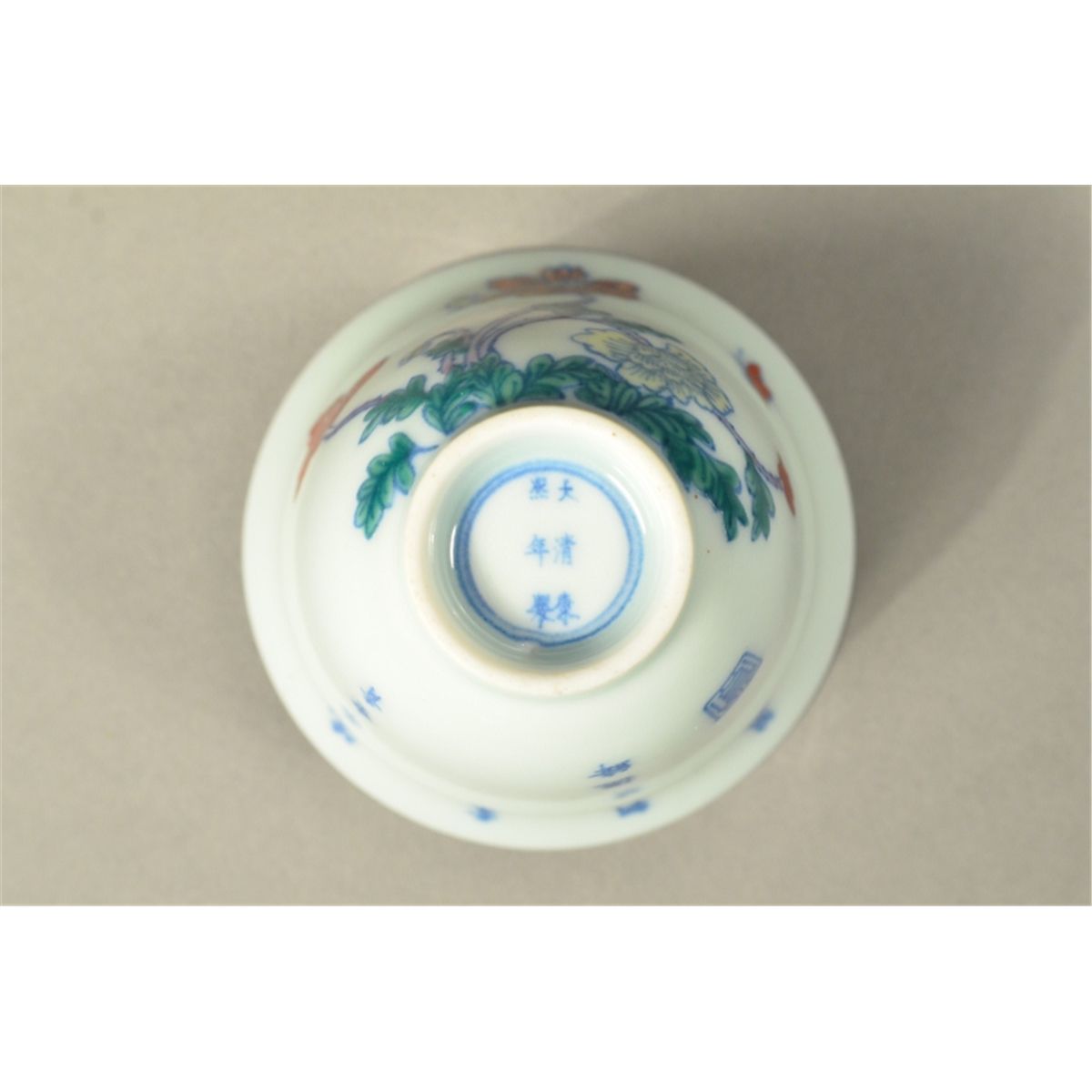 Chinese Doucai enameled porcelain tea cup; lotus motif supported on short foot rim; six-character Kangxi Mark; 2 1/2" diameter, 1 3/4" tall