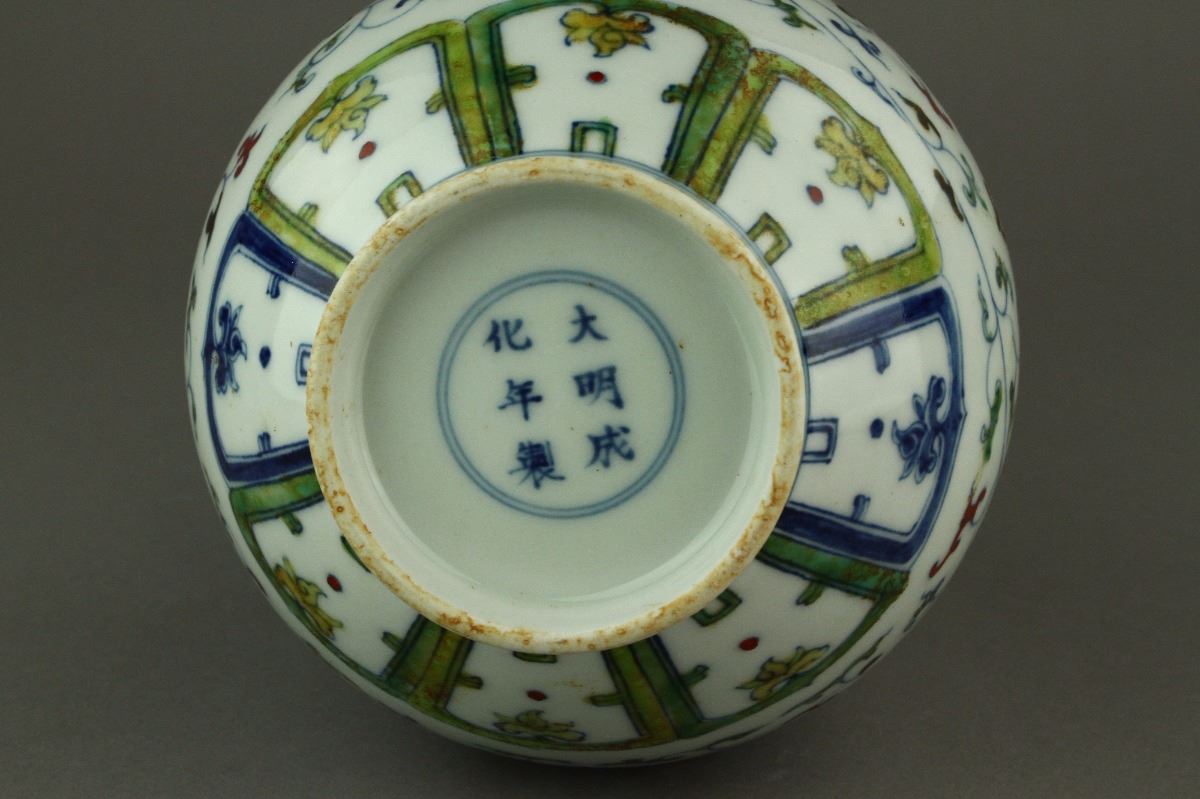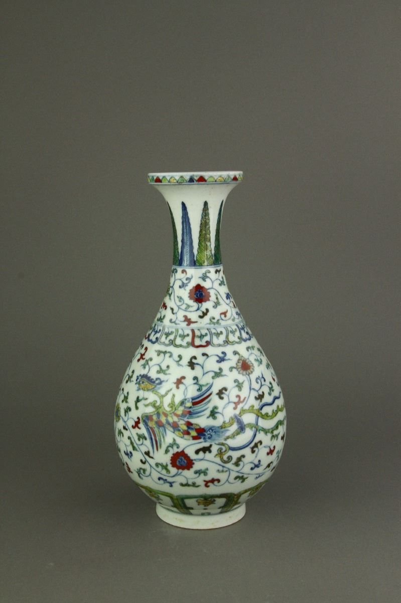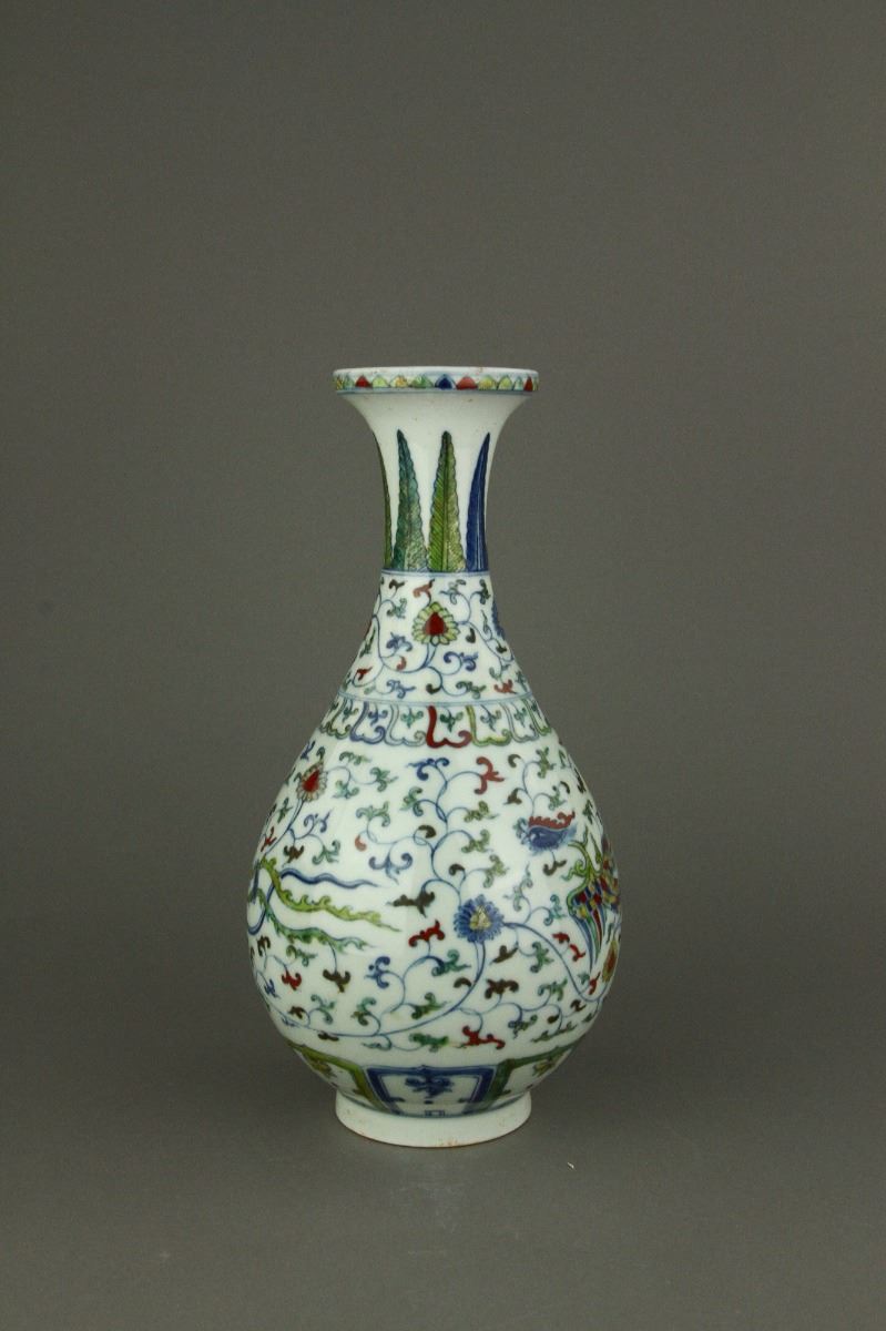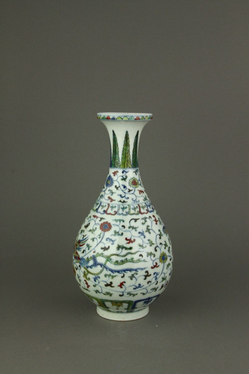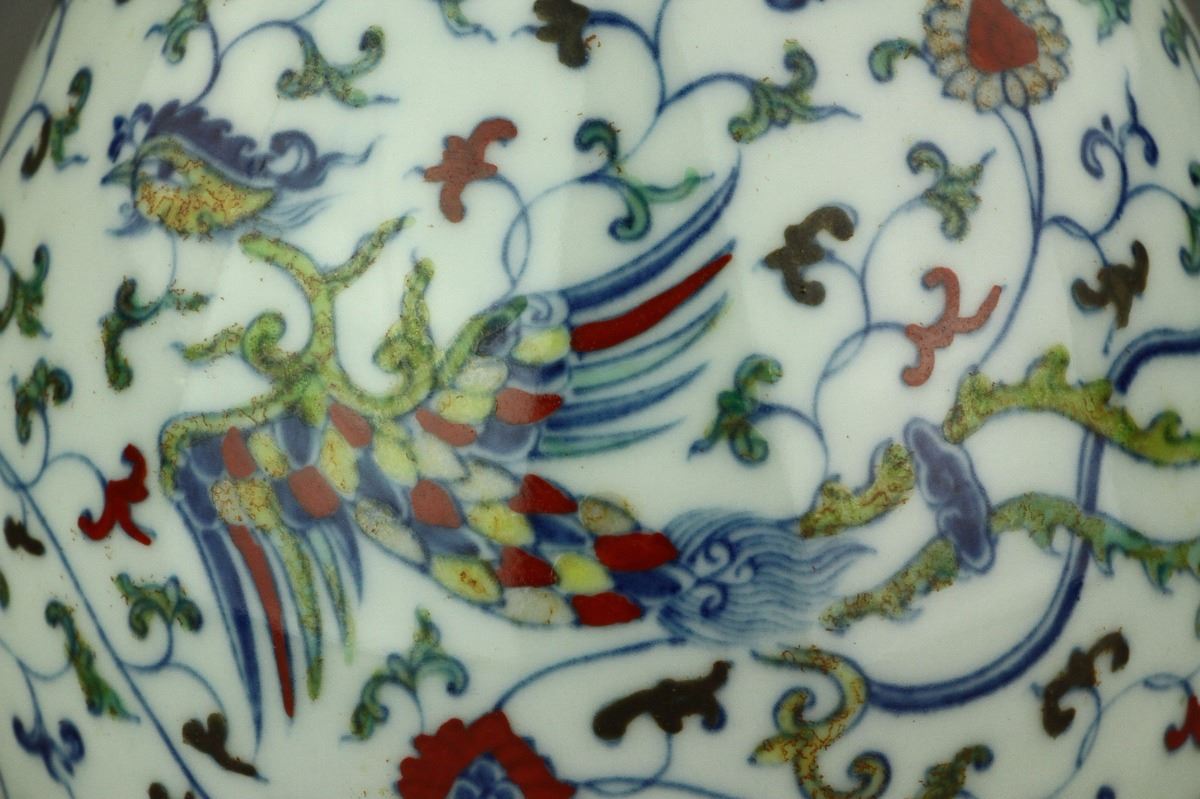 Chinese Doucai porcelain vase; of pear-shaped body with galleried rim; decorated with phoenix amidst chrysanthemum scrollwork; six-character Ming Chenghua mark on base; H: 28 cm, D:15 cm, 732 grams