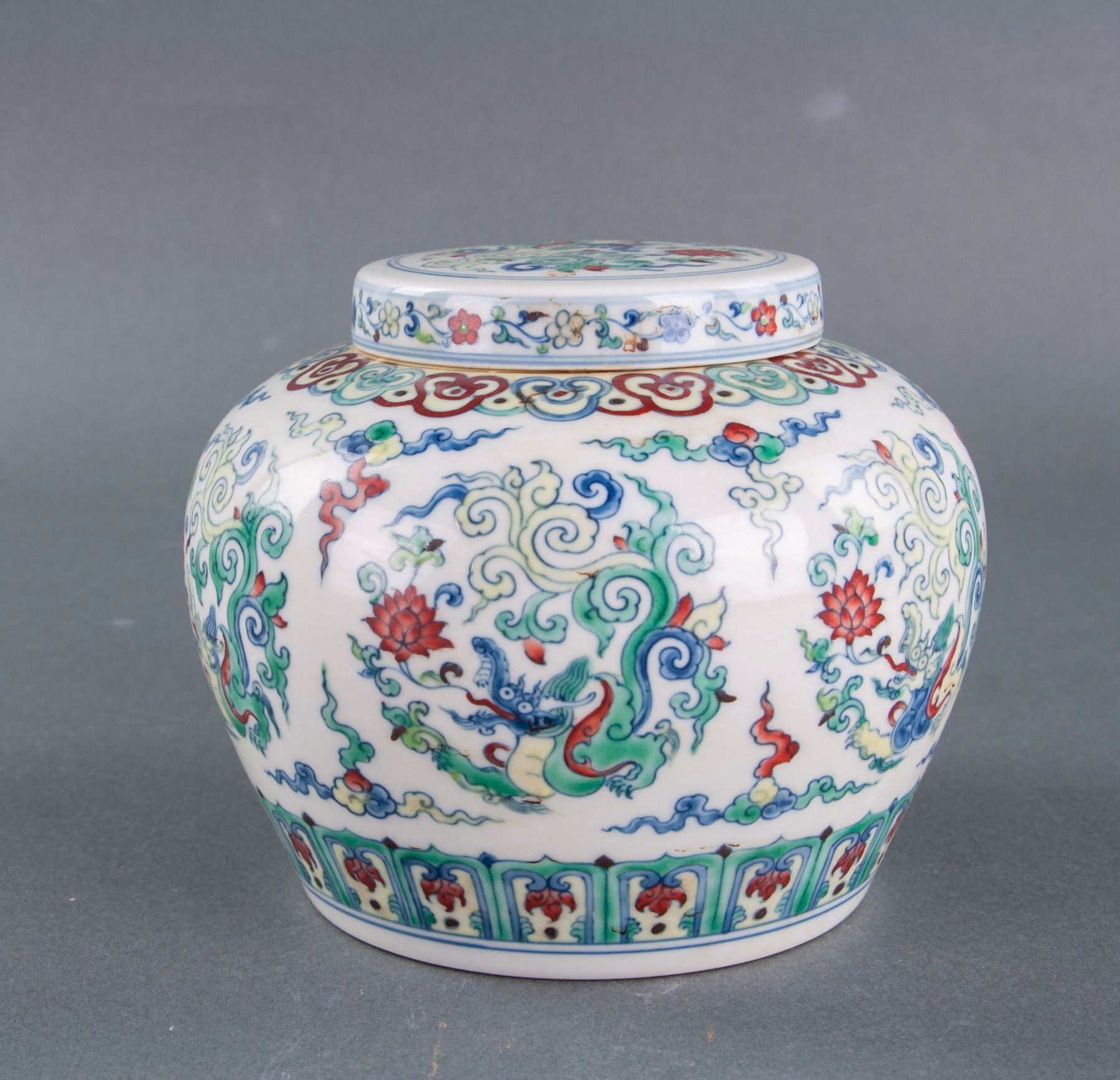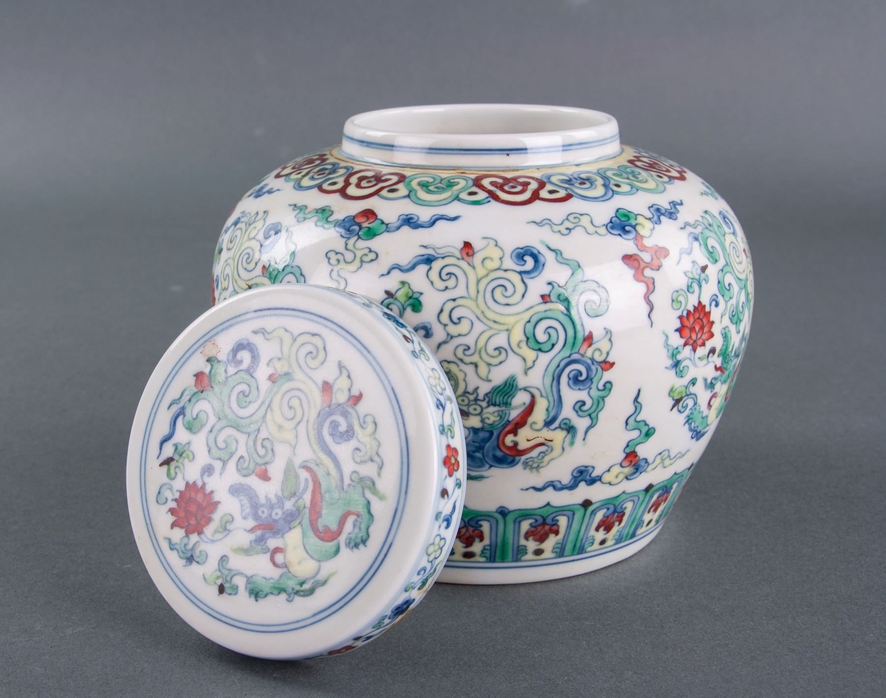 Chinese doucai porcelain jar; of globular body, tapering to bottom; with round flatten cover; painted dragon and lotus; decorated with floral and leafy pattern; six-character Chenghua mark on base; 13 cm x 16 cm, 704 grams