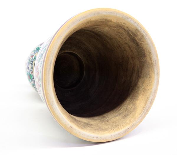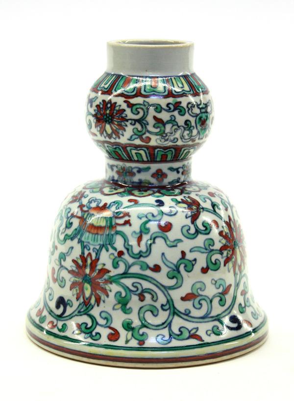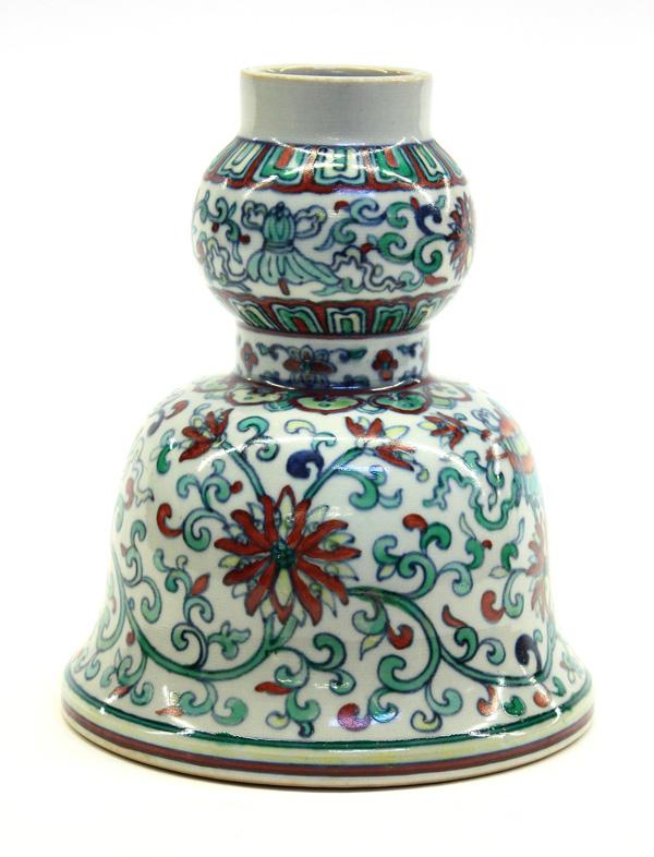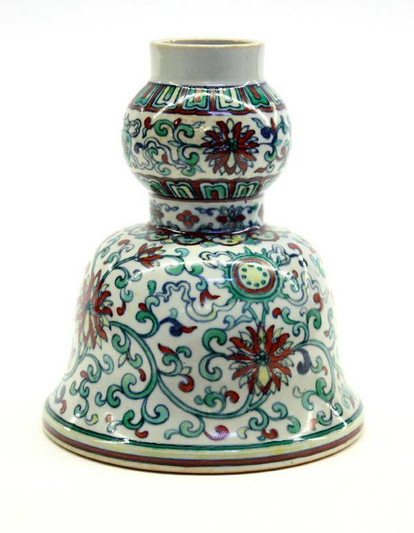 Chinese doucai decorated porcelain stand, shaped with a bulb above an inverted bell form and decorated with stylized lotus tendril sprigs alternating with Buddhist emblems, 8''h