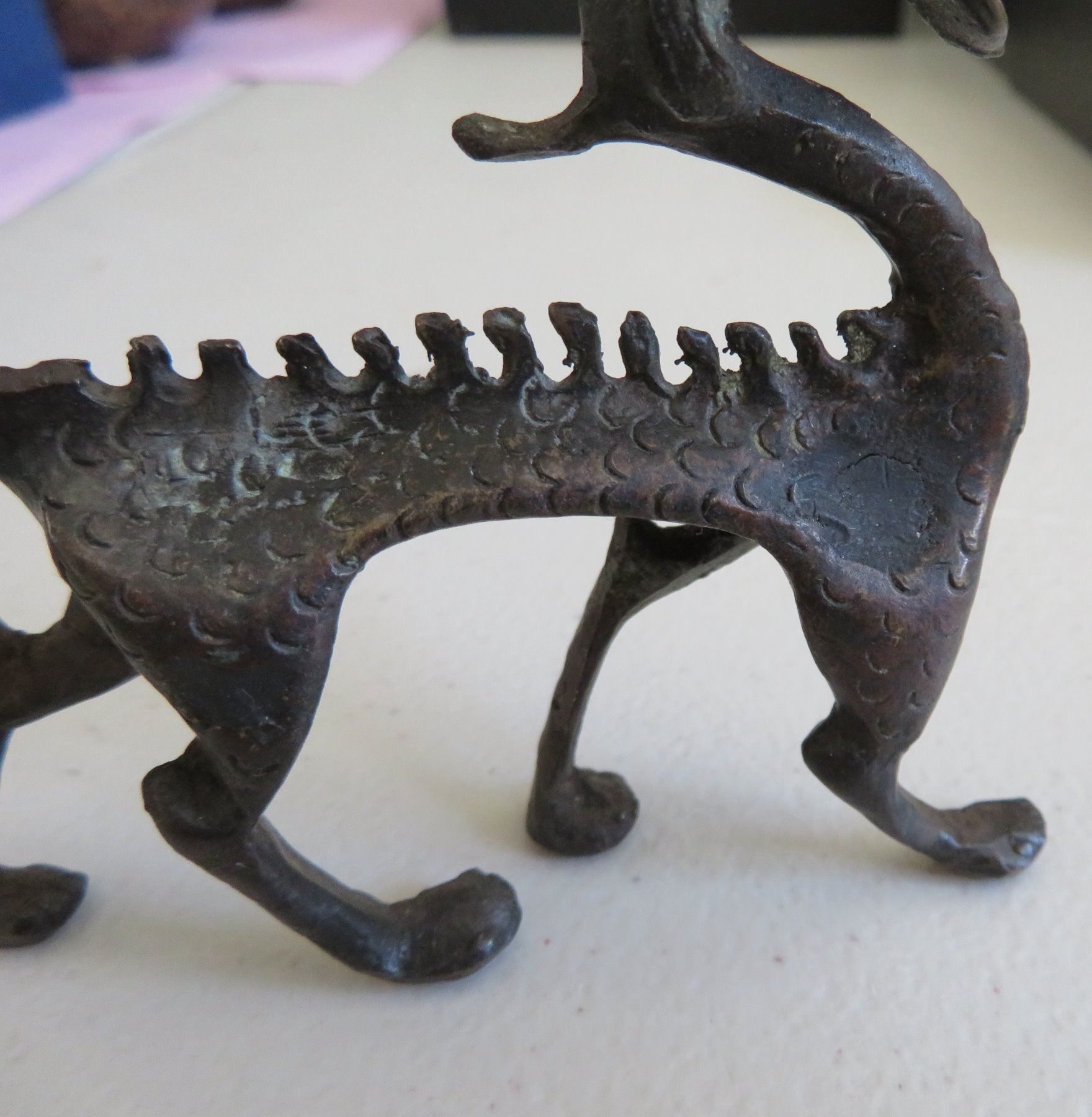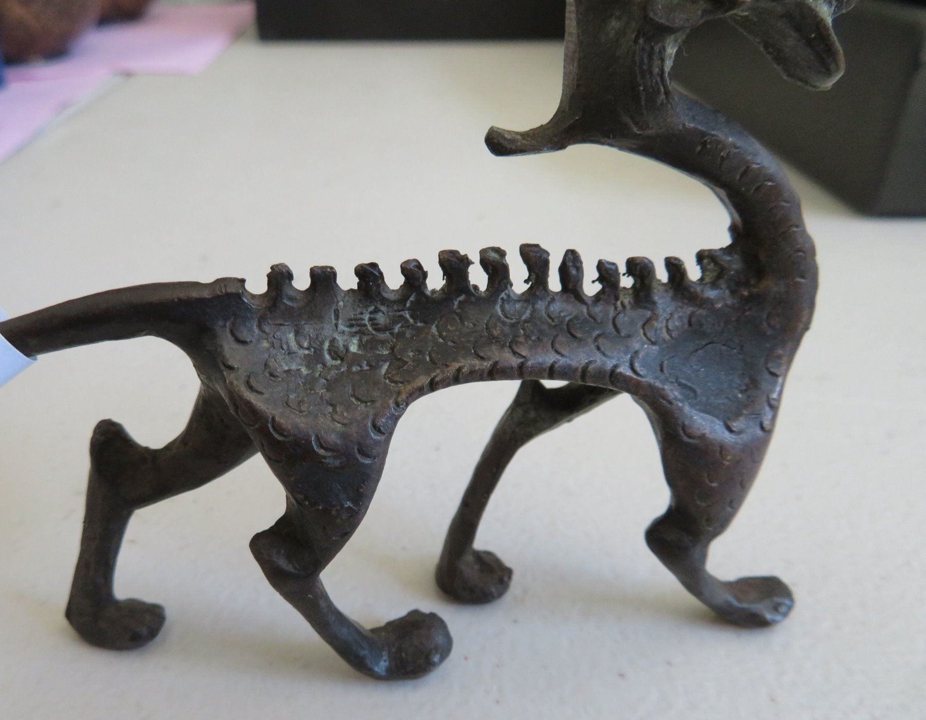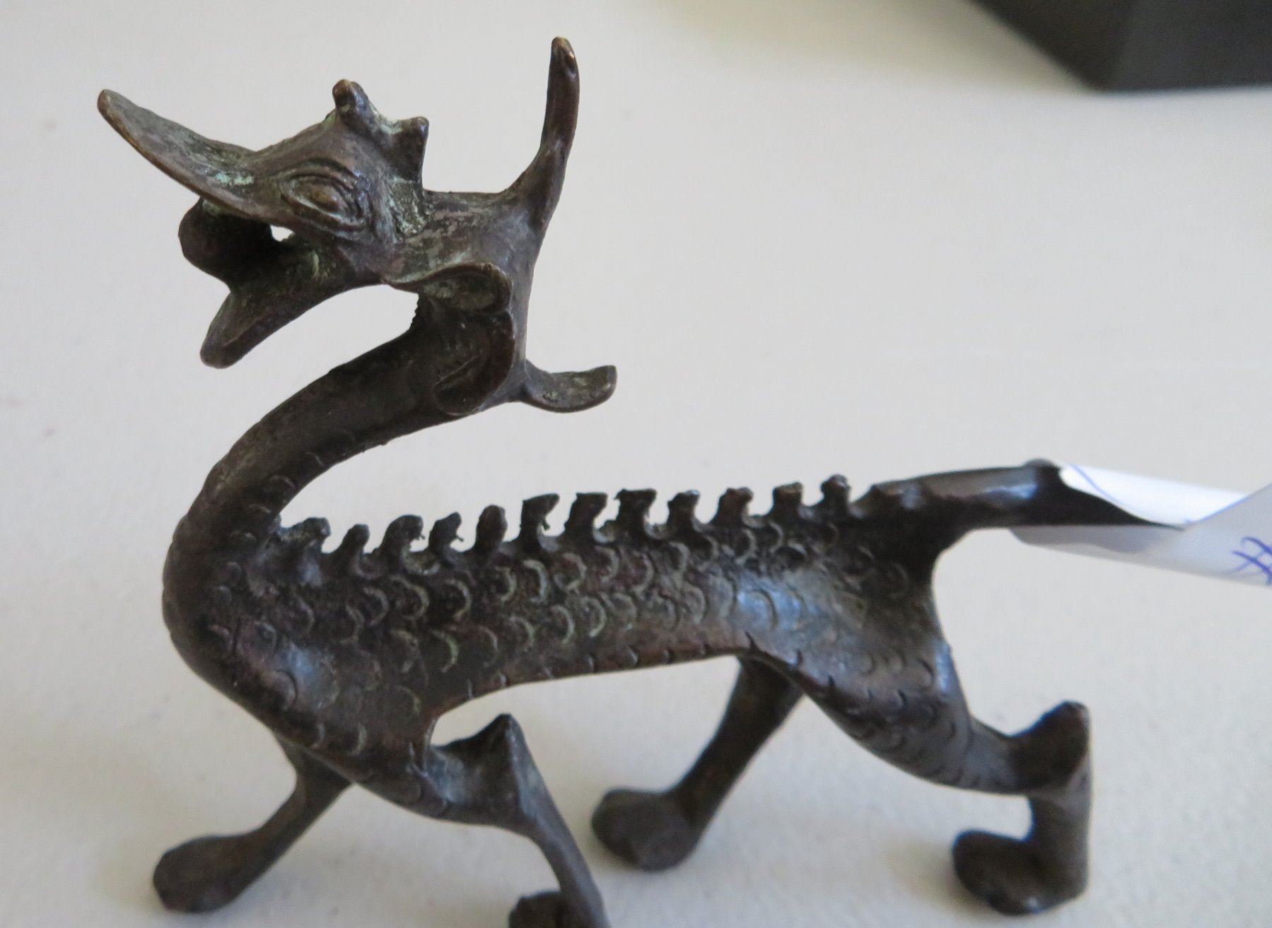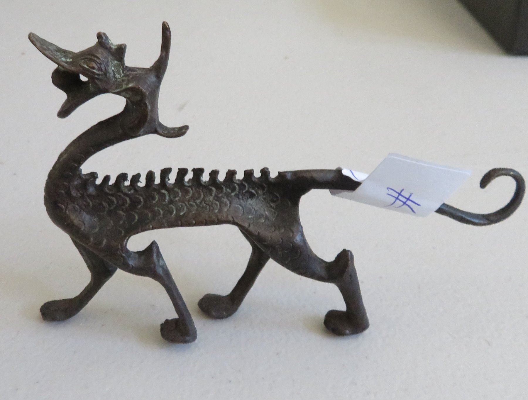 Dragon Figure, early Han dynasty. Made of bronze, the item measures 6" x 4" x 1". China. Condition: Nice patina, see images. Shipping: $25.50 w/insurance and signature, double-boxed, due to value.