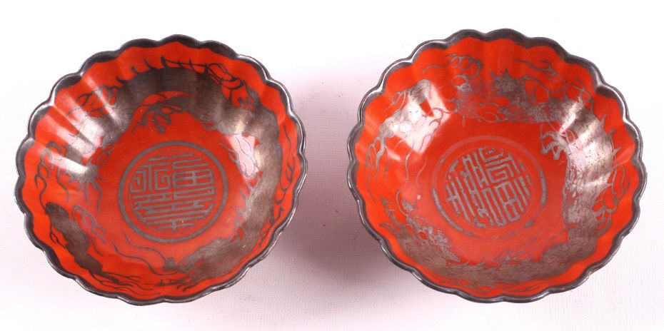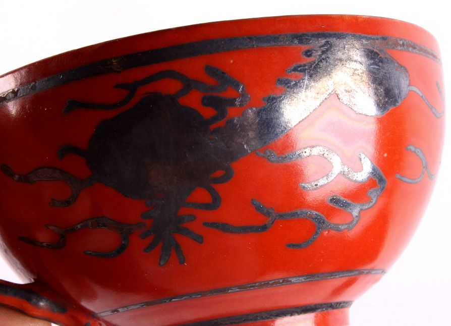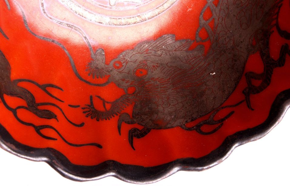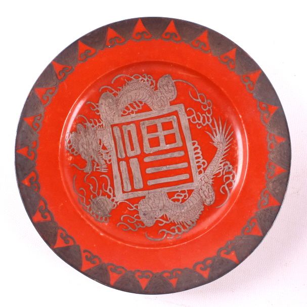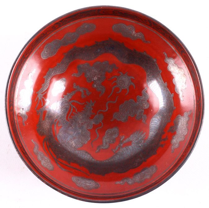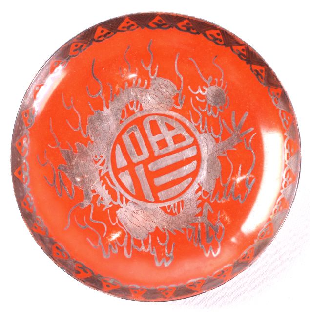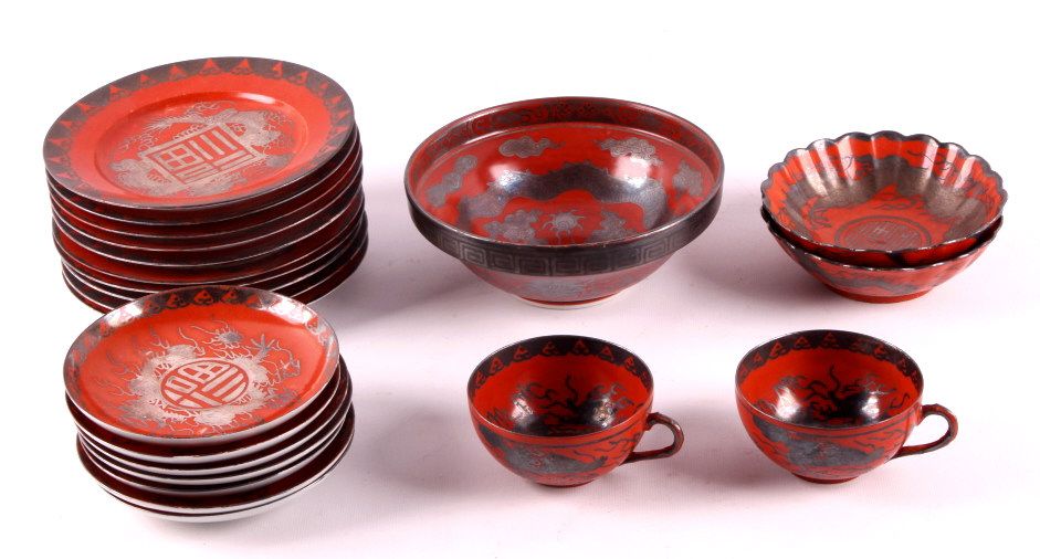 This is a collection of dragon ware dishes. Included 2 teacups, 7 saucers, 10 small plates, and 3 bowls. Each piece has a dragon design. The bottom of each is marked with Chinese characters.
