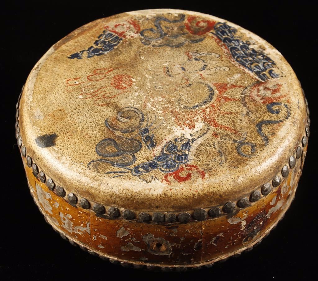 Wood construction with hide covered sides which are hand painted with a rooster. Shows age and use, scattered losses to paint.