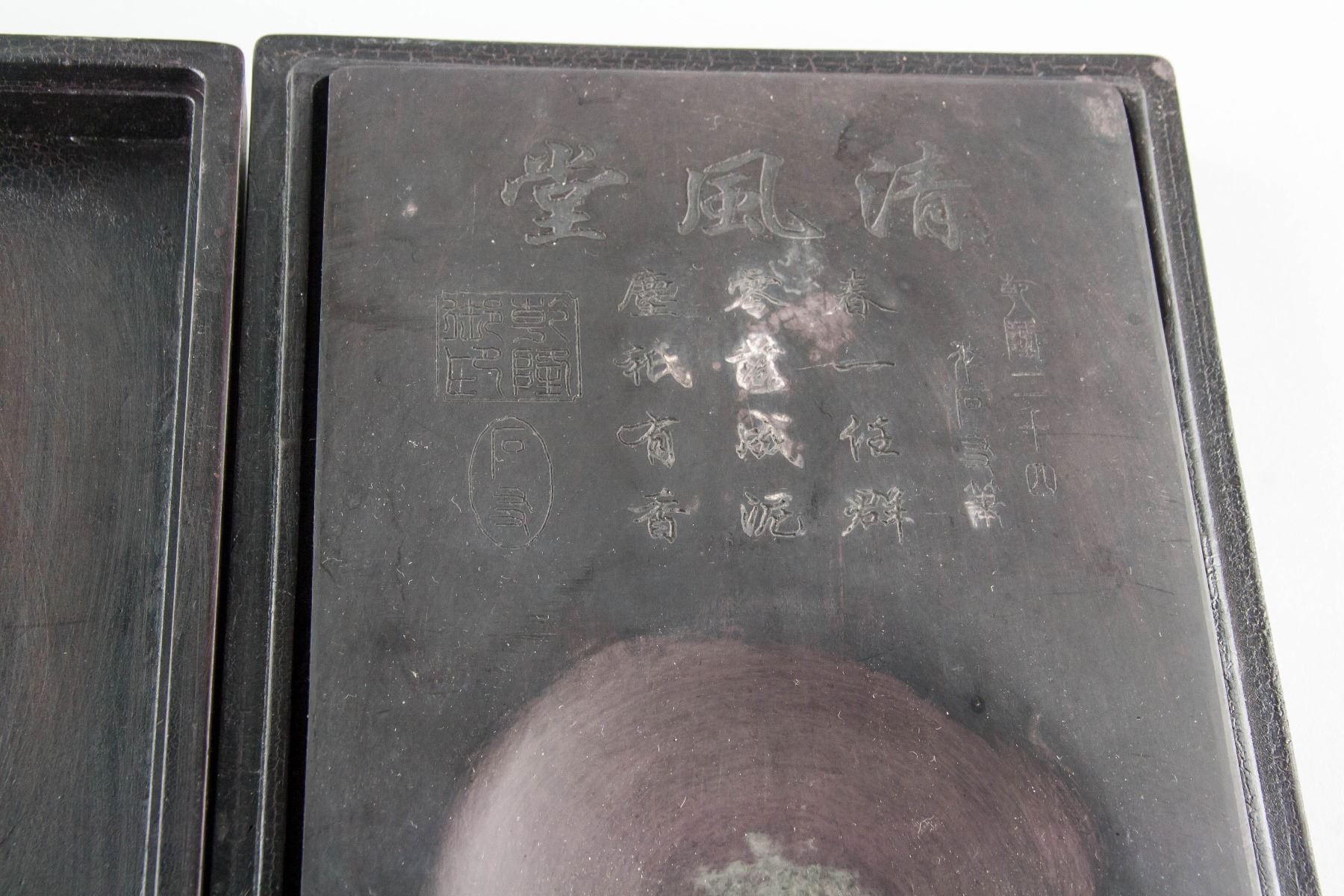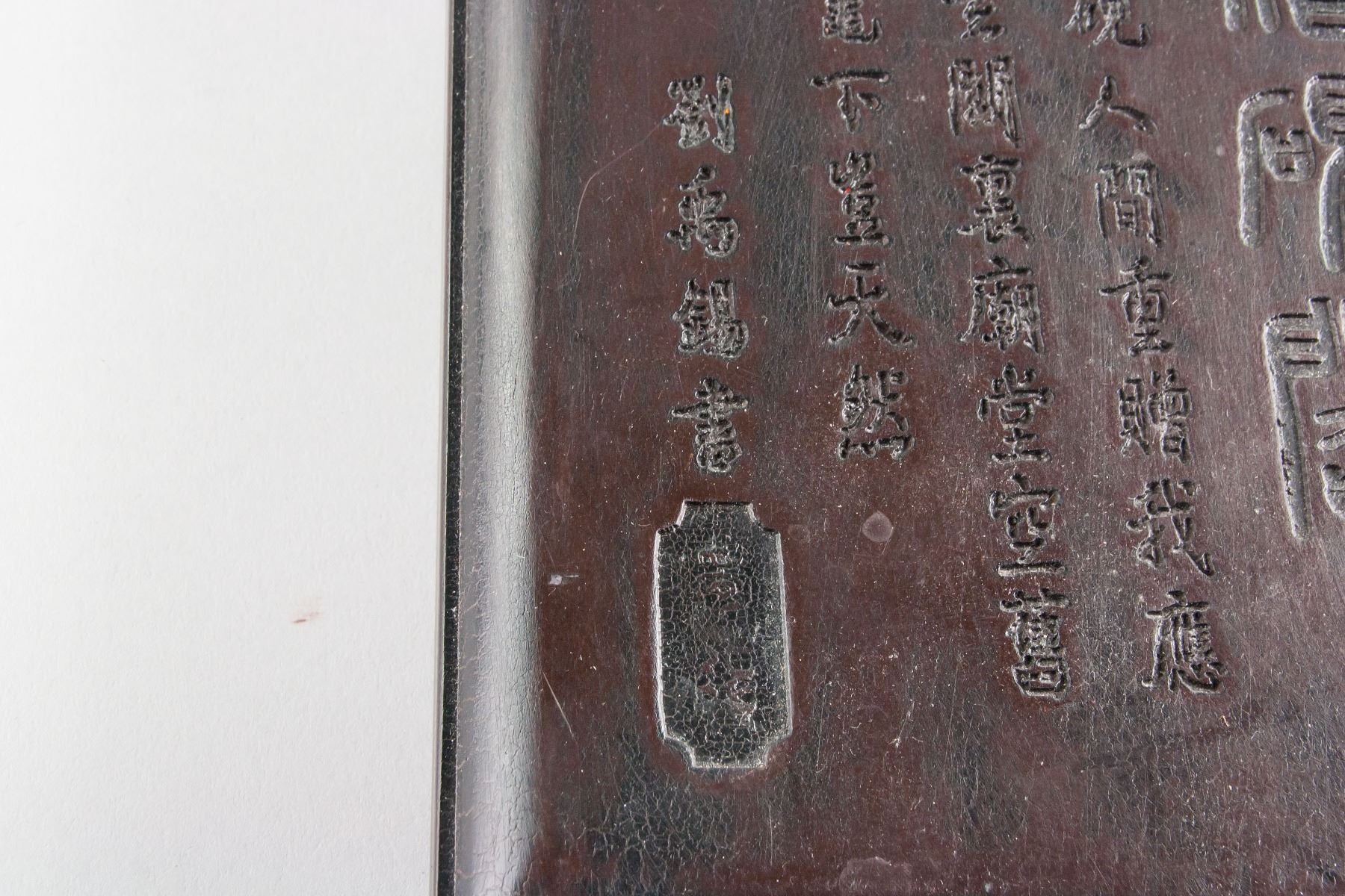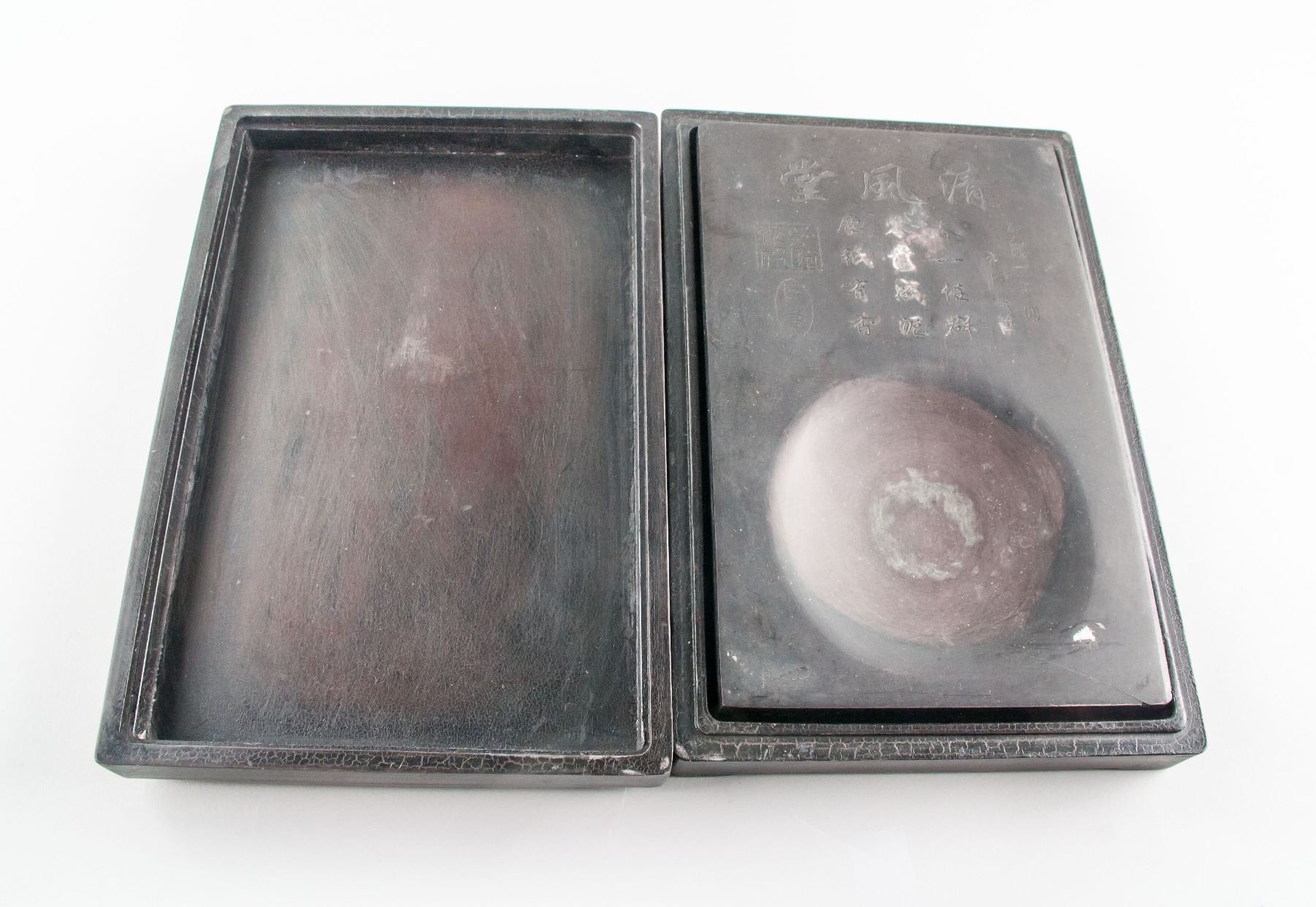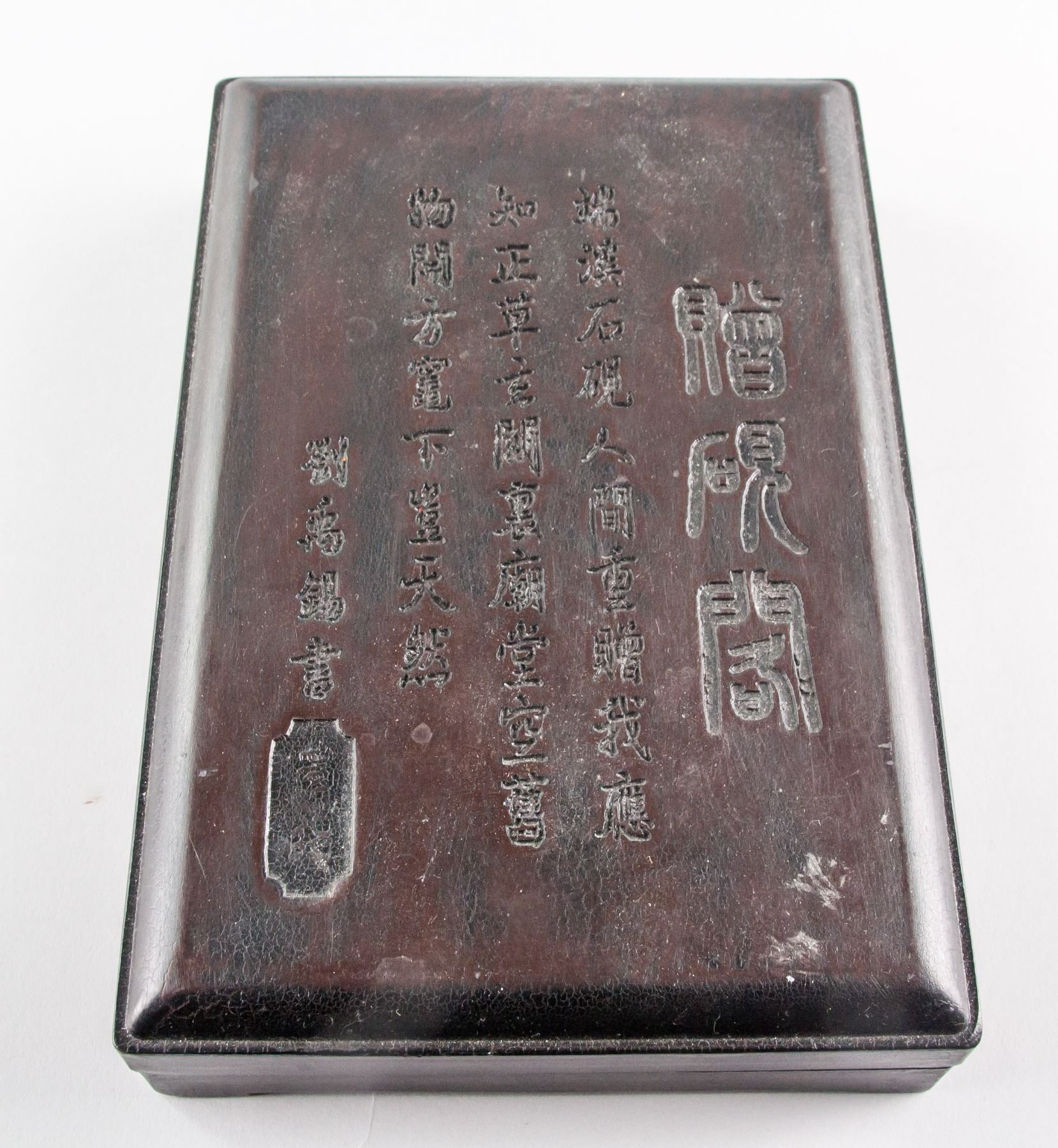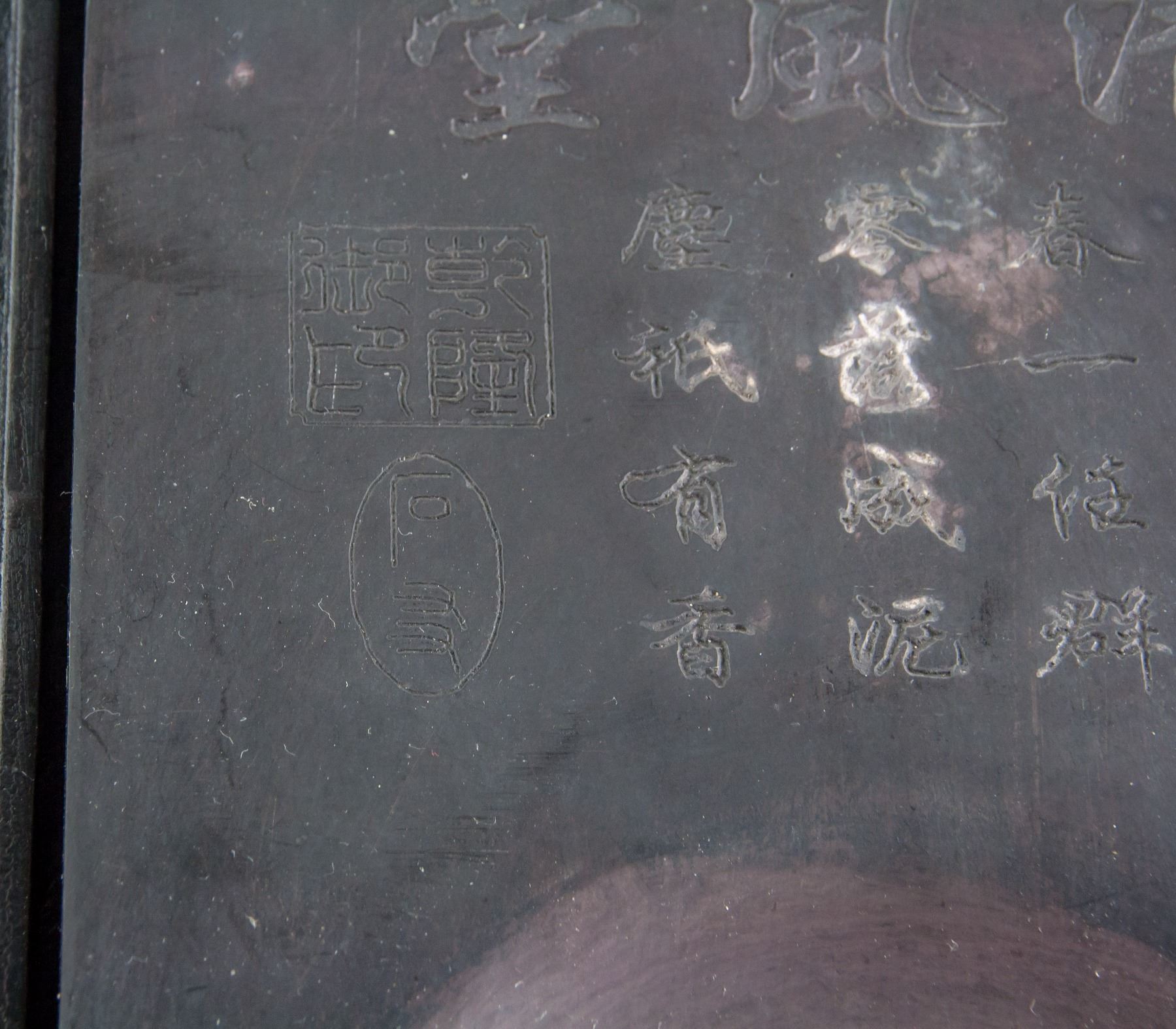 Chinese Duan ink stone; of rectangle shape; carved Qing Feng Tang, with Qian Long Yu Zhi mark; with wood case; cover carved Zeng Yan Ge, signed Liu Yuxi (772-842); 25.5 cm x 17 cm, 3355 grams