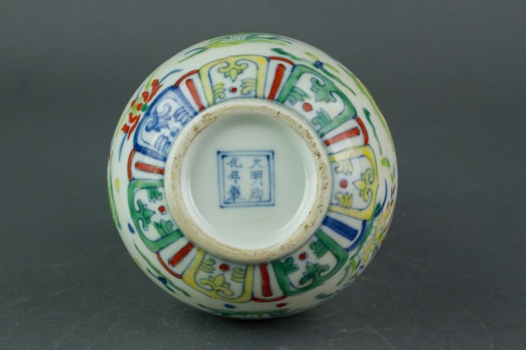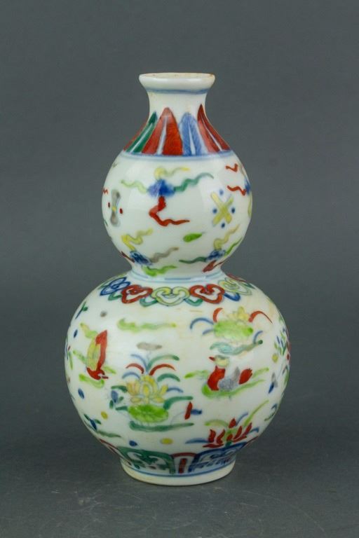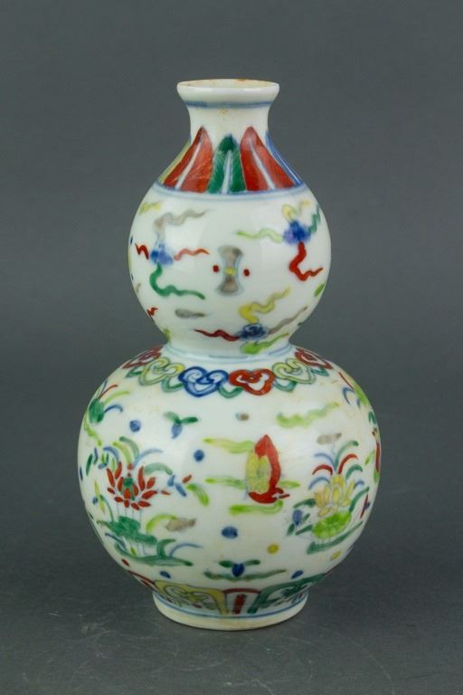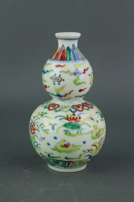 Chinese Doucai porcelain vase; of double gourd form; the exterior painted with pair of mandarin ducks on lotus pond; six-character Chenghua mark on base; H: 18 cm, W: 9 cm, 239 grams