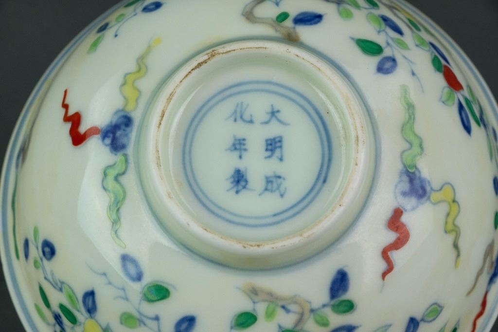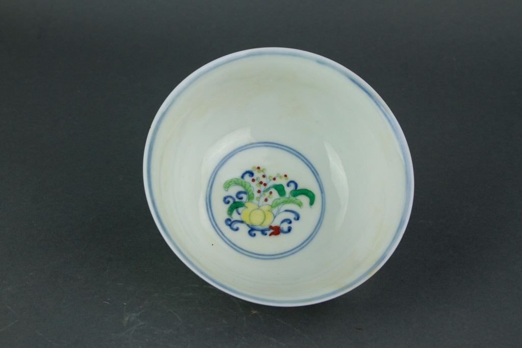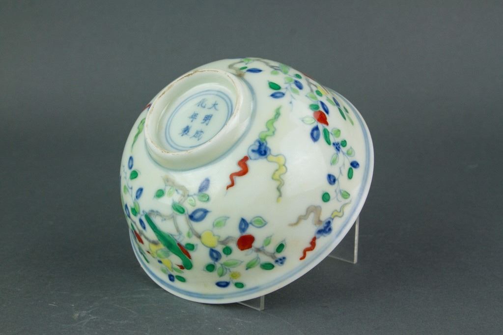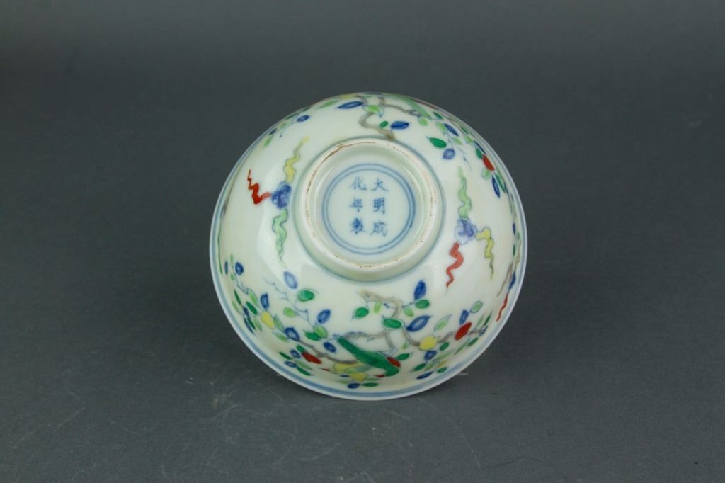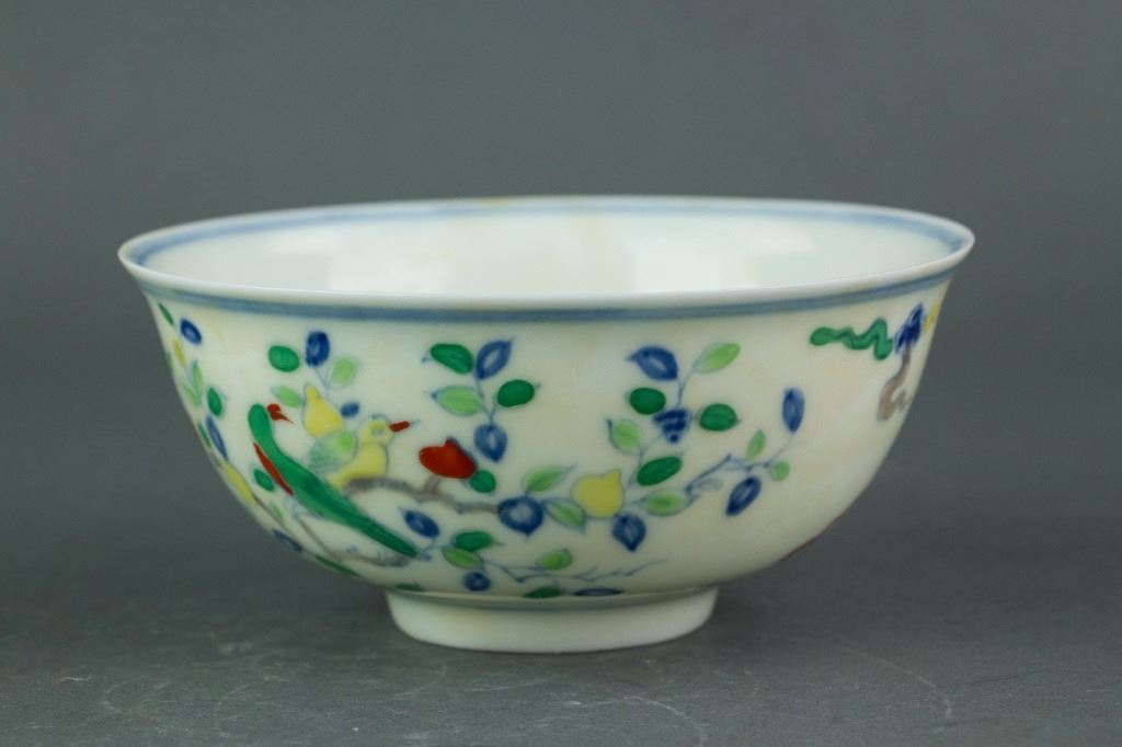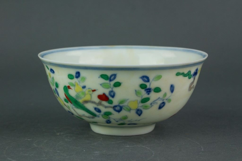 Chinese Doucai porcelain bowl; of rounded sides with short foot rim; the exterior painted with birds perching on peach branches; six-character Chenghua mark on base; H: 5.2 cm, D: 12.6 cm, 140 grams