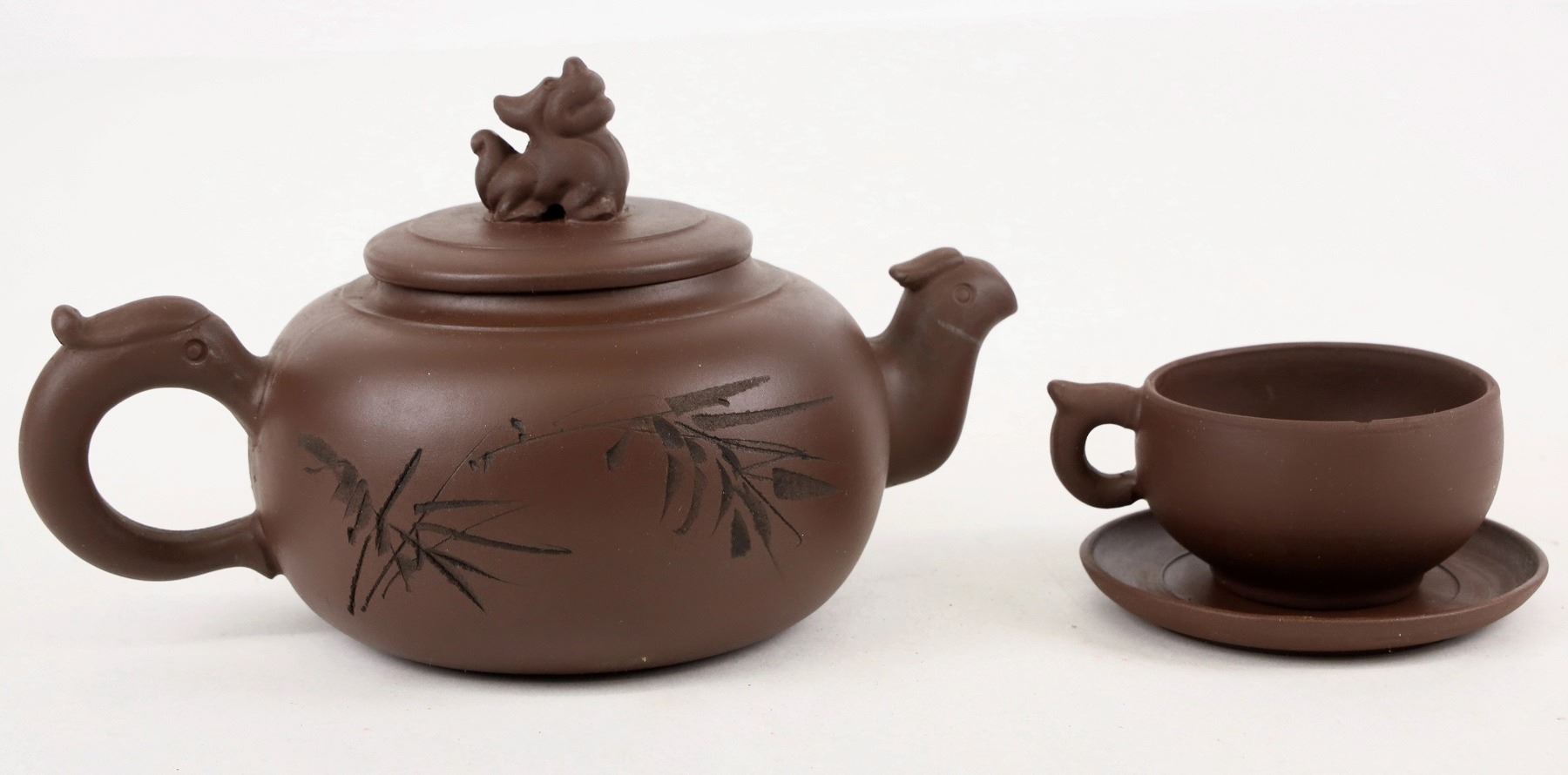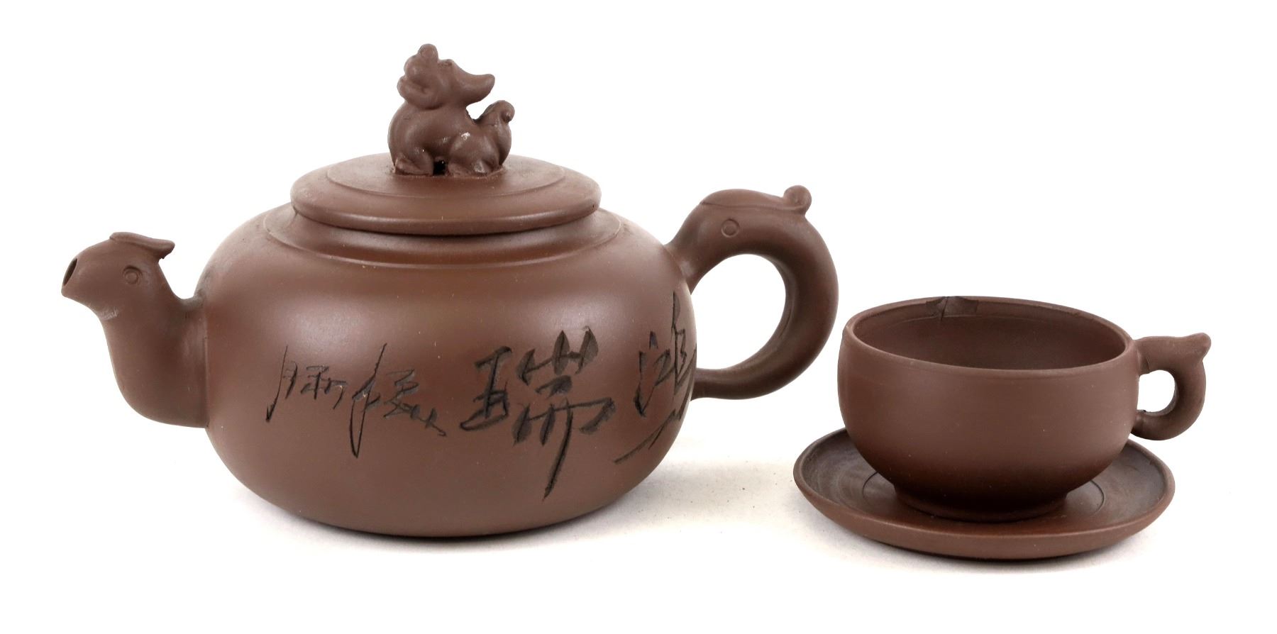 Chinese Earthen Tea Set, 4 cups and small pot, modern in original box, but the box is in poor condition, the contents unused and new.