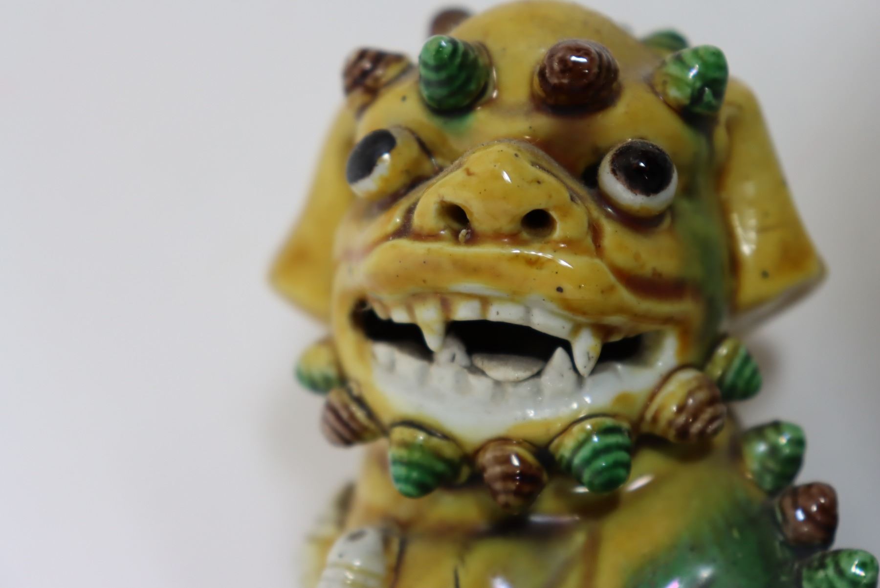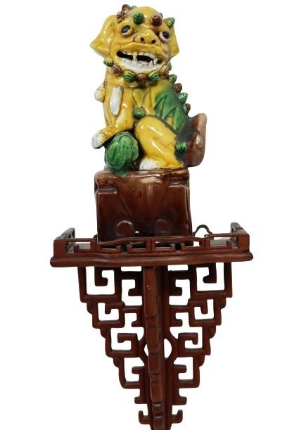 Chinese egg and spinach glaze foo dog sitting on a hardwood open work wall bracket.