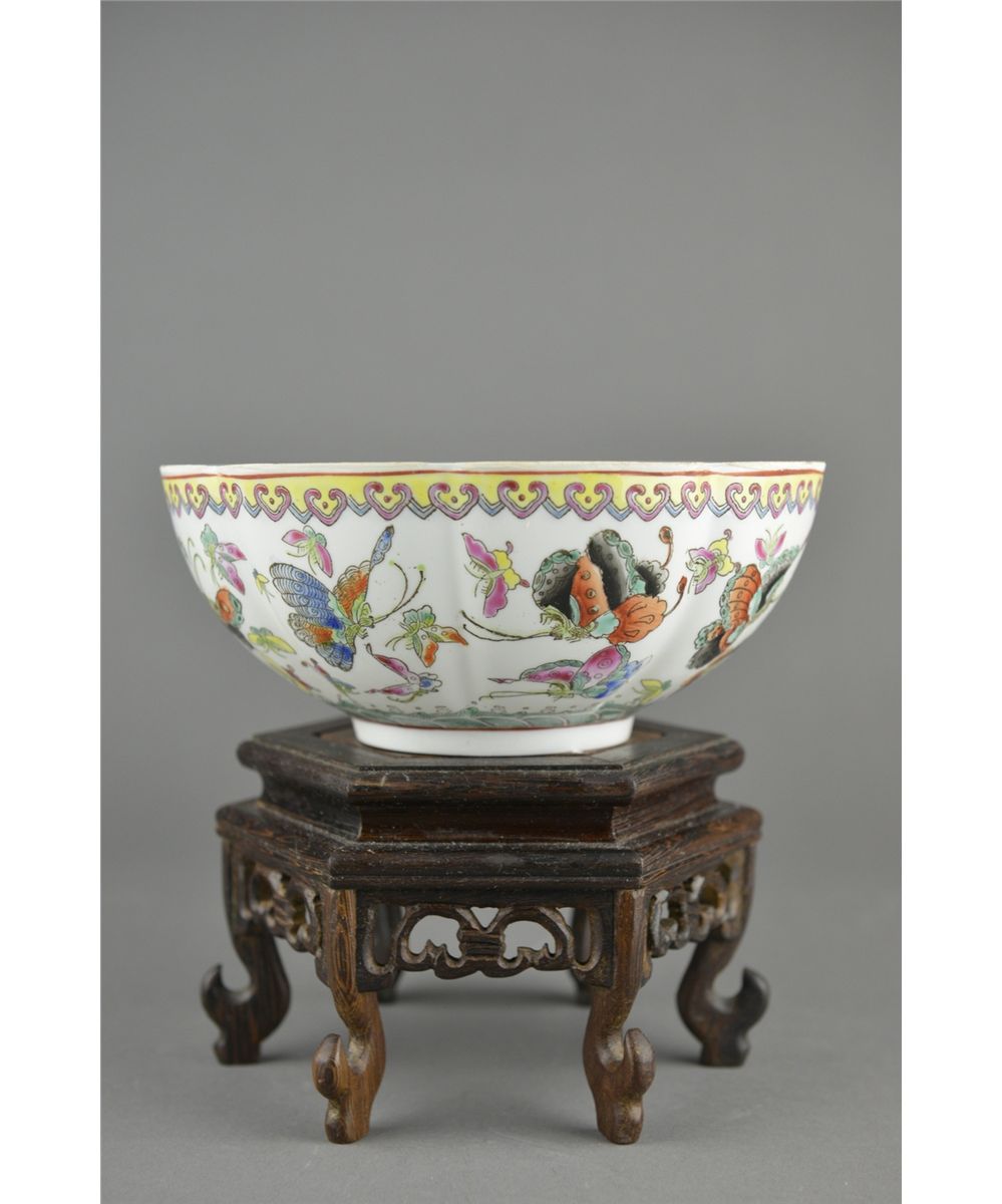 Chinese eggshell porcelain bowl; foliate-shaped bowl and of deeply potted form featuring auspicious butterflies underneath ruyi-head scroll; the interior featuring a five-toed dragon with a pearl at the centre; six-character mark on base; D: 18 cm, H: 7.75 cm. Provenance: Lau Collection Hong Kong 1970's