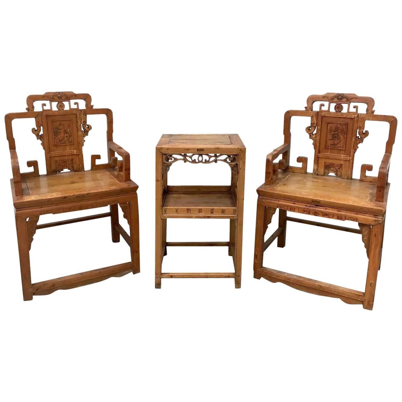 Chinese Elm Wood ArmChair Pair And Table Qing It was created by skilled craftsmen in traditional style with fine handcrafts. the handwork is very fine with incredible detailling. This is a great piece of valuable collection, a valuable personal alter or a very good present. Don't miss out this chance to get it .Good luck to you!