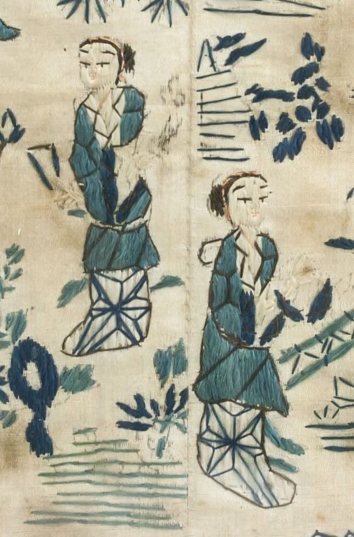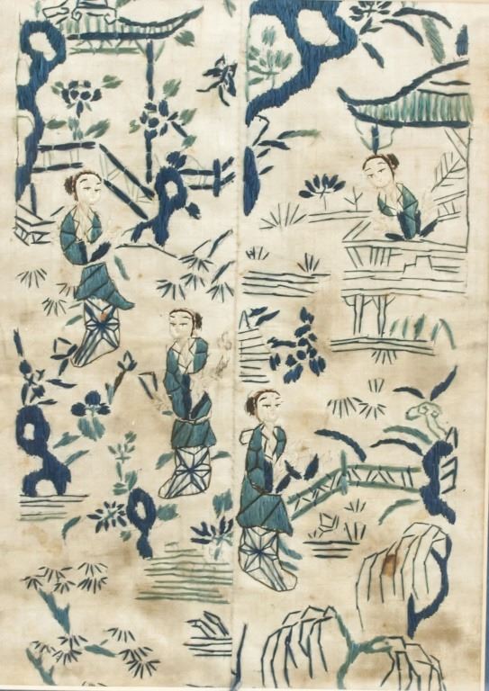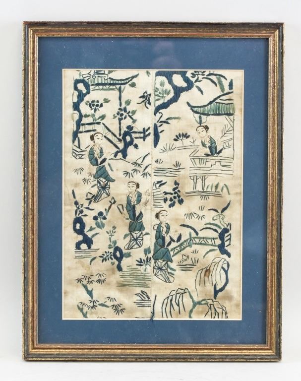 Chinese embroidery, framed. Featuring side by side scenes of the court. 24 x 18 cm (9.5 x 7 in), Frame: 34 x 25 cm (13.5 x 9.75 in).