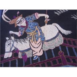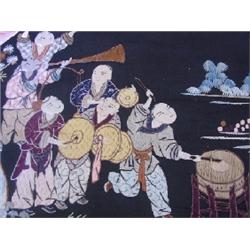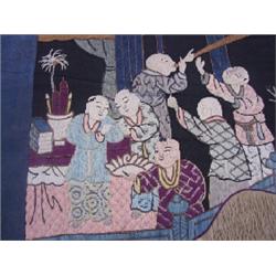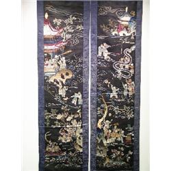 A pair of finely embroidered silk hanging scrolls depicting children in colorful costumes playing on a black background. Good condition with one having a slight tear to the background. China, Ching Dynasty. Panel Size: 60" (152.5 cm) x 13 1/2" (34 cm).