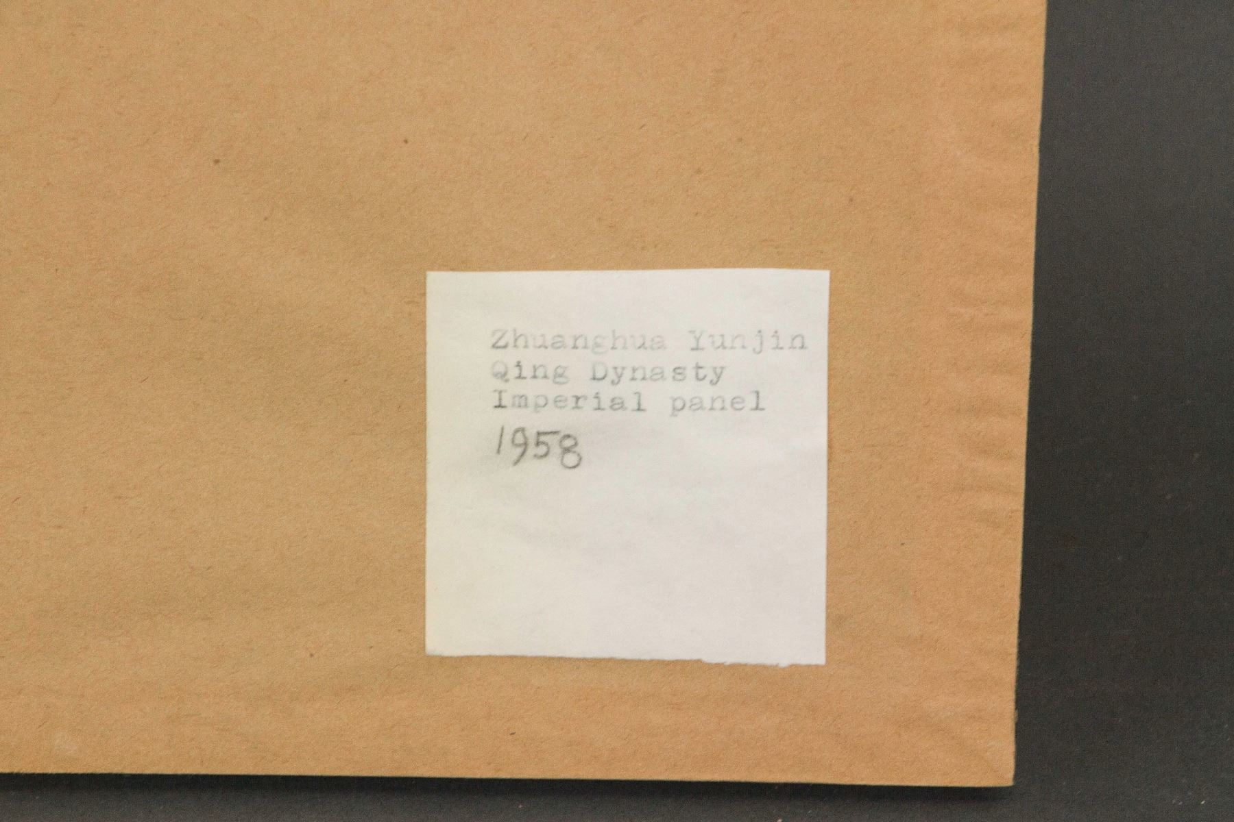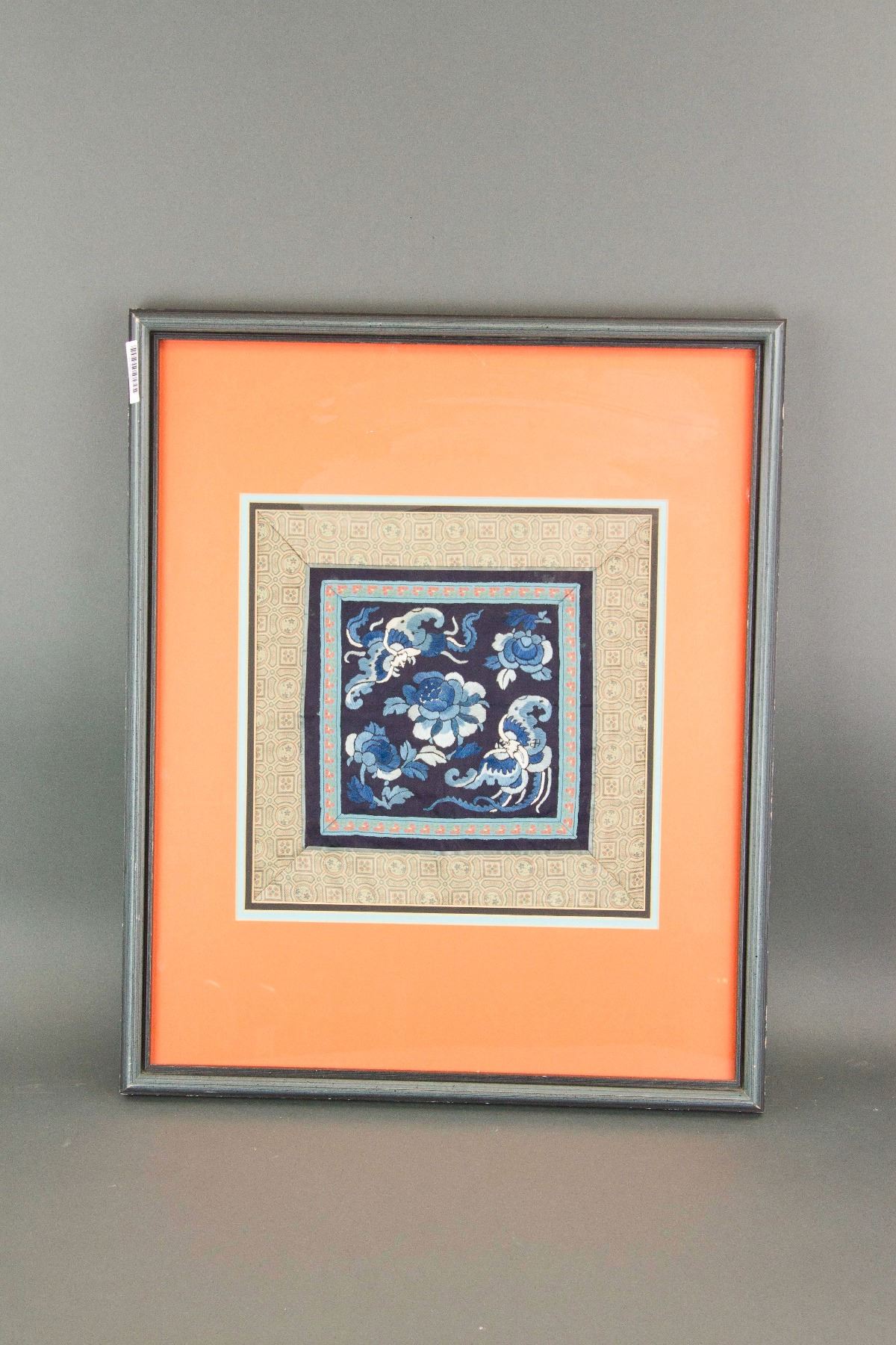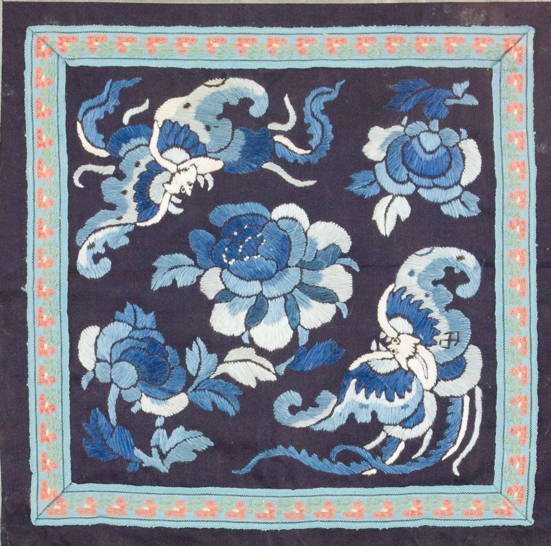 Chinese embroidery panel; of two phoenix flying around flowers; decorated with floral pattern edge; mounted with frame; Qing period; 58 cm x 47 cm