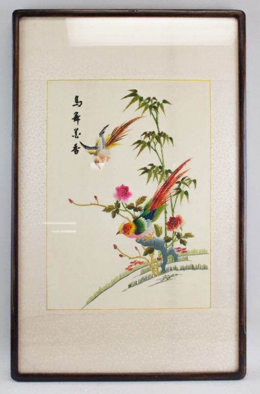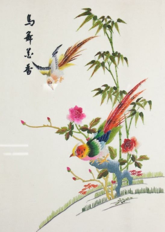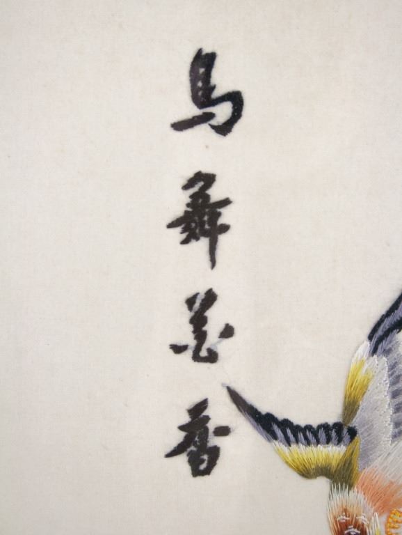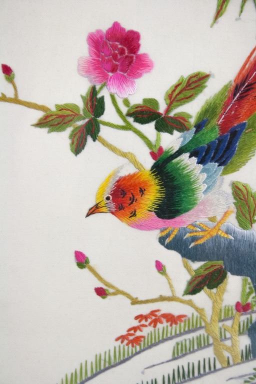 Chinese embroidery. Featuring birds and flowers. Embroidery size: 45 x 32.5 cm (17.5 x 12.5 inches). Frame size: 75 x 48 cm (29.5 x 19 inches)..