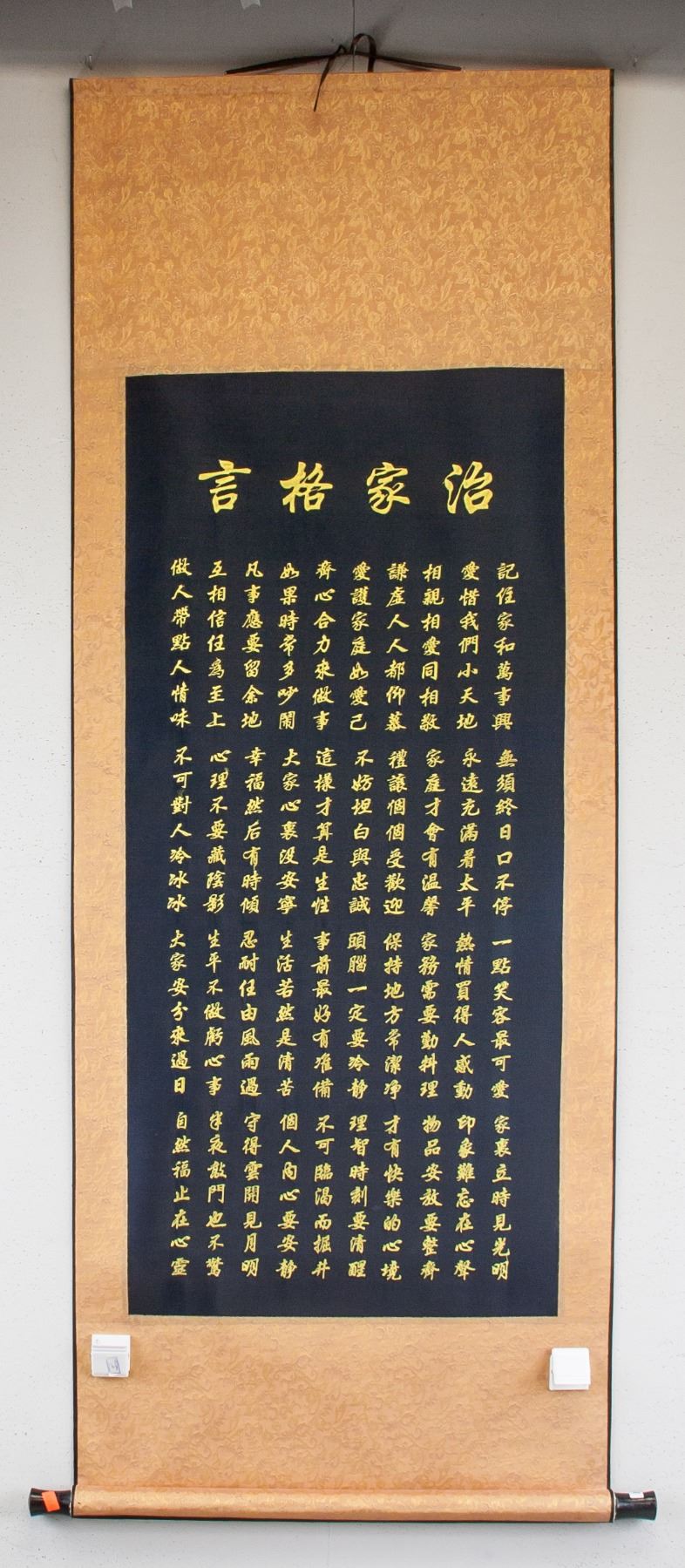 Maxims for Managing the Home; gold colour embroidery on black cloth; hanging scroll; 90 cm x 41 cm