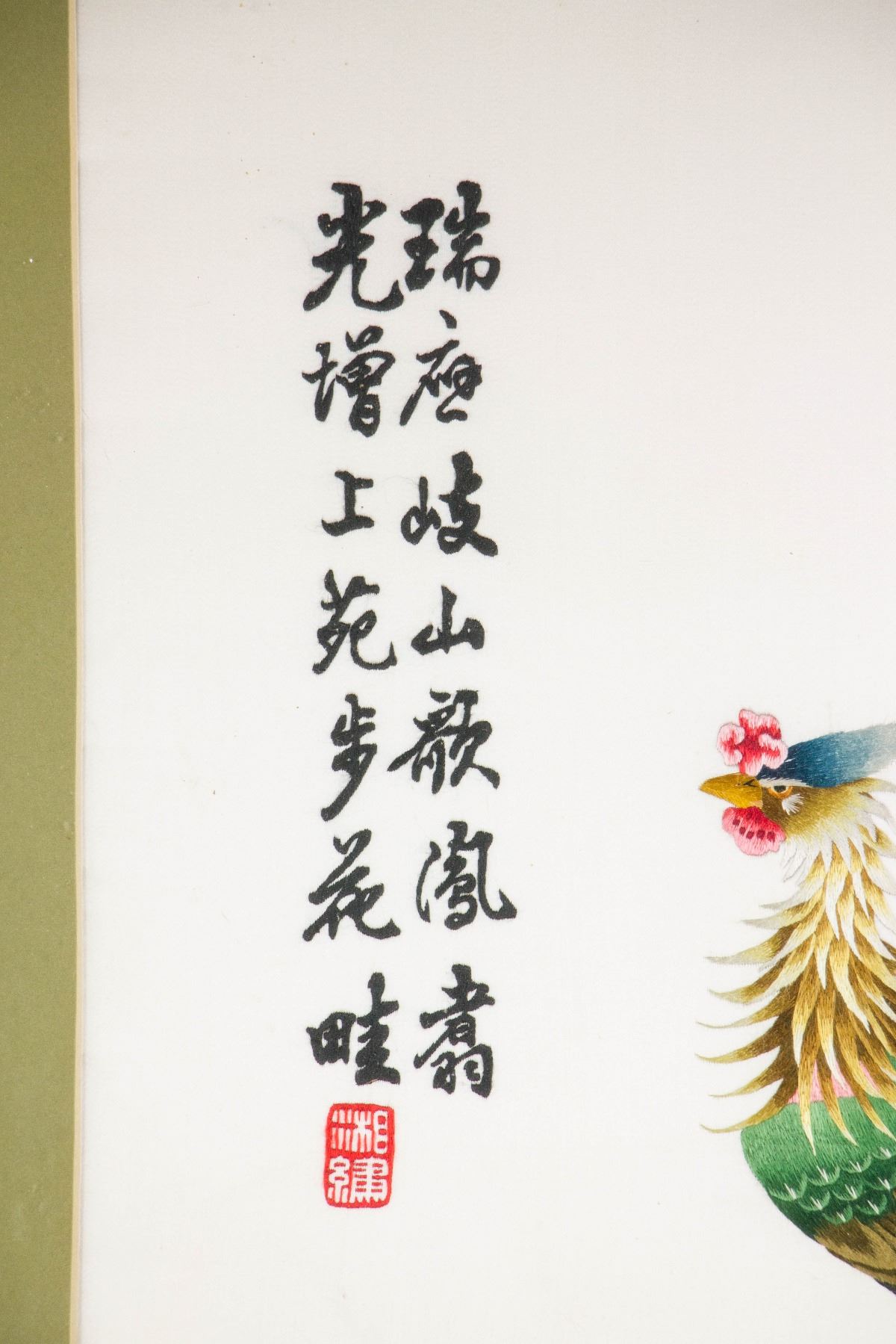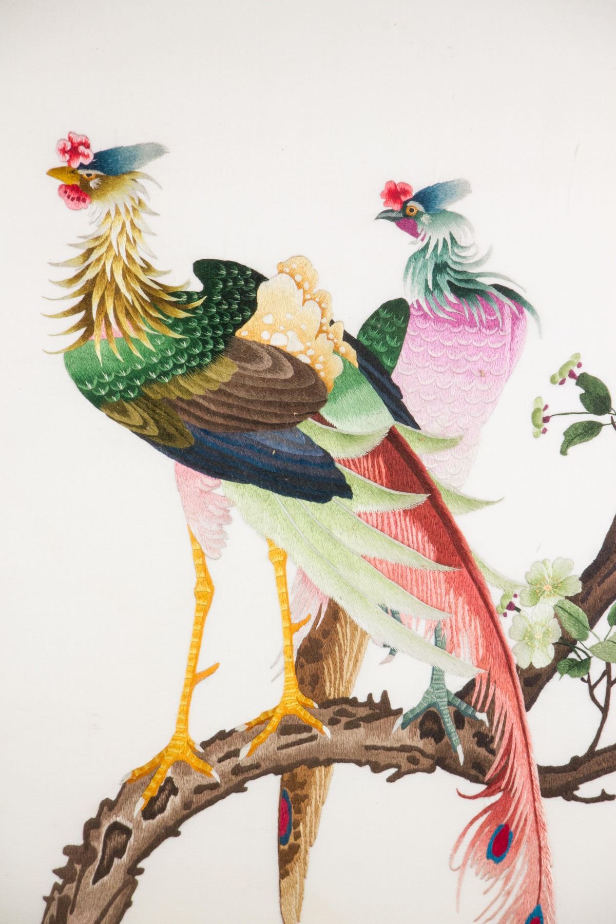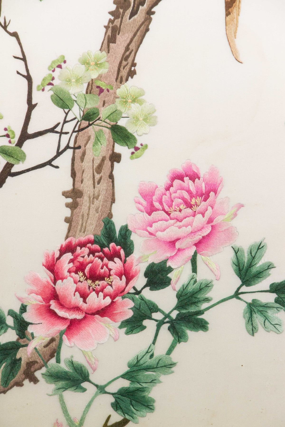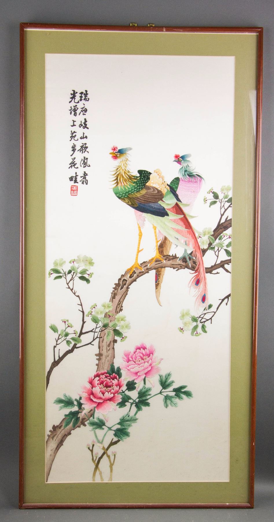Chinese embroidery of pheasant and peony flowers; framed; with Xiang Embroidery Mark; 98 cm x 43 cm