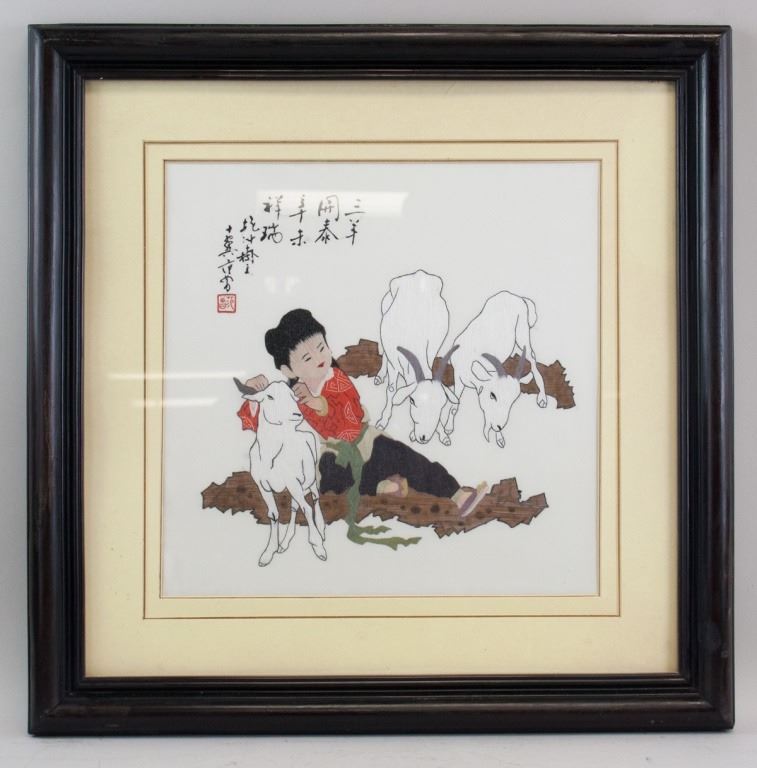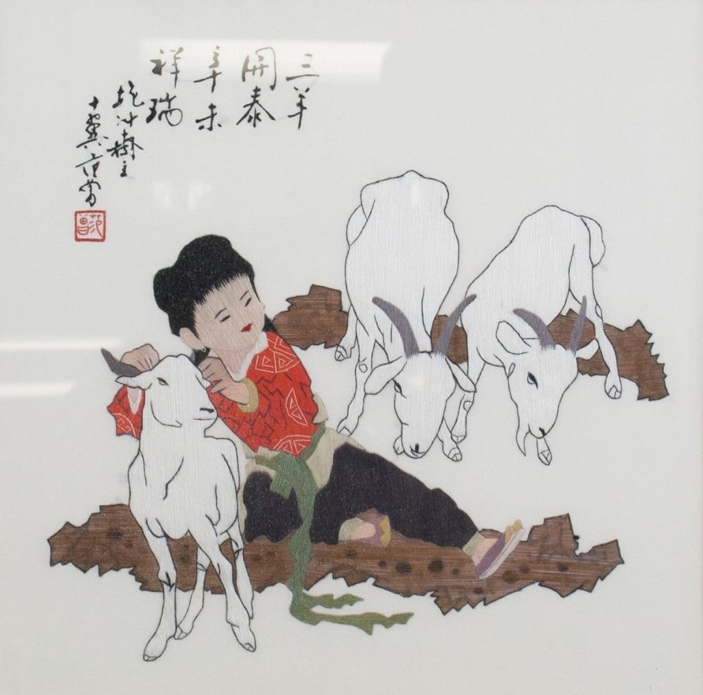 Chinese embroidery on panel, framed. Featuring a child with three goats. "Fan Zeng" stitched in the top left corner, along with one artist seal. 56 x 54 cm (with frame).