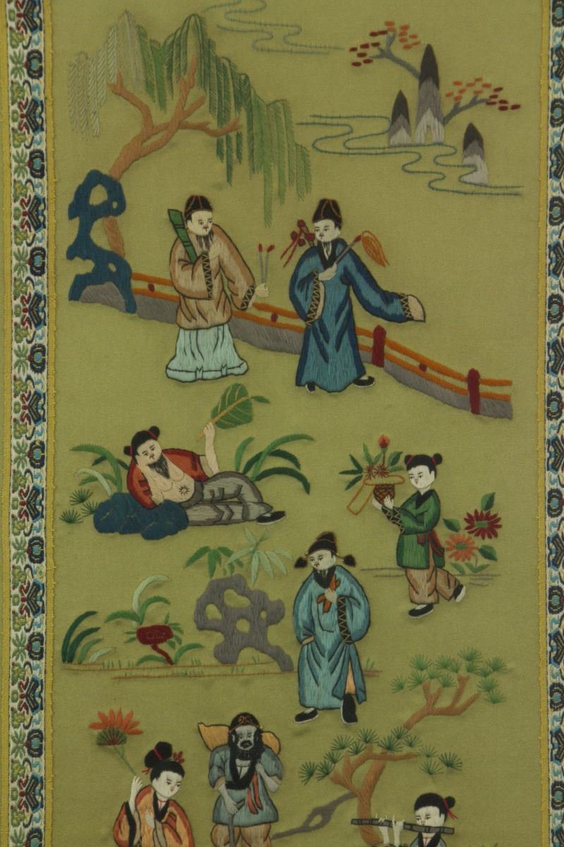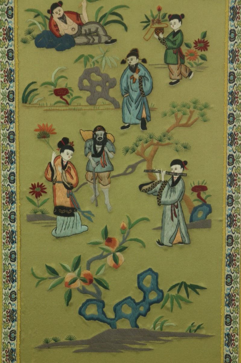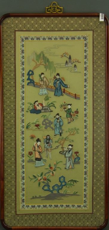 Chinese embroidery on silk with frame; of rectangular section; depicting eight immortals at courtyard; 73 cm× 33 cm