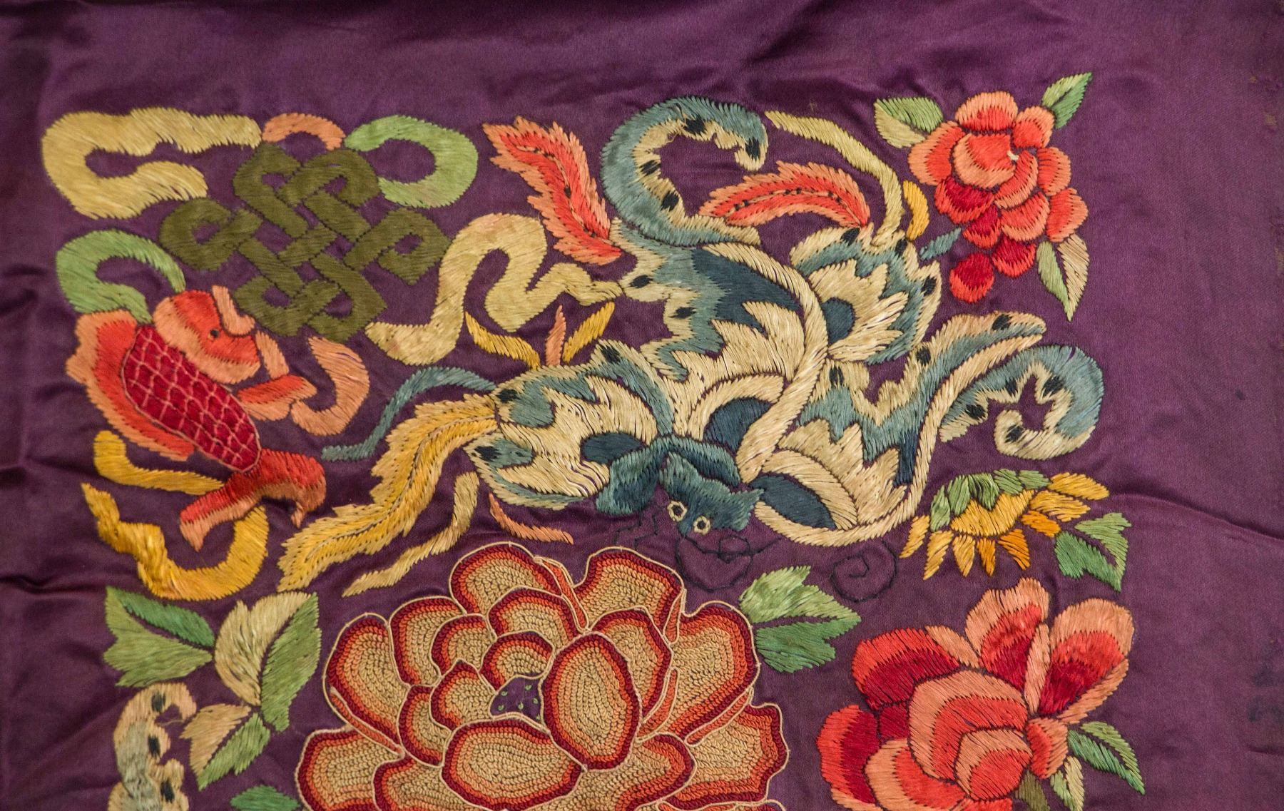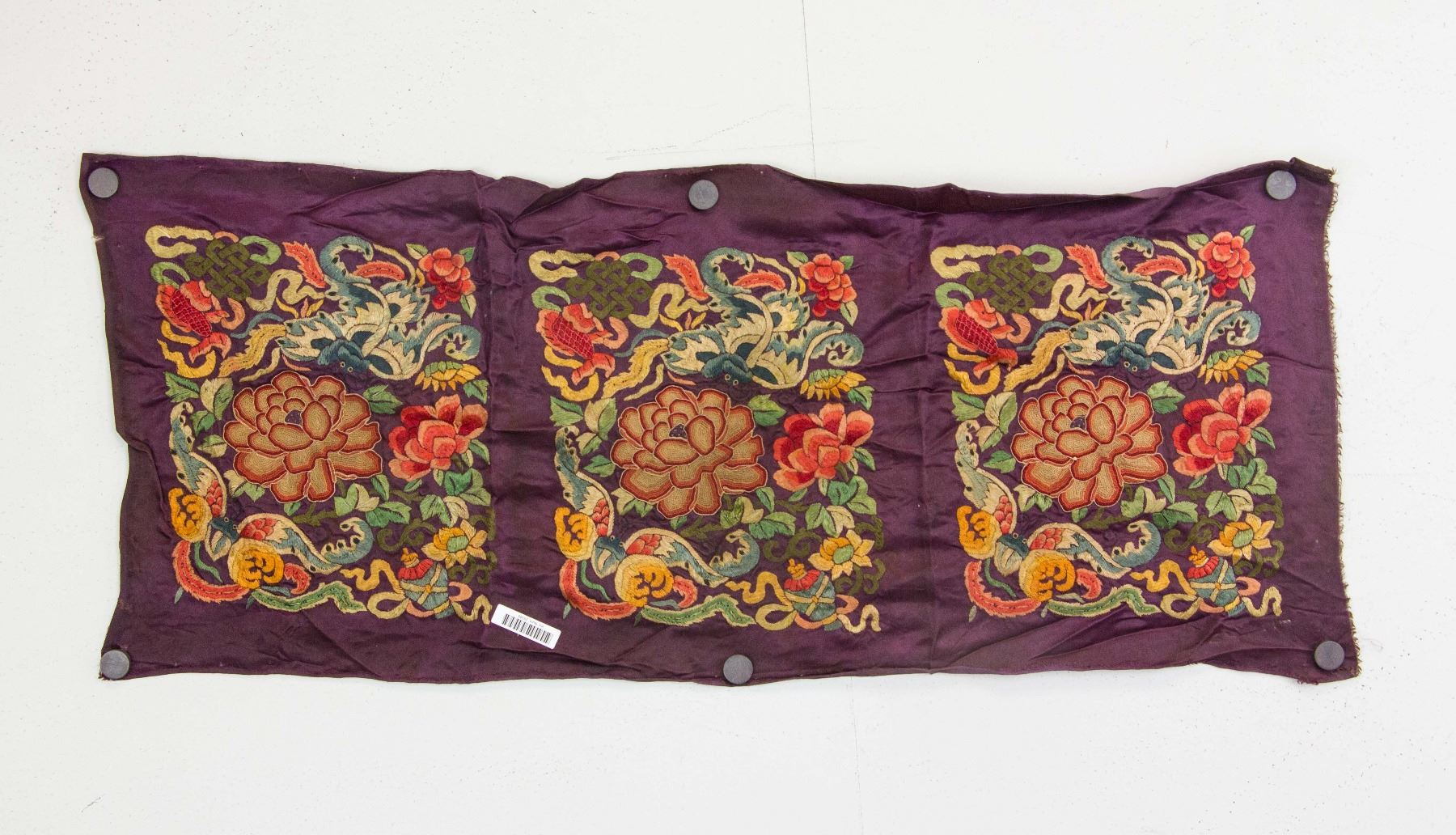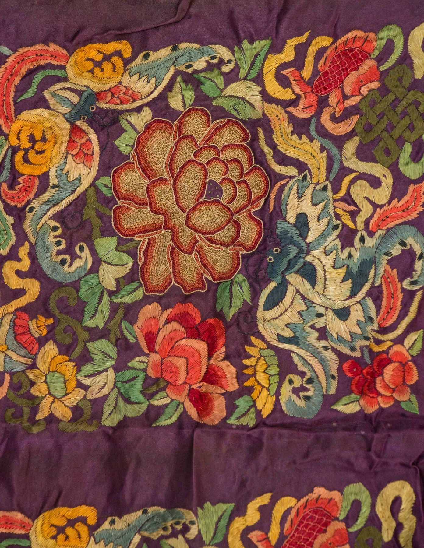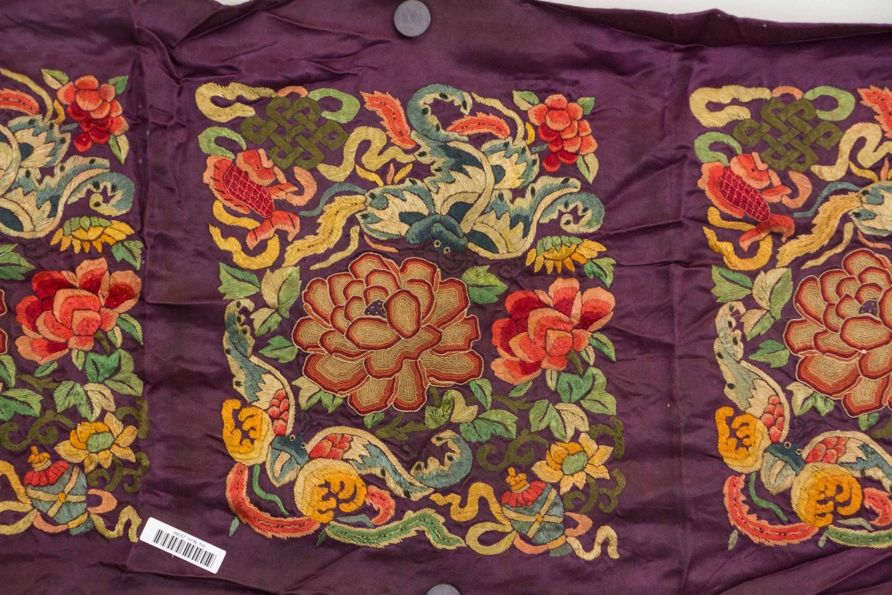 Chinese embroiled panel; of purple colour; embroiled with flowers and leafy pattern; 80 cm x 27 cm