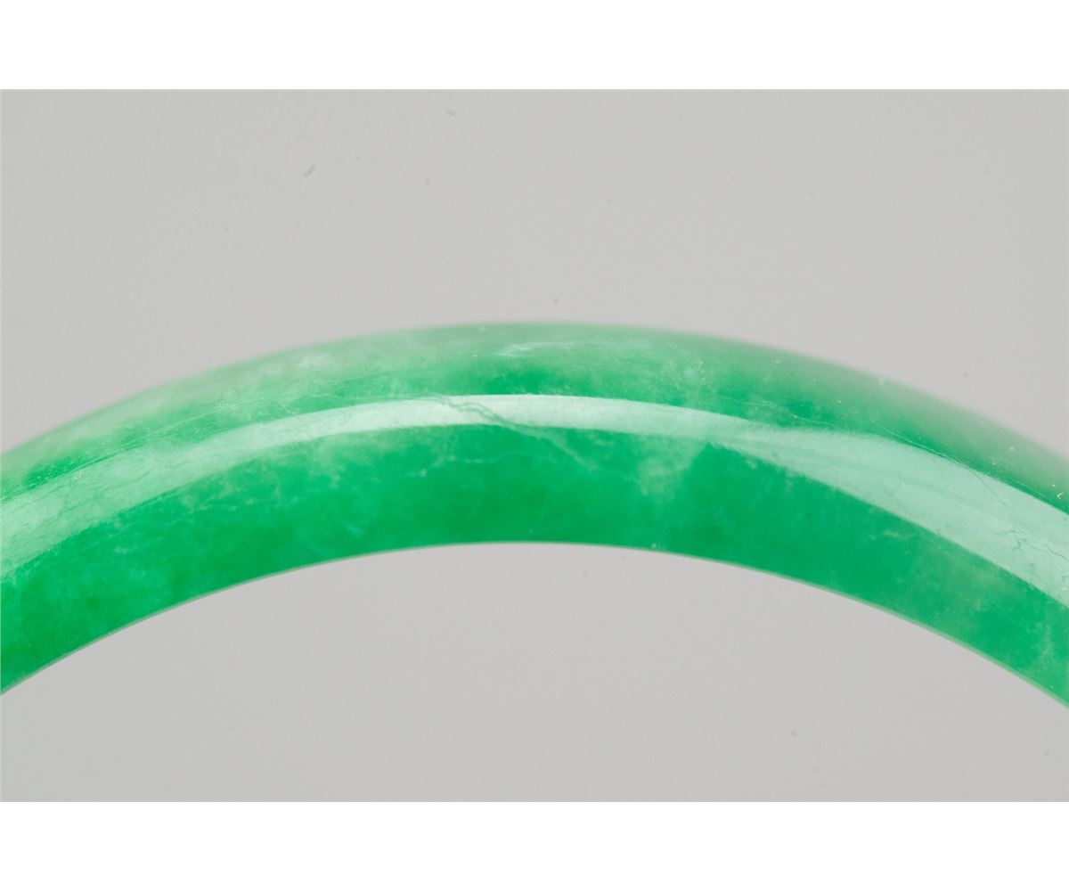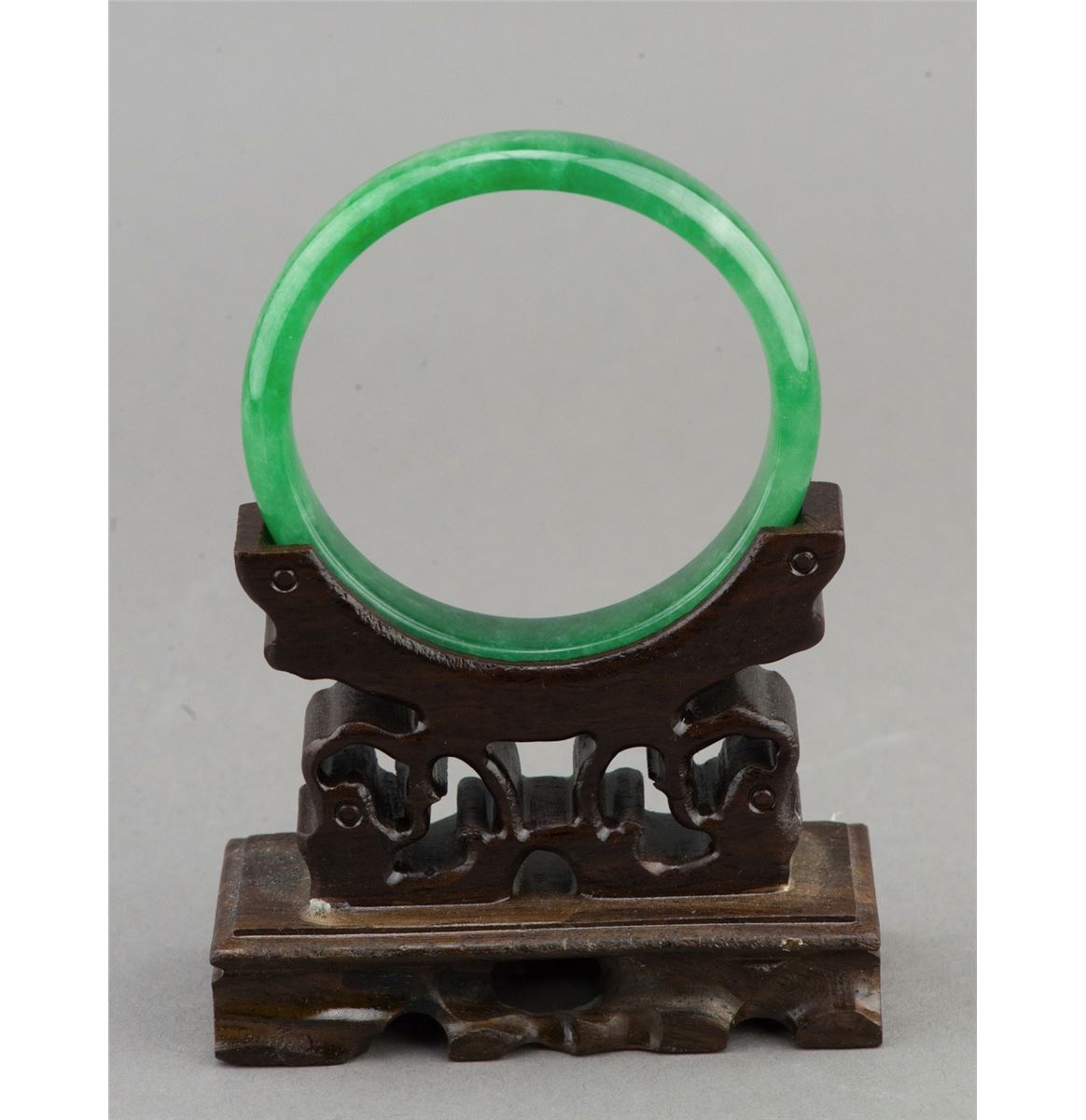 Chinese emerald green jadeite bangle; semi-rounded edge with fine polish; D: 7 cm (outer), D: 6 cm (inner), 44 grams, wood stand not included