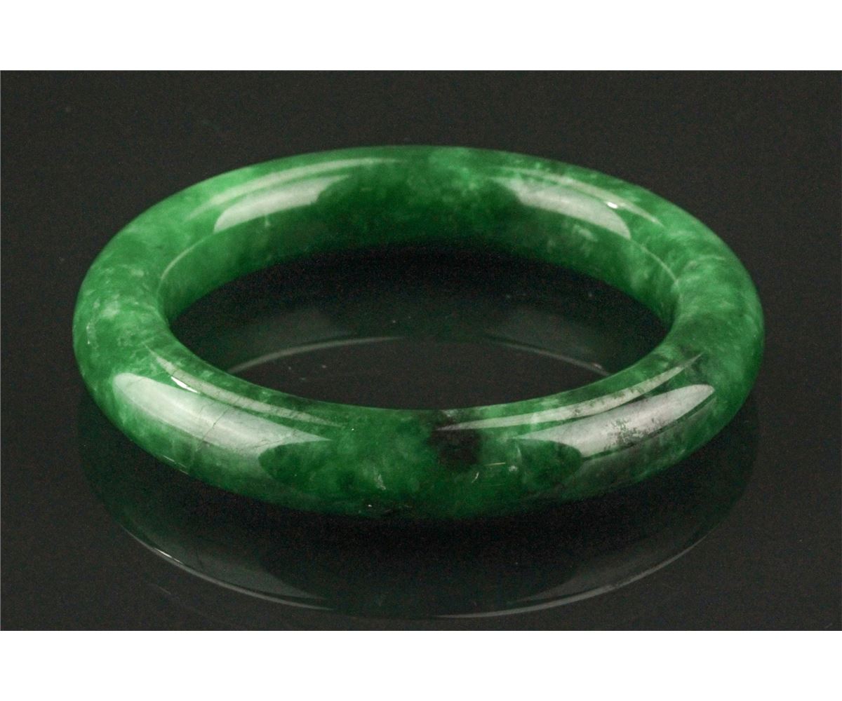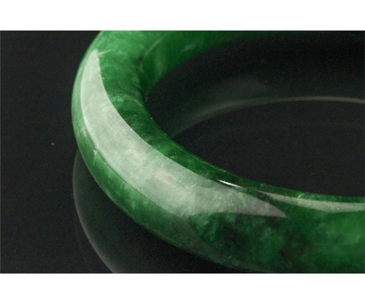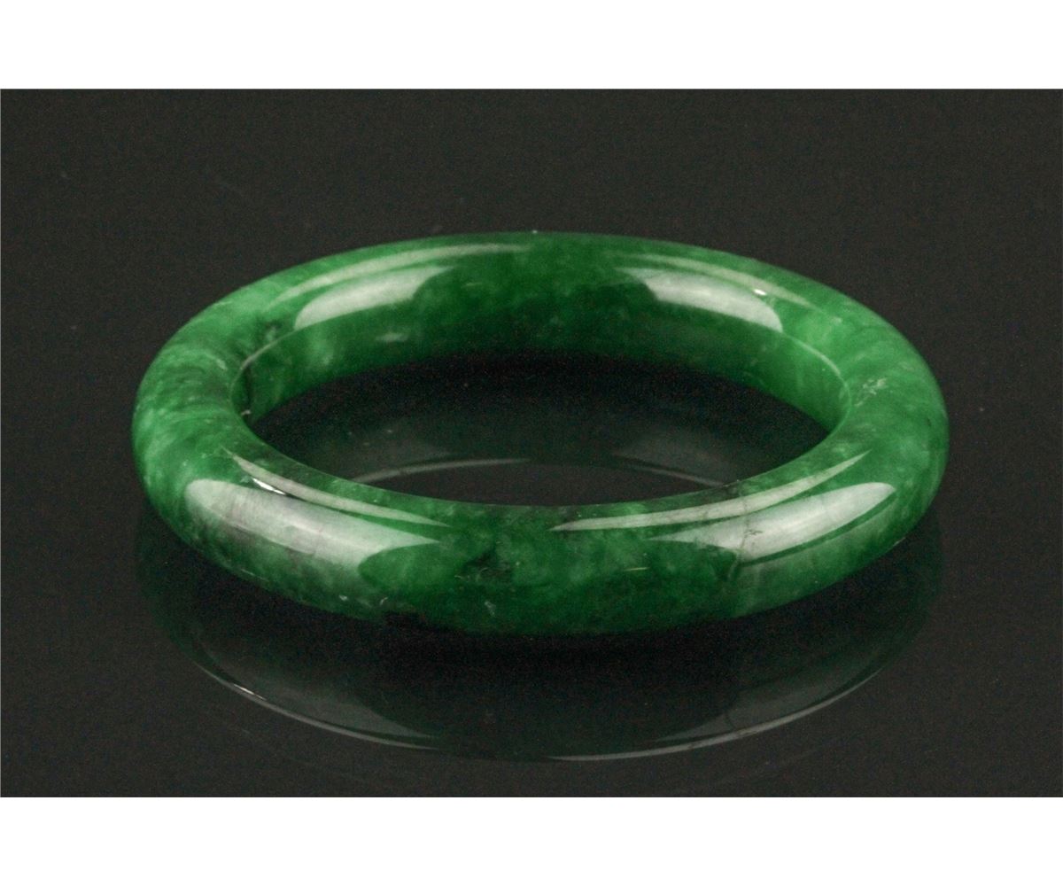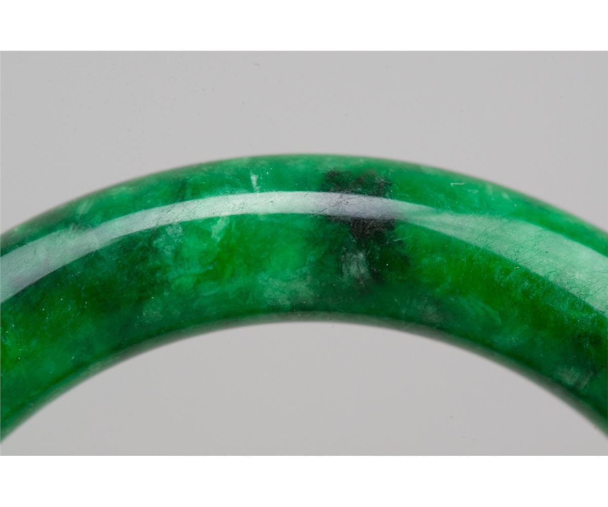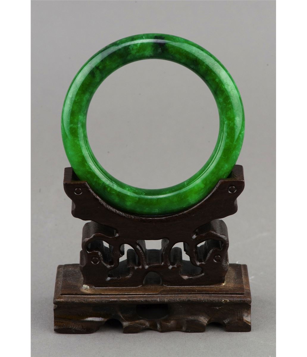 Fine Chinese jadeite bangle; of bright emerald green with spinach green suffusion; rounded edge with high luster; D: 7.5 cm (outer), D: 6 cm (inner), 81 grams, wood stand not included