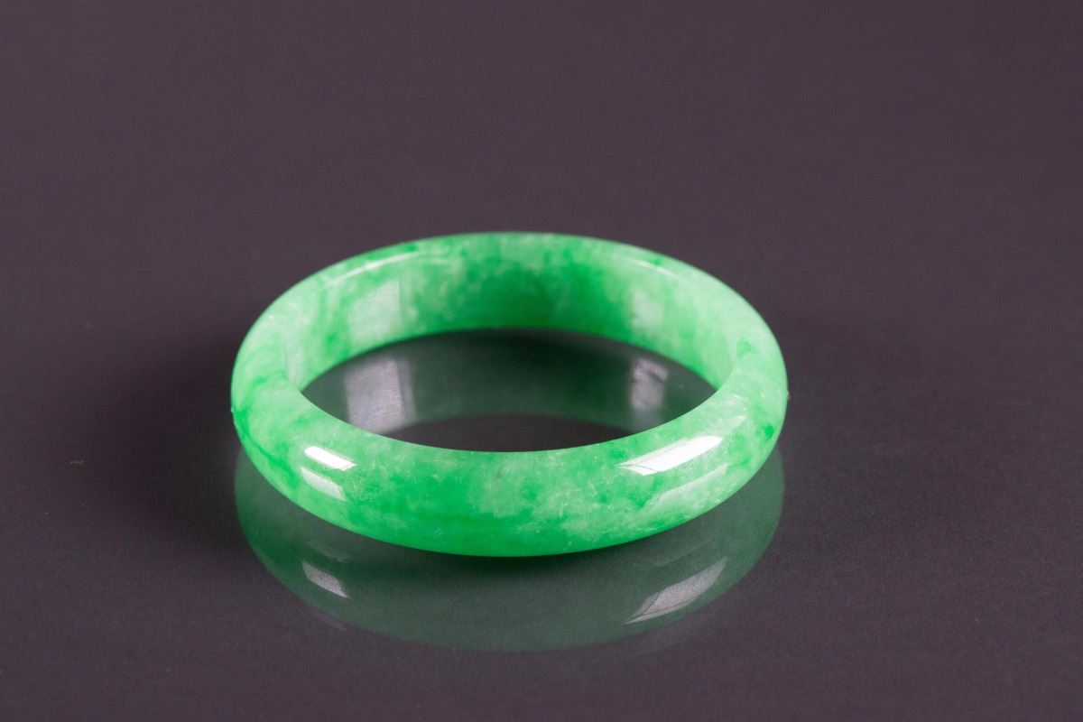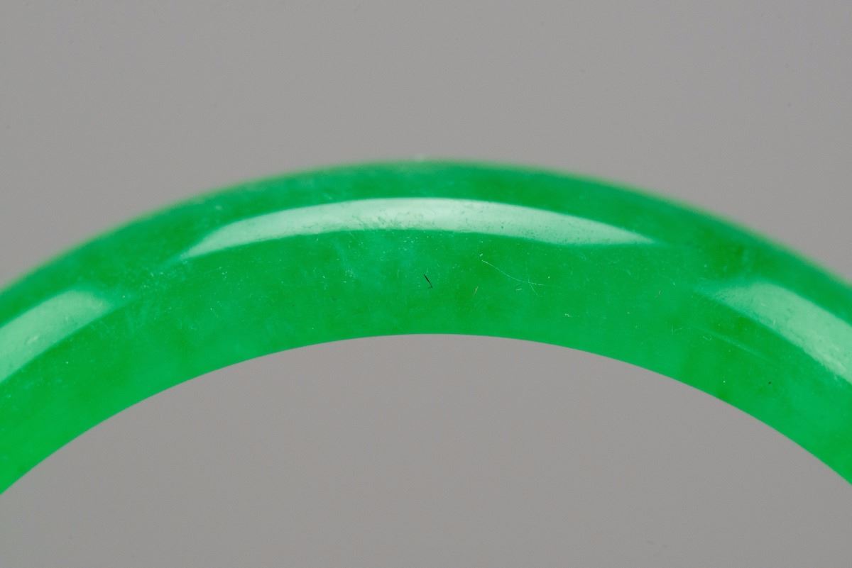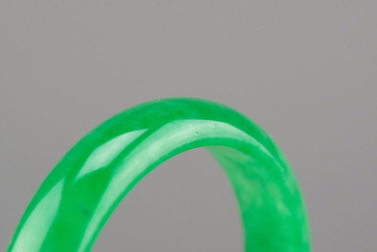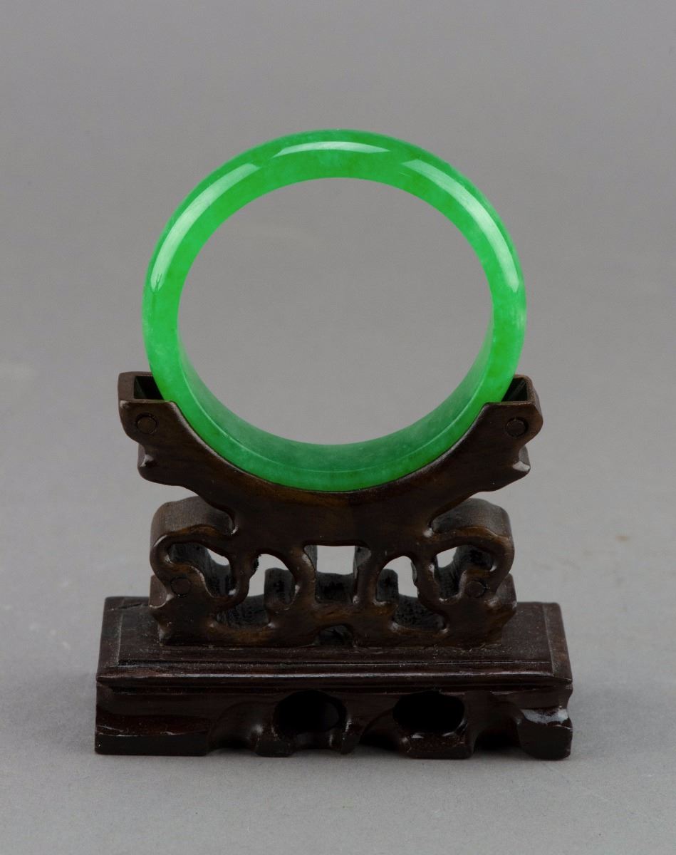 Chinese jadeite carved circular bangle, of strong emerald green tone, good translucency with semi-rounded edge. Wooden stand not included. D: 7 cm inner D: 5.75 cm, 48 grams. Provenance: T. Ng Collection Toronto.