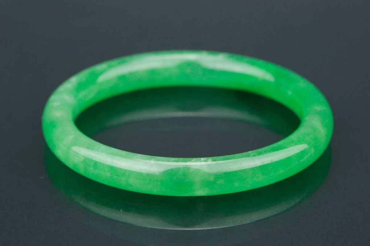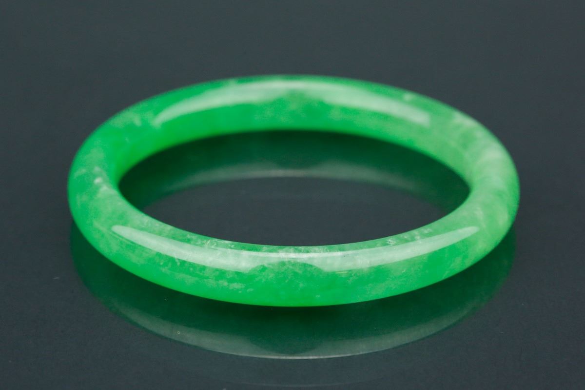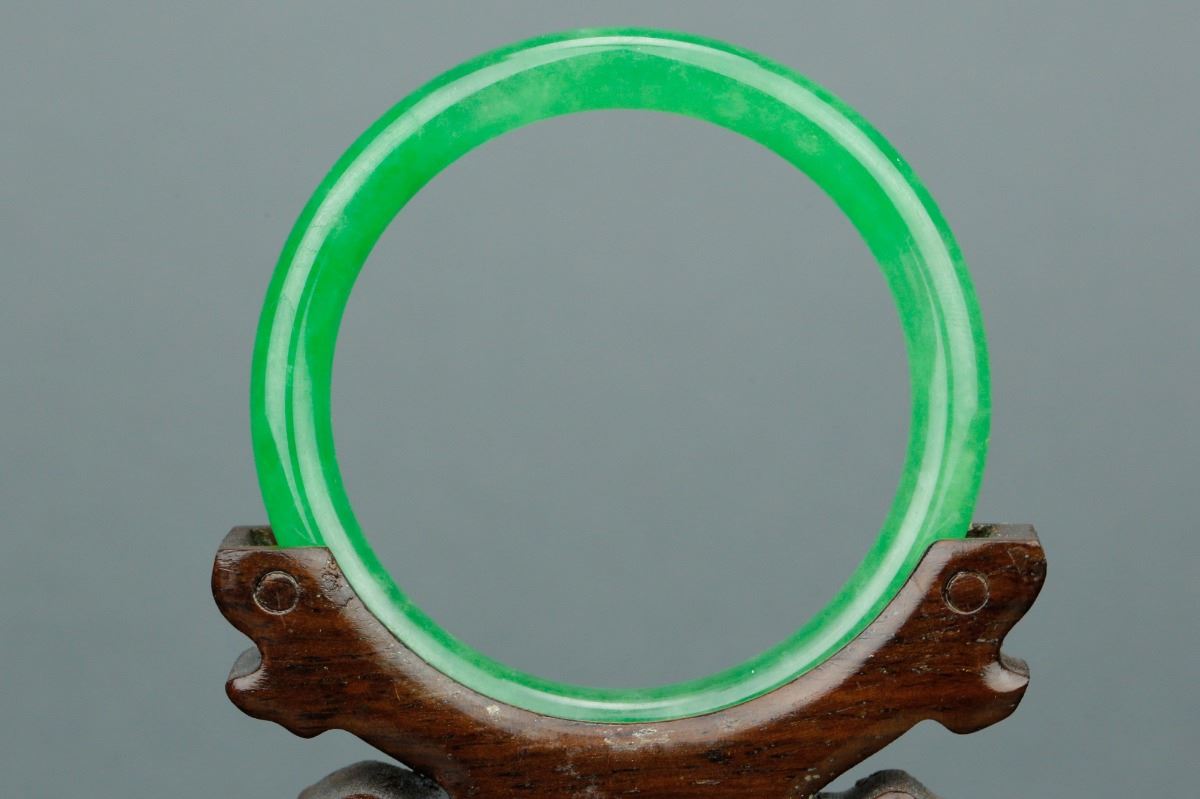 Chinese emerald green jadeite bangle; of rounded edge; D: 5.5 cm, 37 grams; Density: 3.31