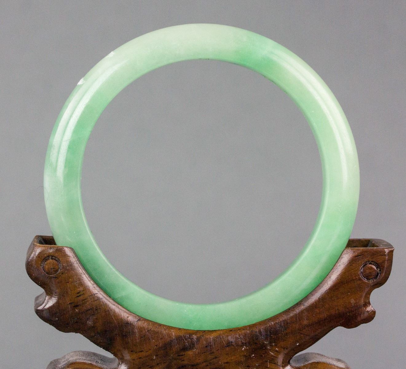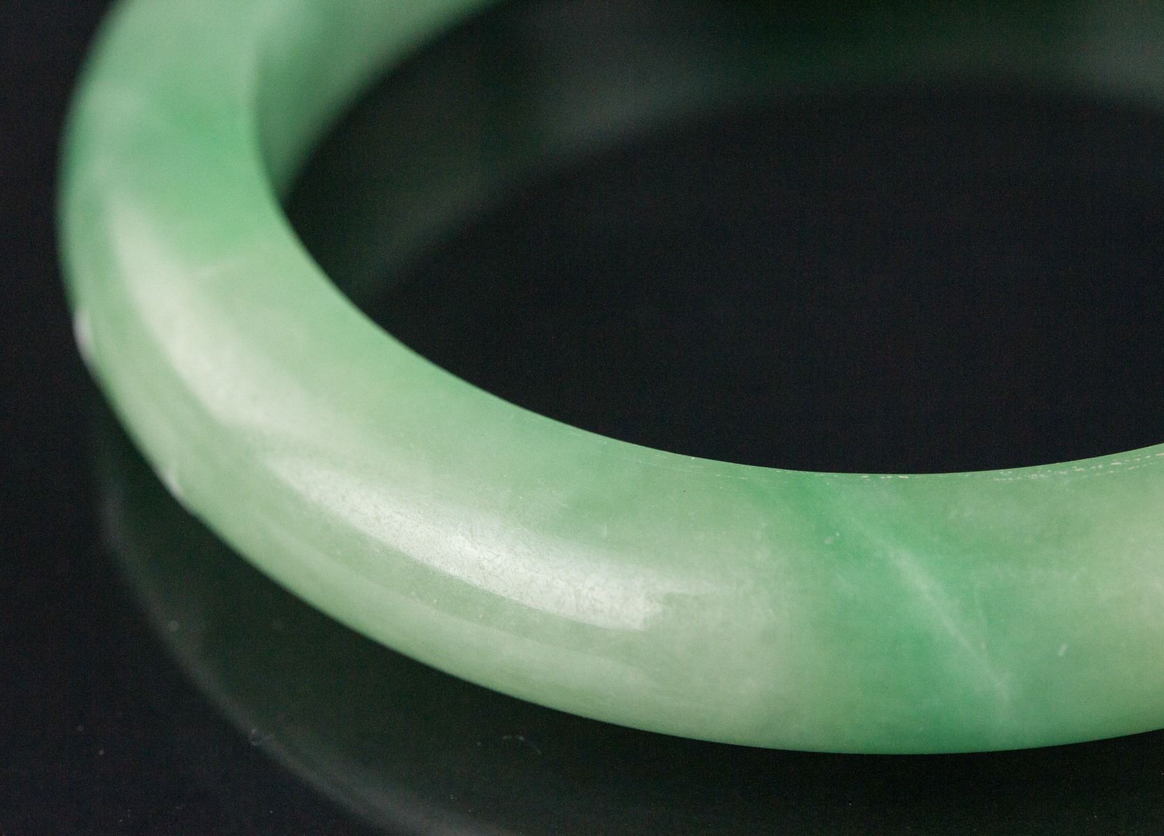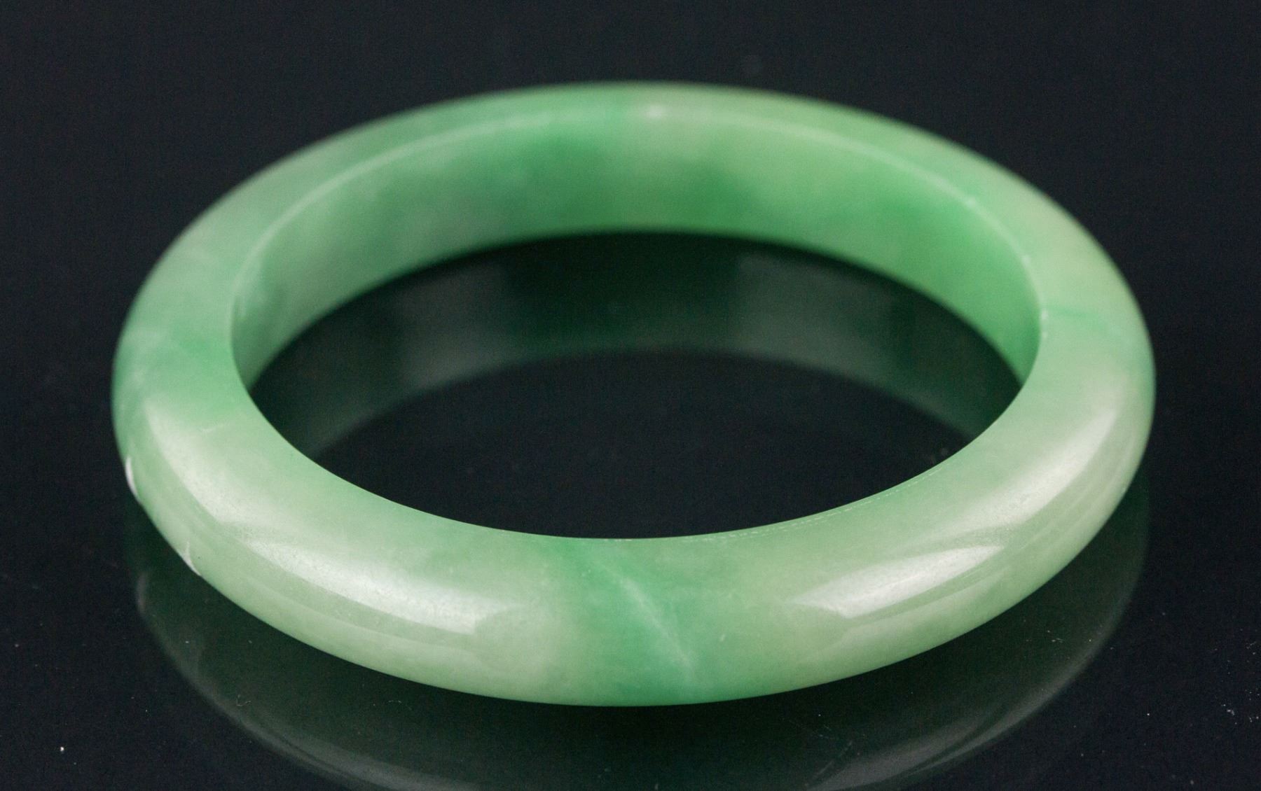 Chinese Green Jadeite Bangle; rounded outside and flatten inside; H: 1 cm, D: 6.6 cm, Inner D: 5.8 cm, 38 grams, Density: 3.28