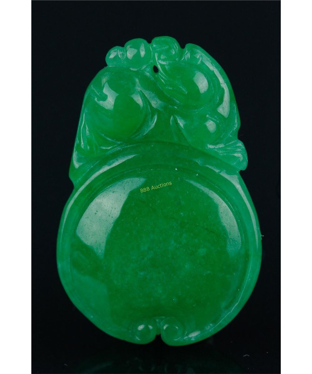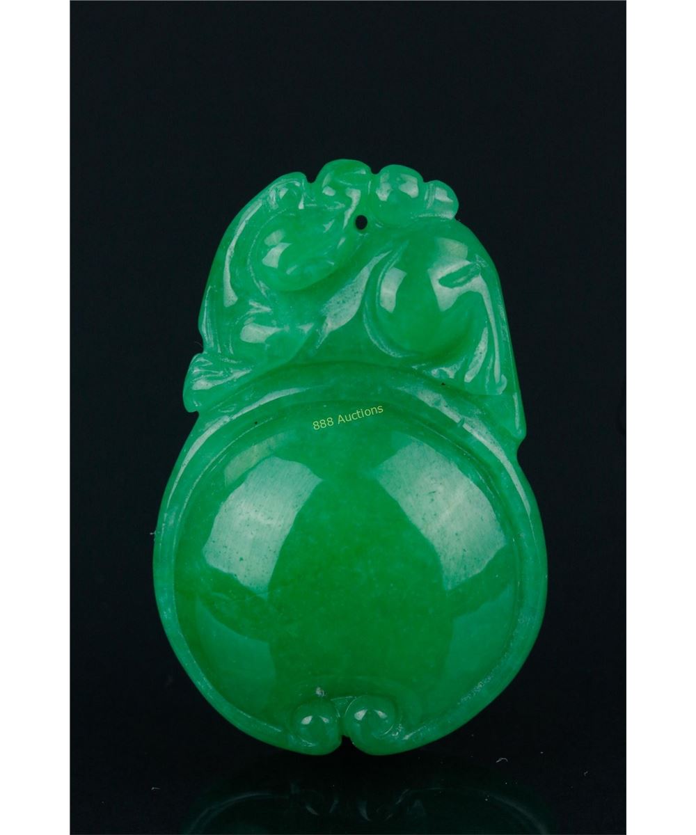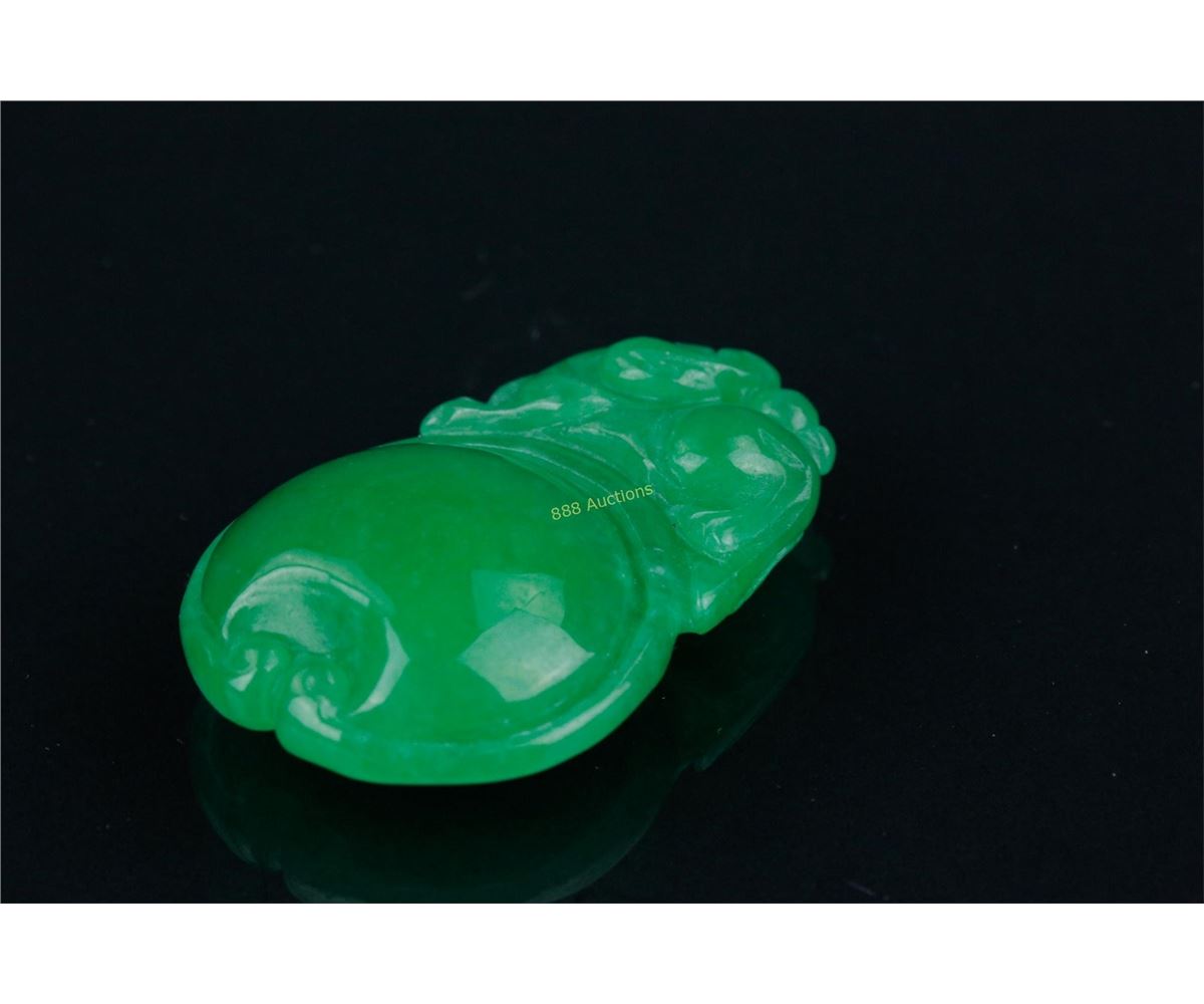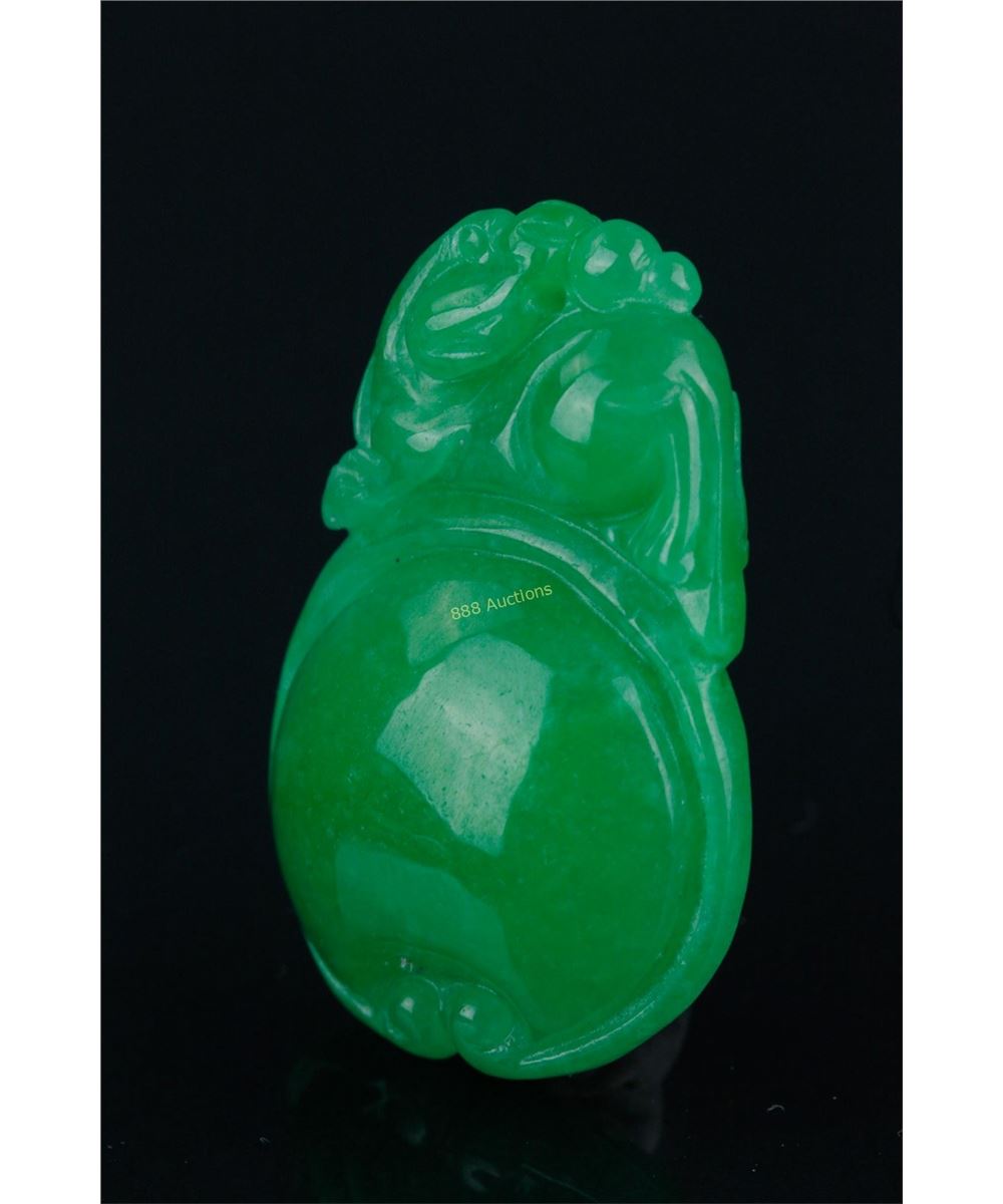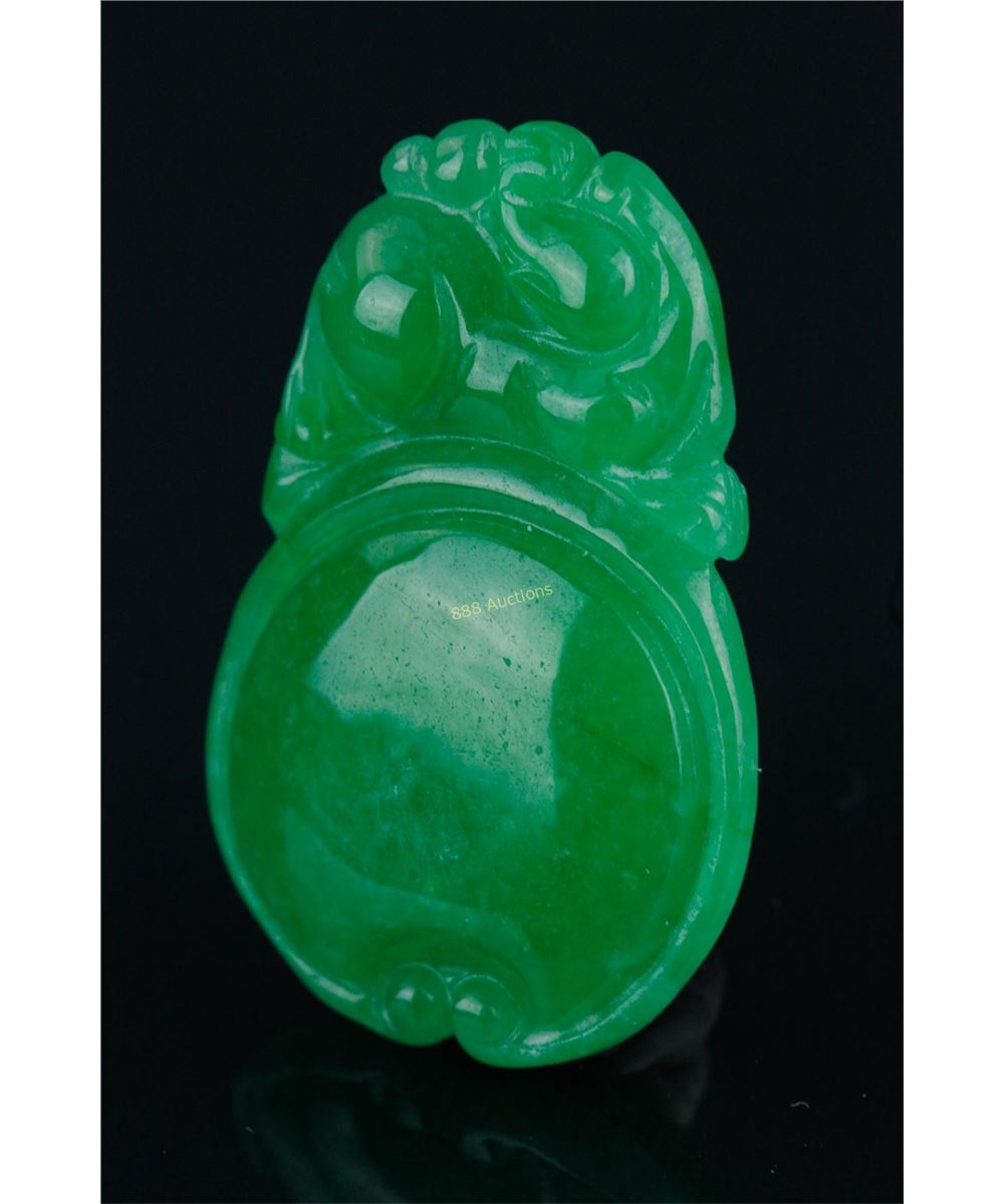 Chinese emerald green jadeite pendant, featuring dragon and pearls; H: 4 cm, W: 2.5 cm, density: 3.27