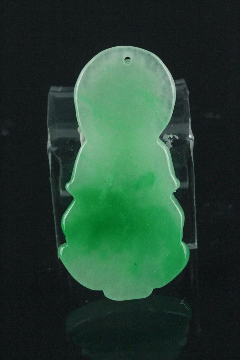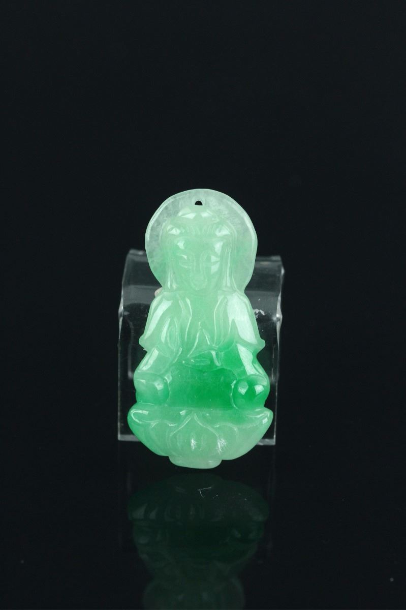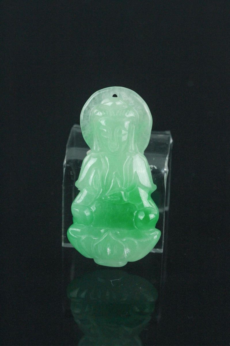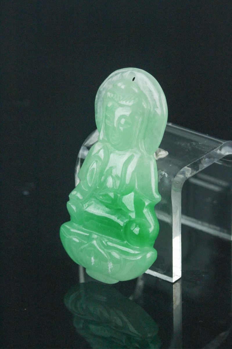 Fine Chinese jadeite carved pendant, featuring serene expression Kwanyin on lotus plinth holding a vase. The stone of apple green with emerald green suffusions. H: 4.5 cm. Density: 3.26