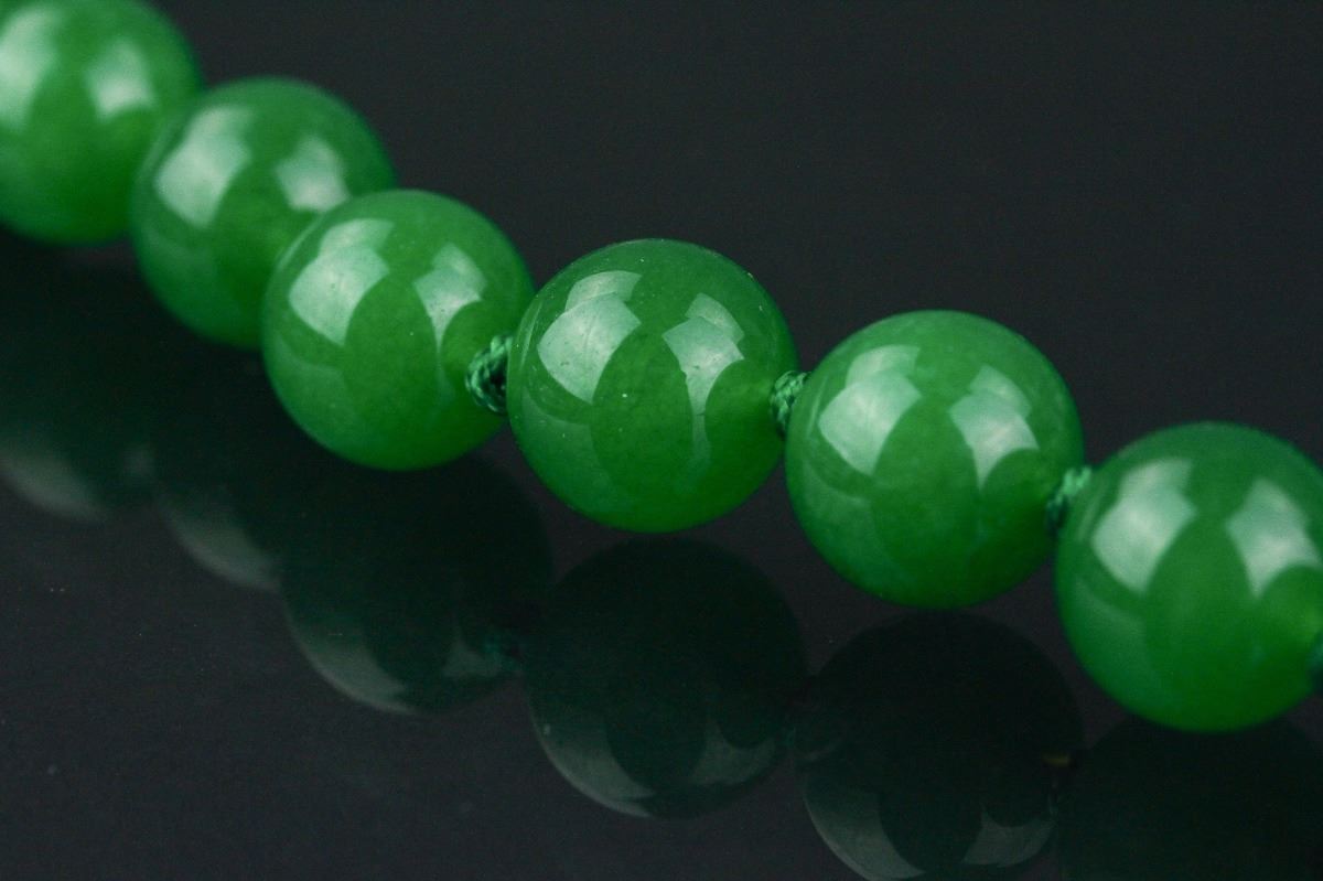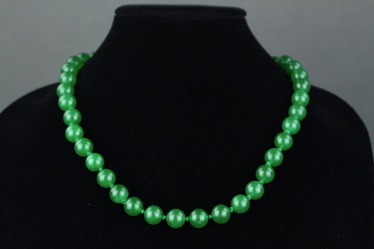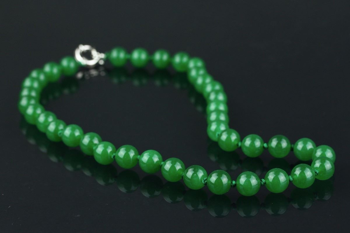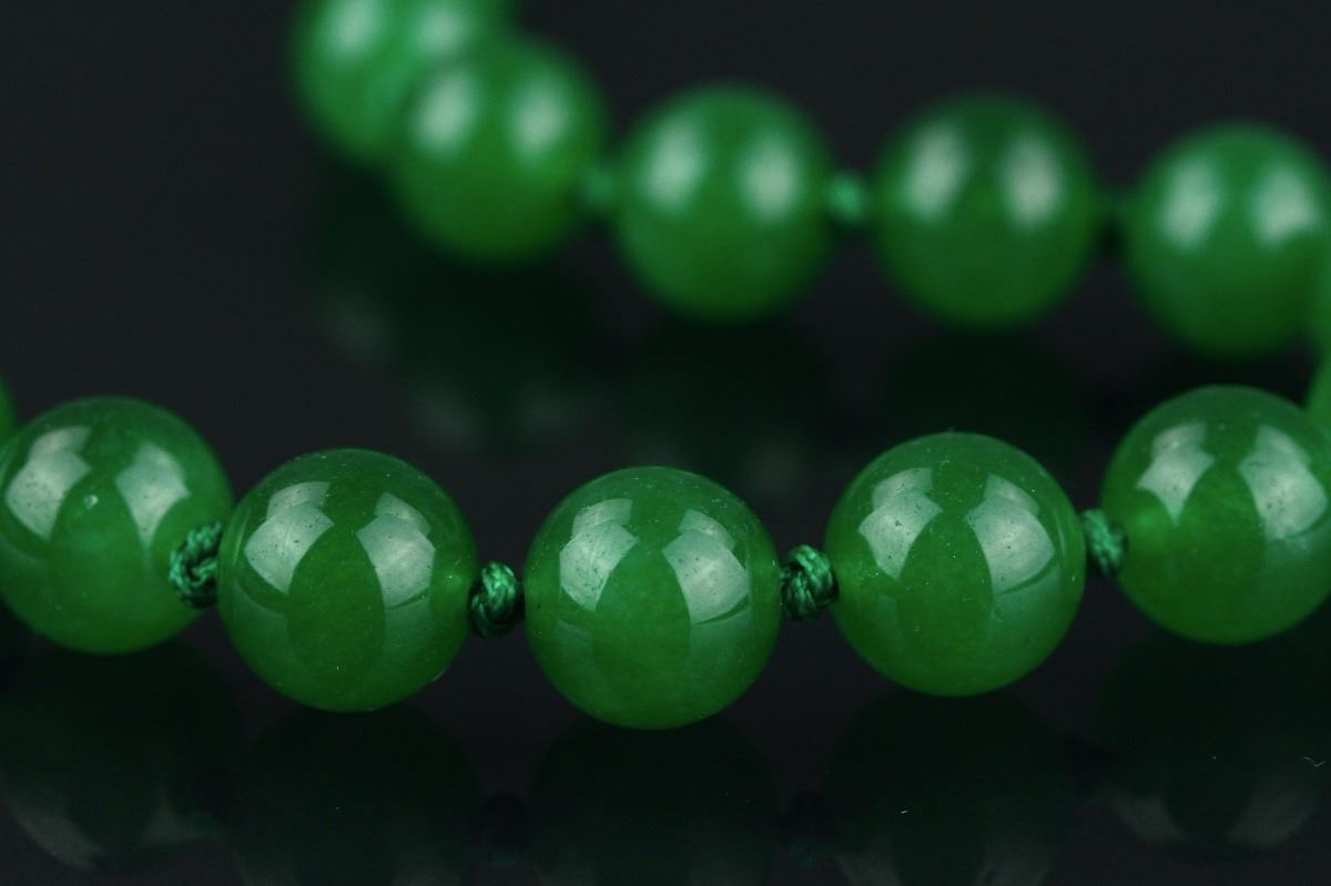 Chinese emerald green jadeite necklace; comprised of thirty-eight rounded jadeite beads; L: 56 cm, 98 grams