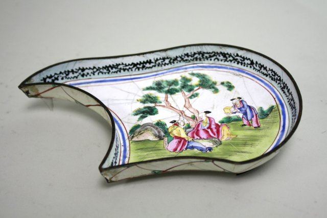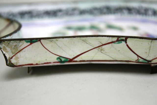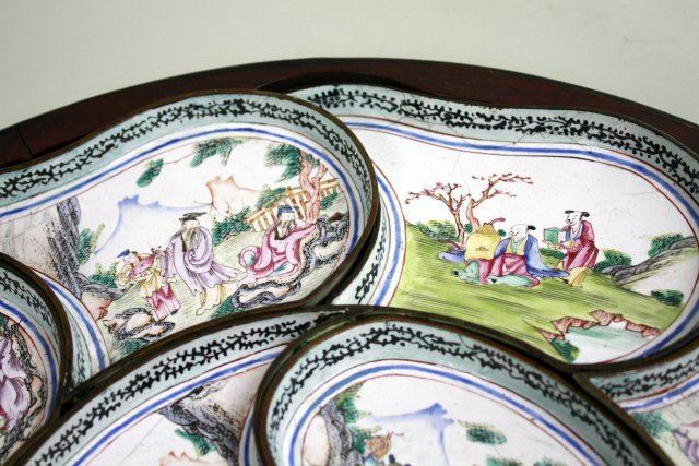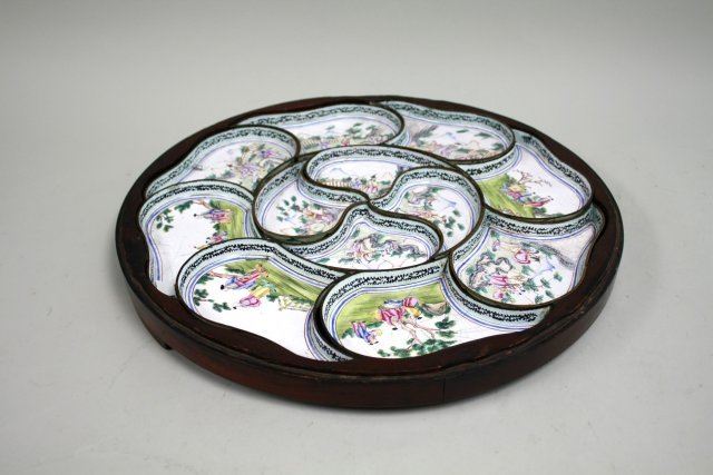 In circular round tray, approx. 2" H x 18 1/2" D. Dishes approx. 1" H x 7 1/4" W & 6" W. Some damage to enamel. Wear to wood.