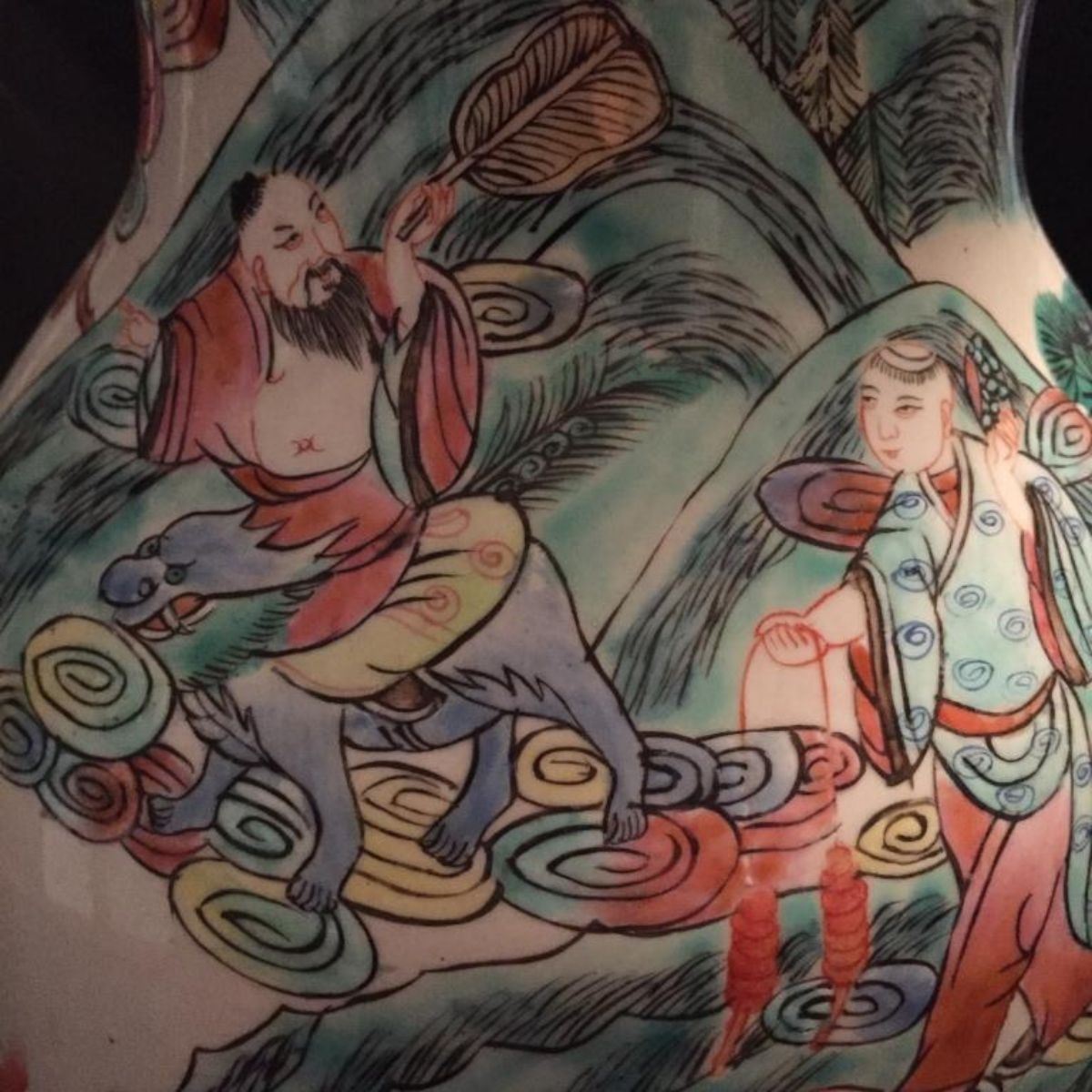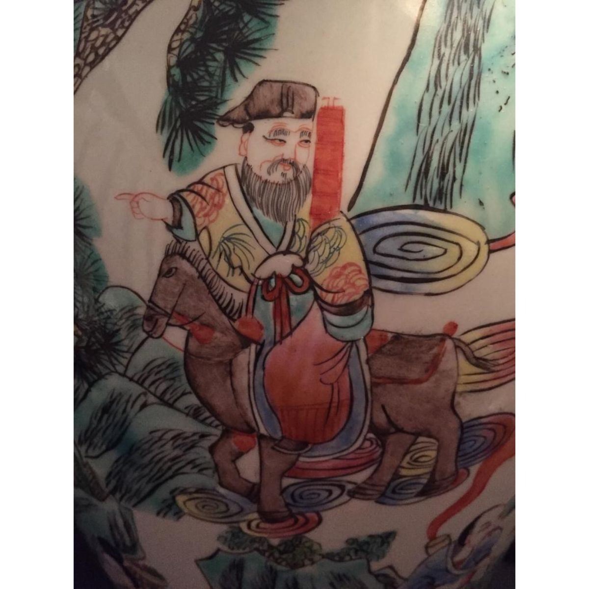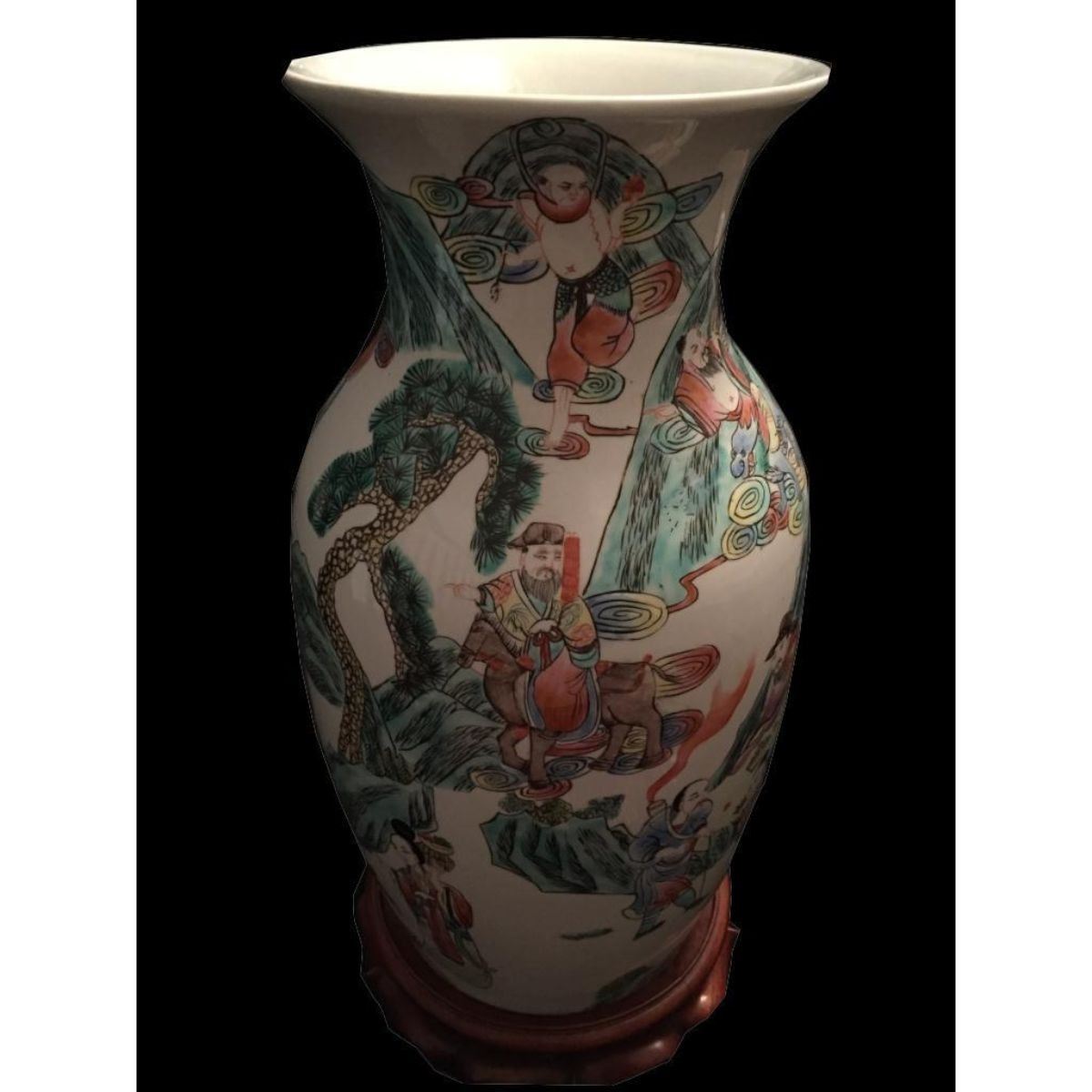 Chinese enameled porcelain vase, depicting figural reserves of royalty engaging in various activities with mountain landscapes on a white ground. 16" H X approx 8 1/2" D. Comes with ornately carved teakwood stand.