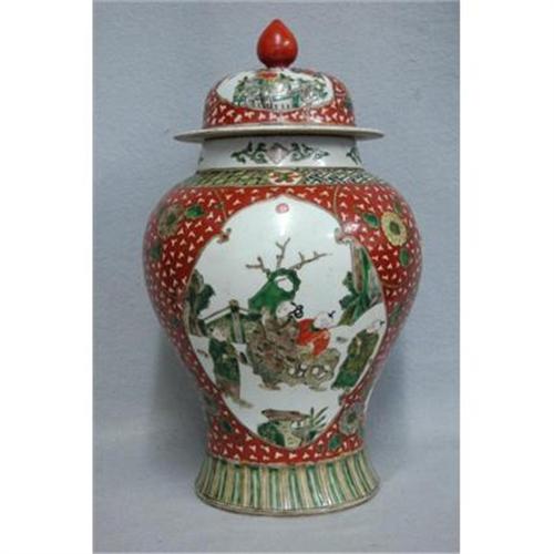 Chinese polychrome enamel decorated urn with cover, Republican Period, the high-shouldered body with two large figural reserves separated by small roundels of auspicious emblems on a patterned deep red ground with occasional flowering vines, the flaring base encircled by a lappet band, a patterned band with further auspicious emblems below the short cylindrical neck, the domical lid with bud finial and decorated en suite, the base with an apocryphal Kangxi mark (minor surface wear), 16''h