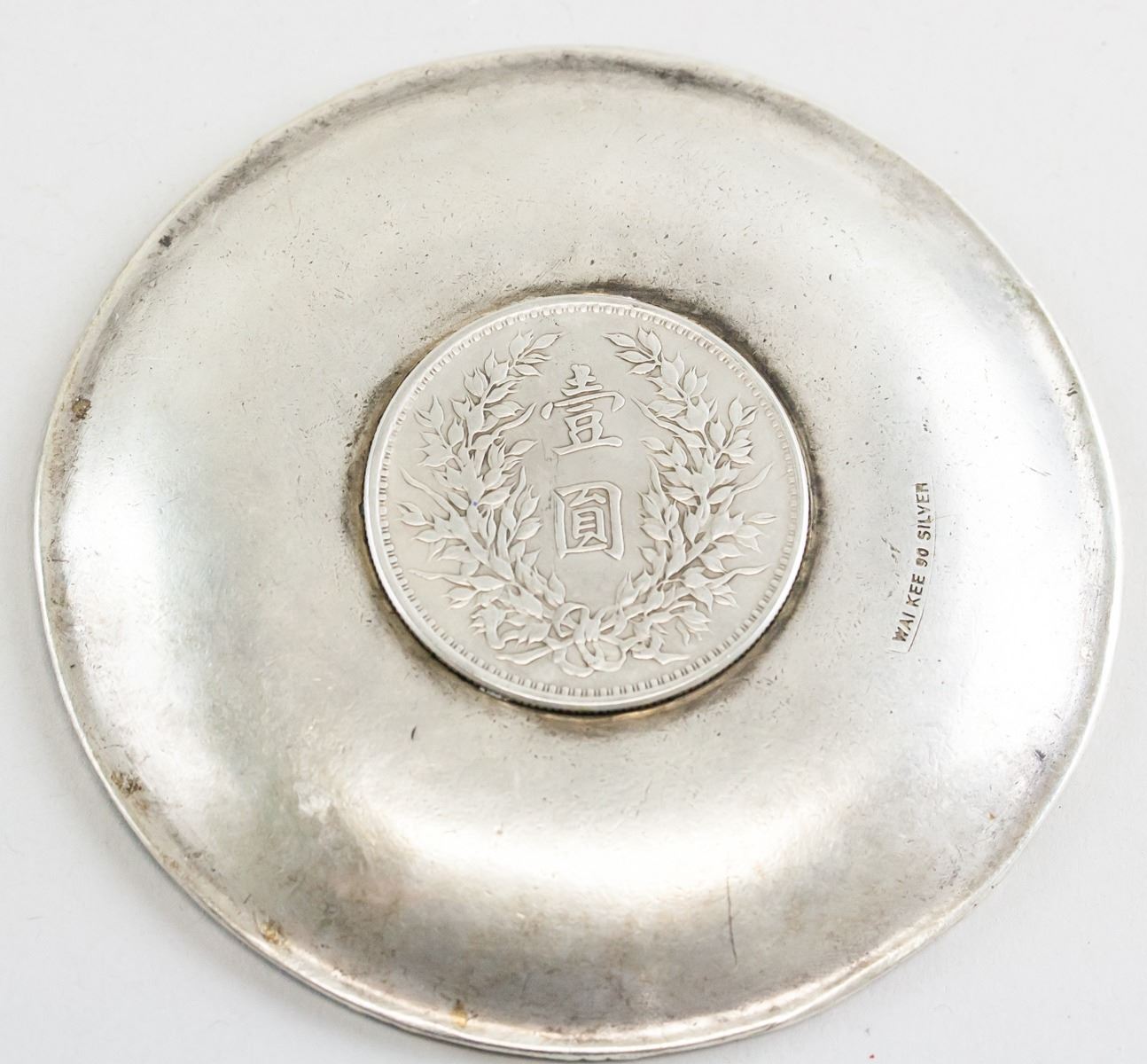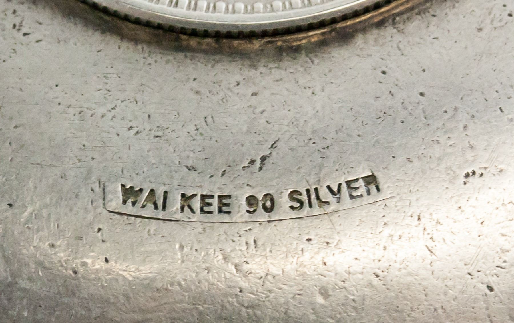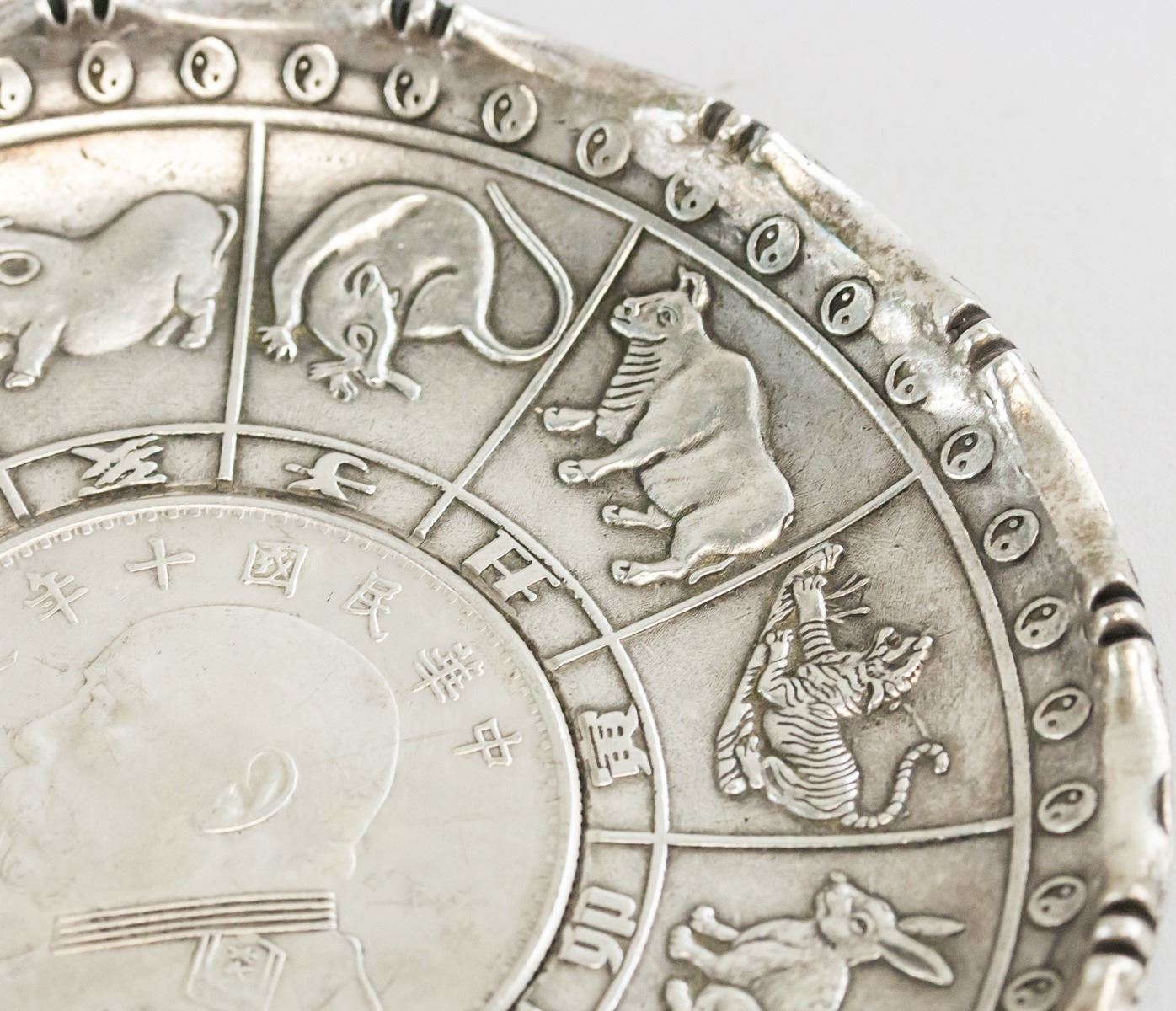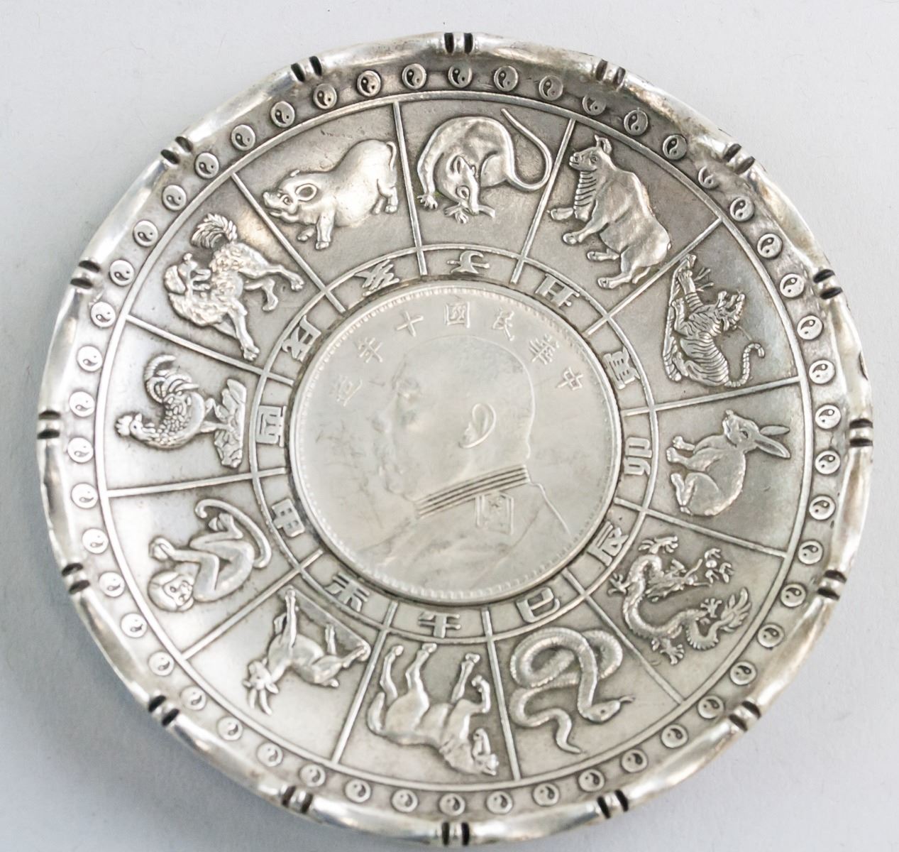 Chinese silver zodiac plate with coin set into the center. Stamped with "WAI KEE 90 SILVER" on base. Silver untested. 1 x 11 cm, 100 grams.