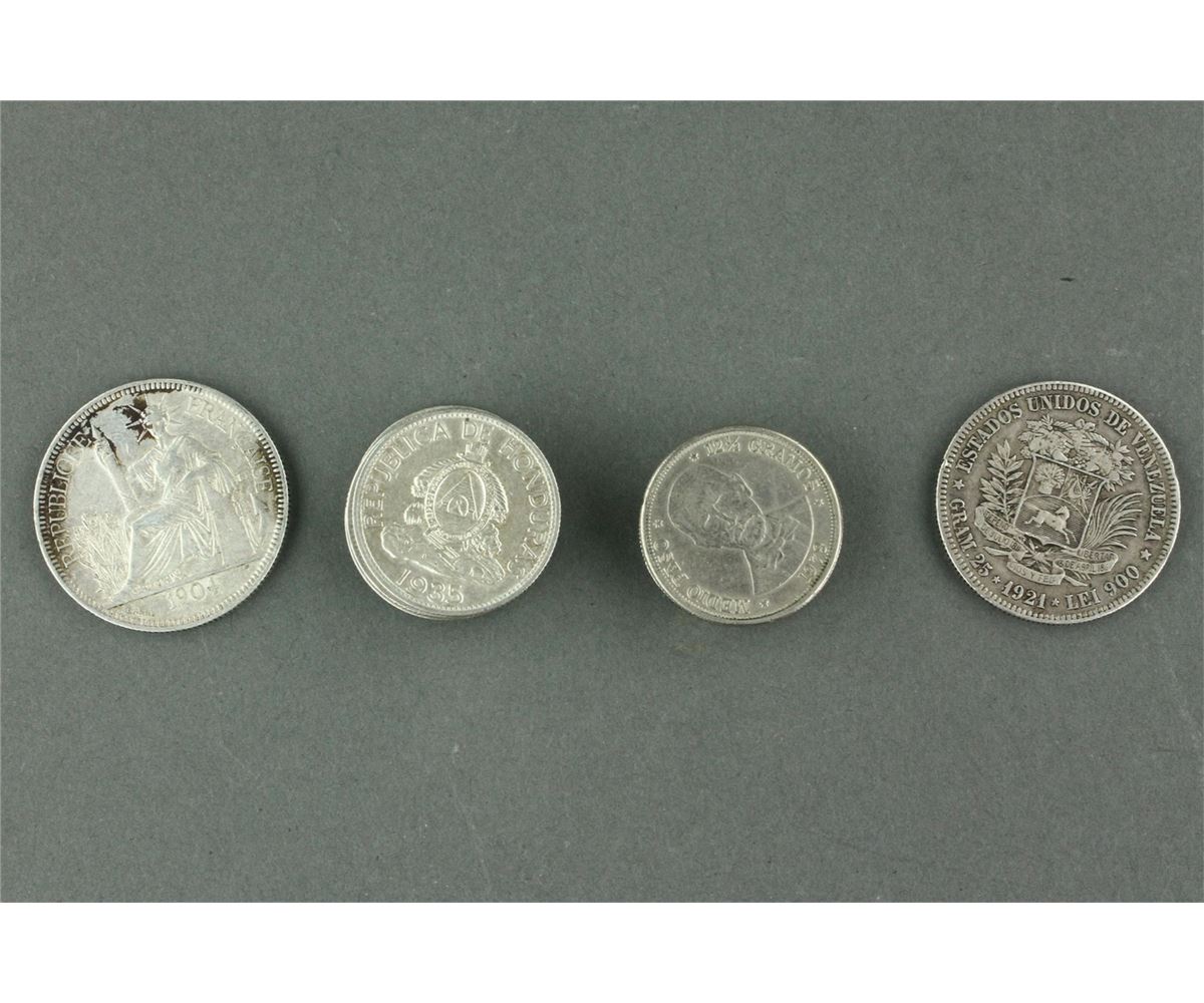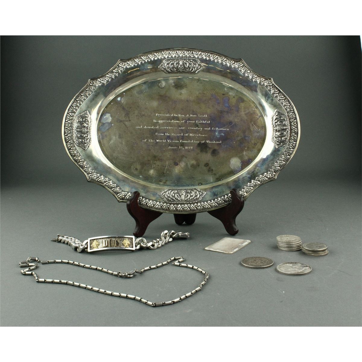Group of European silverware; comprised of one silver plate, one 1 oz Johnson Matthey silver bar, twelve US dollar coins; one DON mark bracelet and one chain necklace; the silver plate with World Vision Foundation mark and dated 1977; H: 14 cm, W: 24 cm, 772 grams total