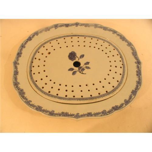 Qianlong period blue and white Chinese export serving platter with matching strainer dating to circa 1770 - 1780. Decoration true to the period, from the second half of the 18th century. Nice large size measuirng 15 3/4 by 13 1/2. There exists a small chip (not sturctural) to the surface on the strainer. Generally speaking in very good condition. Additional images available on request.
