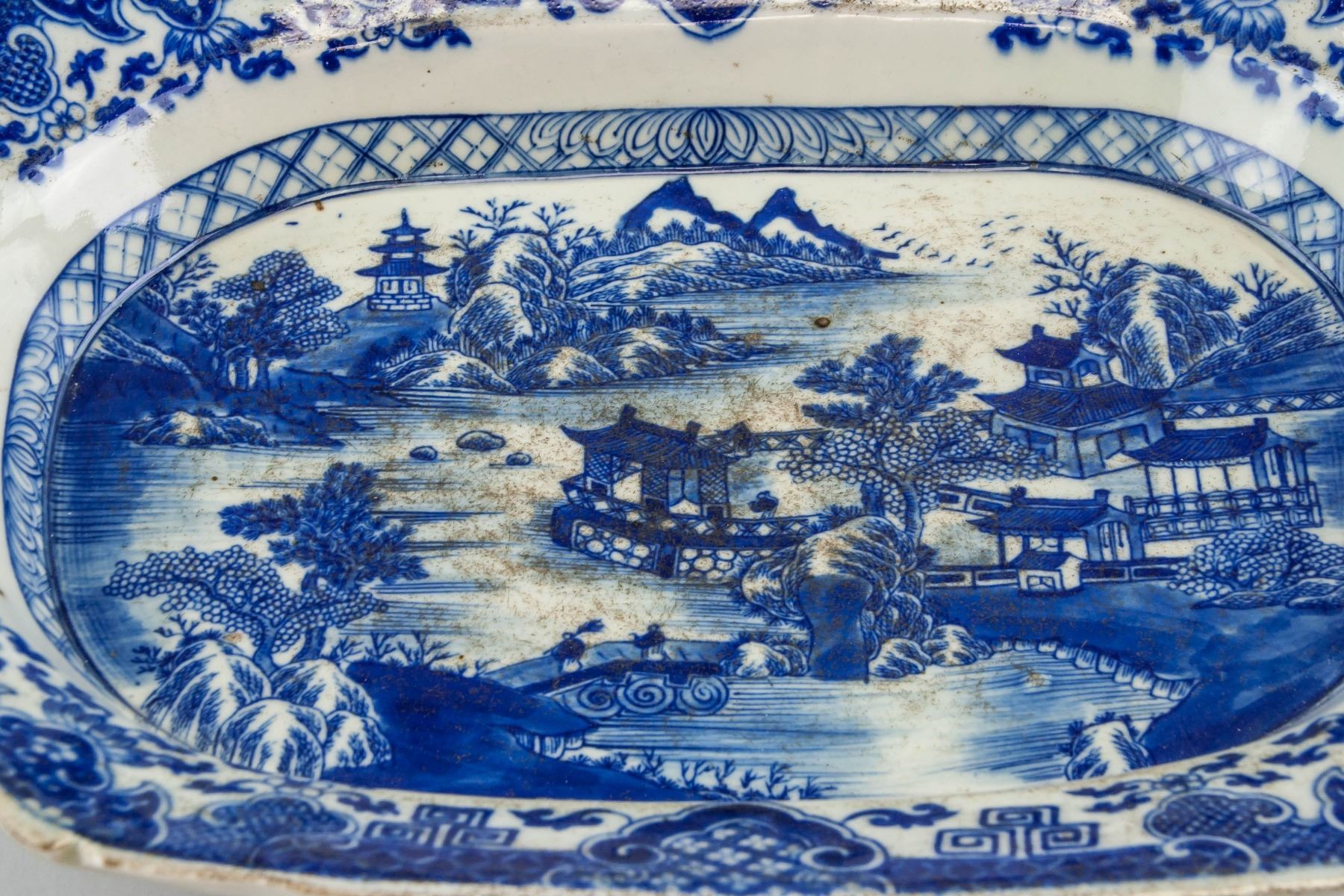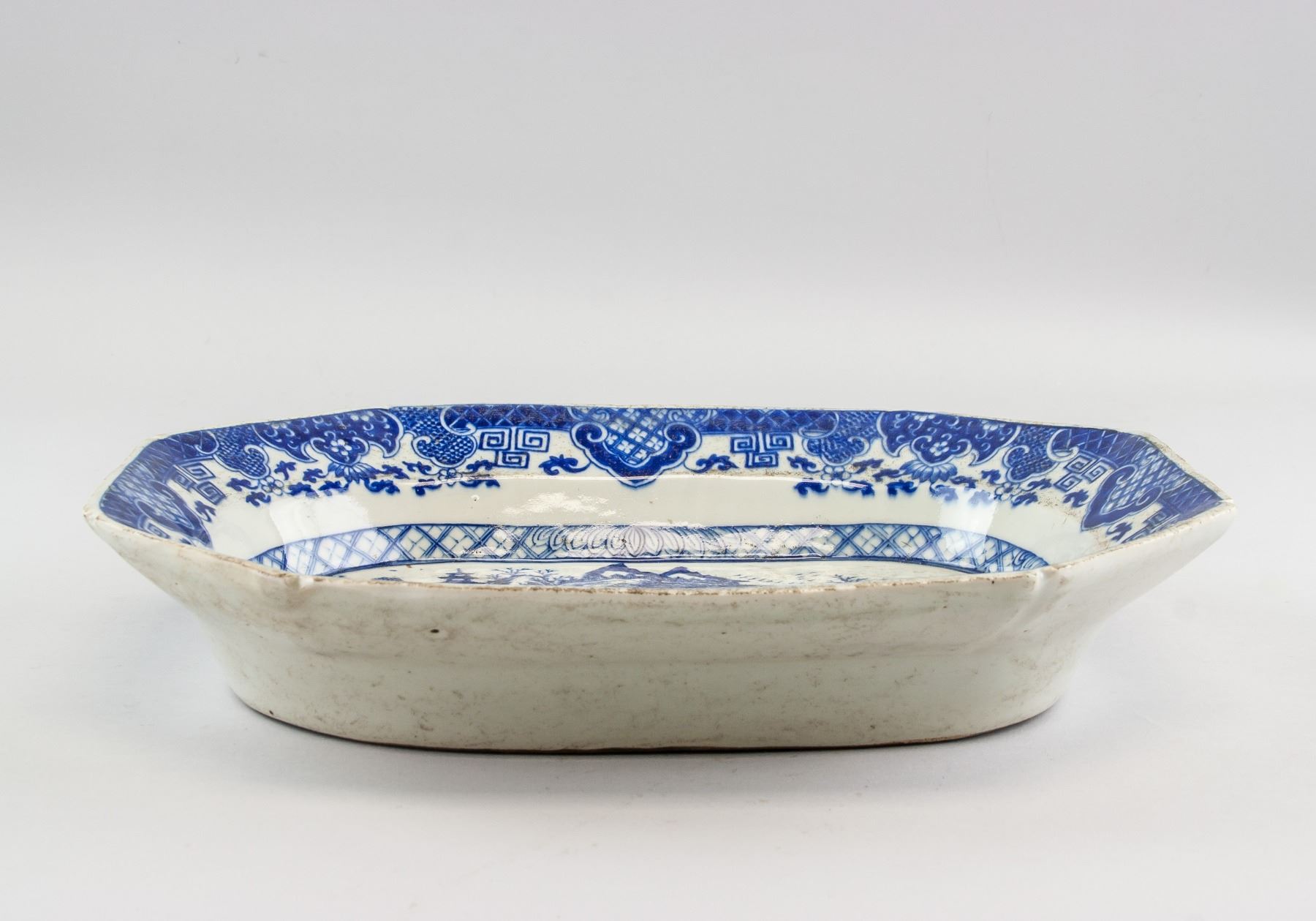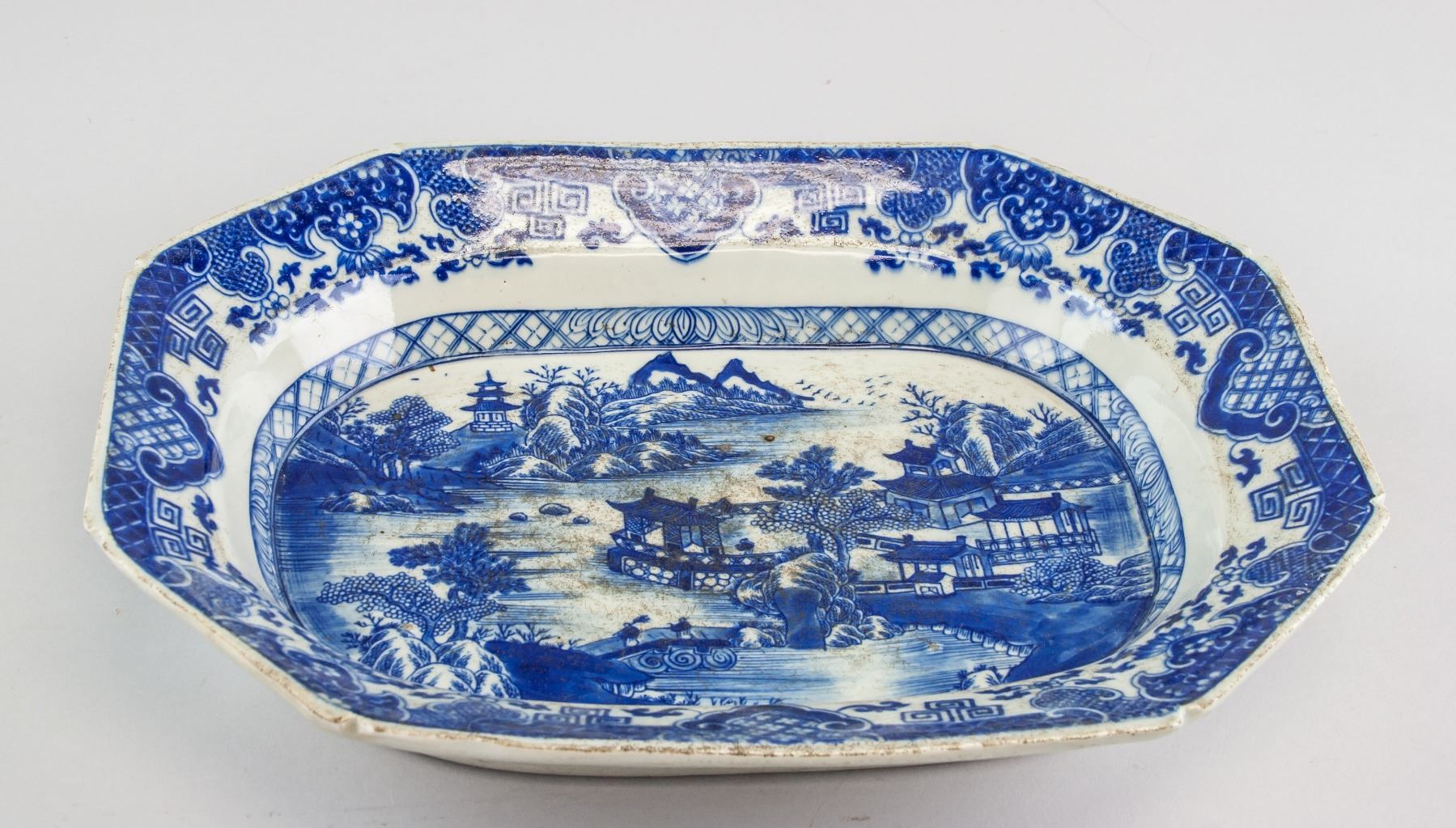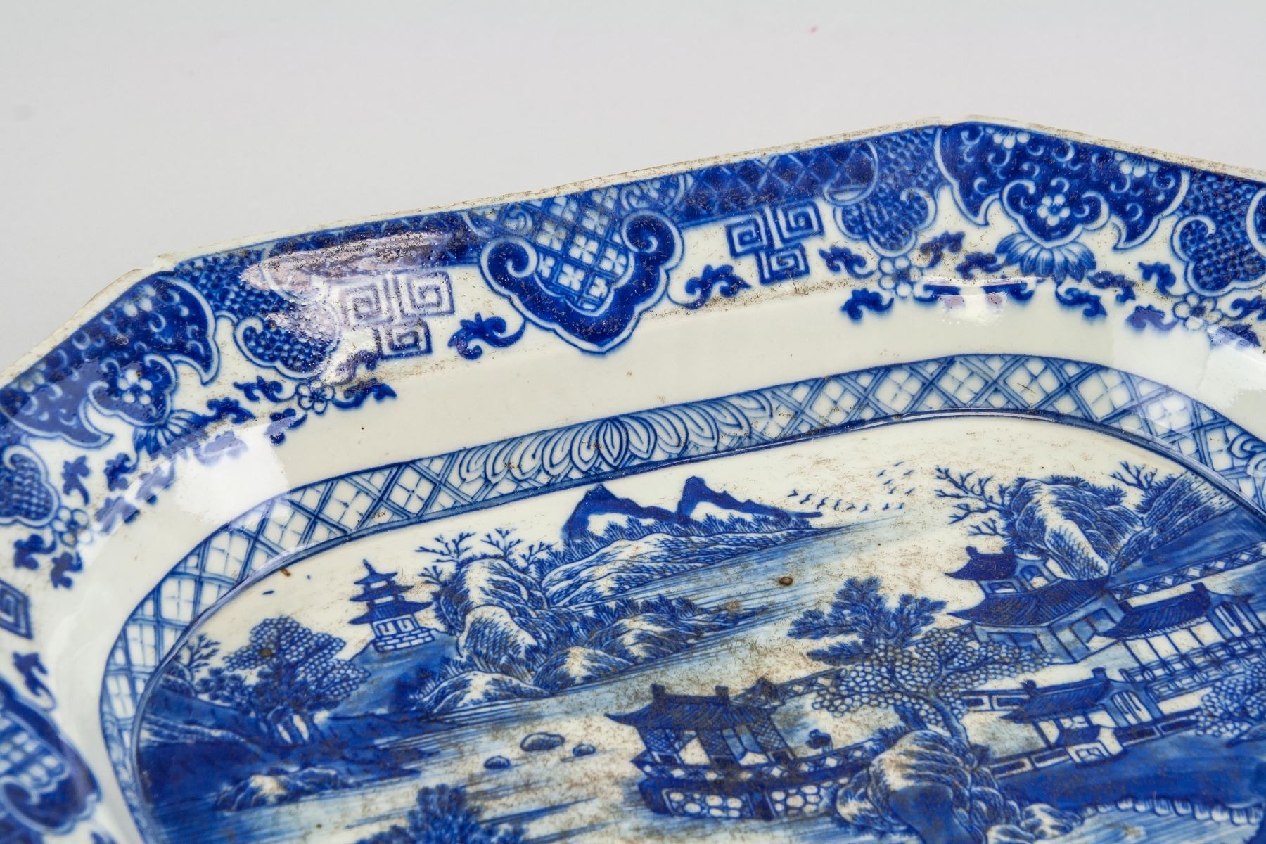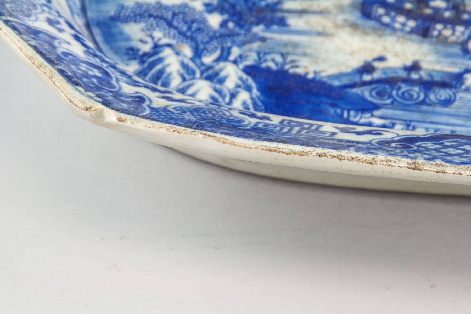 Chinese export blue and white porcelain bowl, of hexagon edge, tapering to bottom, painted with mountainous landscape, decorated with auspicious symbol pattern, 6.5 x 34 cm, 2656 grams