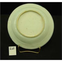 Chinese Export deep plate.  Canton blue & white with bluish tinge.  8-3/4" in diameter.  Condition:  Glaze "burn" and 1" hairline (only visible from underneath).  No chips or flakes.