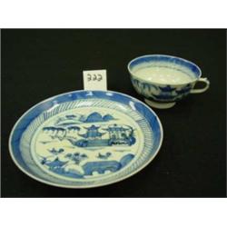 Chinese Export teacup & saucer.  Canton blue & white.  Footed cup is 3-3/4" in diameter and 2-3/8" high.  Saucer is 6" in diameter.  Condition:  No chips, cracks or flakes.  Saucer has faint band with yellowish tinge at the center.