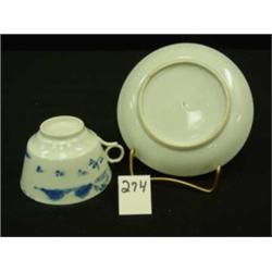 Chinese Export footed teacup & saucer.  Canton blue & white.  Footed cup is 2-5/8" tall and 3-7/8" in diameter.  Saucer is 6" in diameter.  Condition:  Cup has rim chips.  Saucer has nearly invisible rim flake.