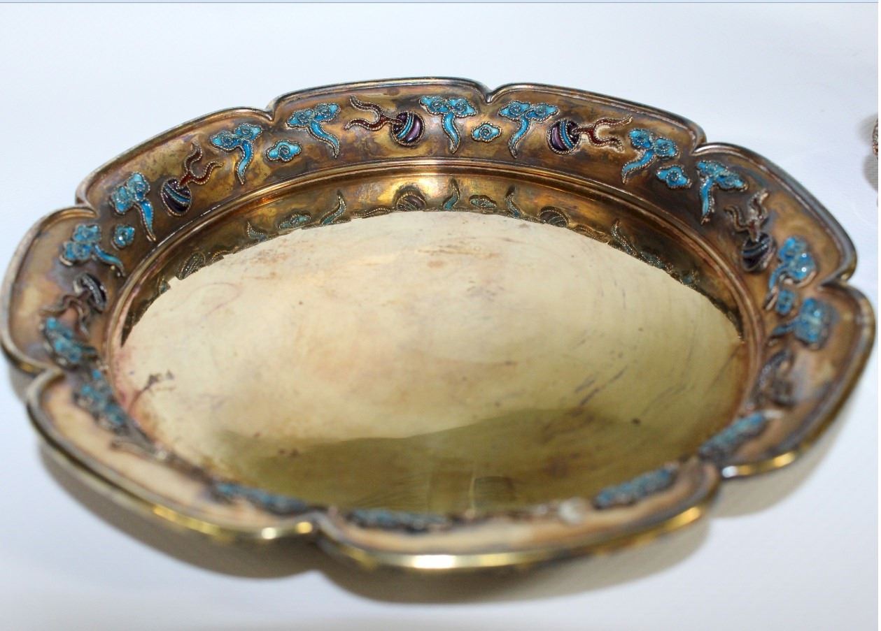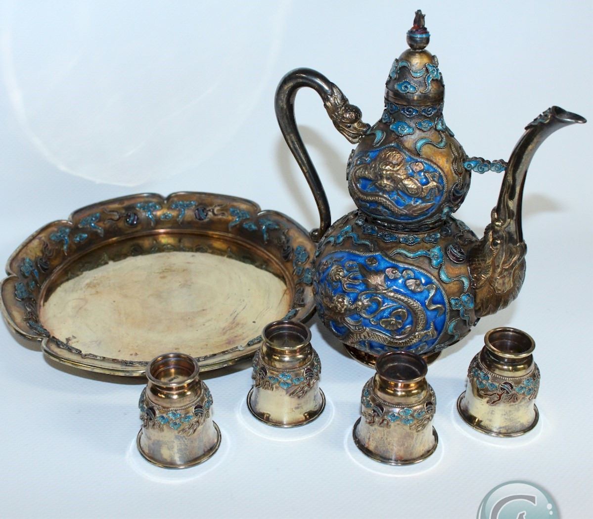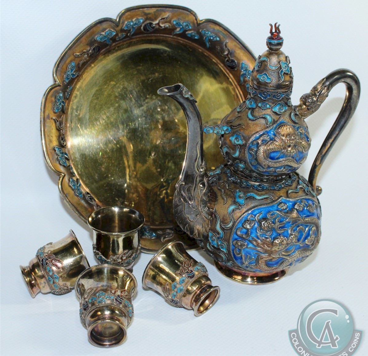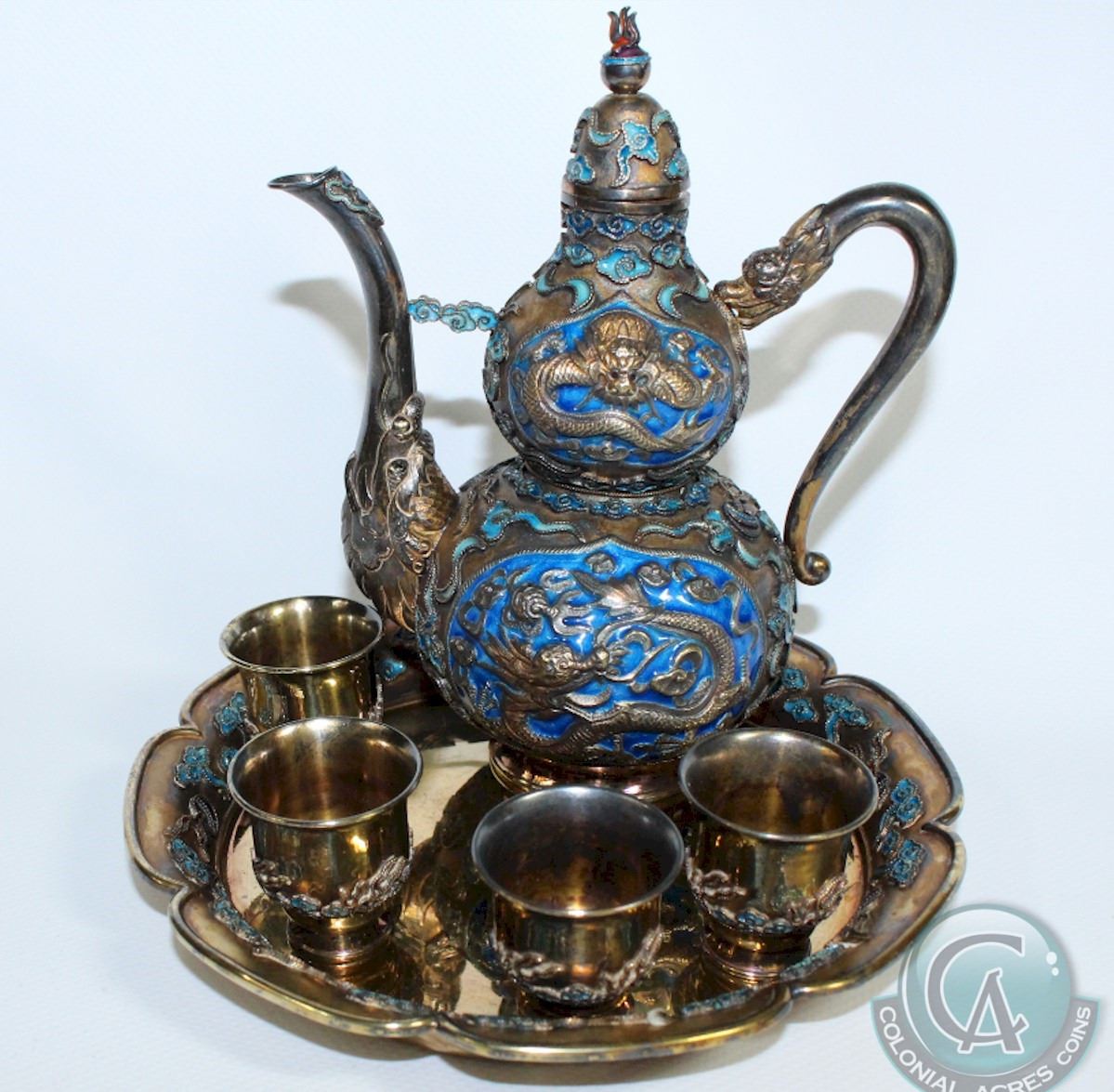 Chinese Export Cloisonné - Silver Gilt & Accented with Blue, Purple, and Red Enamel Tea service with Dragon Design. Tea Pot is approximately 6 1/2" in height, while the cups measure 1 1/2" in height, and tray is 6 1/2" in diameter. Pieces are in wonderful condition with a light patina. Some Light surface scratches are visible on the tray from light use or polishing. A beautiful center Piece for any collector. Set has a total combined weight of 607.18 grams.