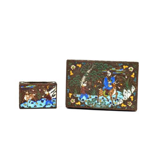 <p>Old (1930's) Chinese Export Enamel Cigarette Box & Match Striker with Old man Ridding Stag </p><p>