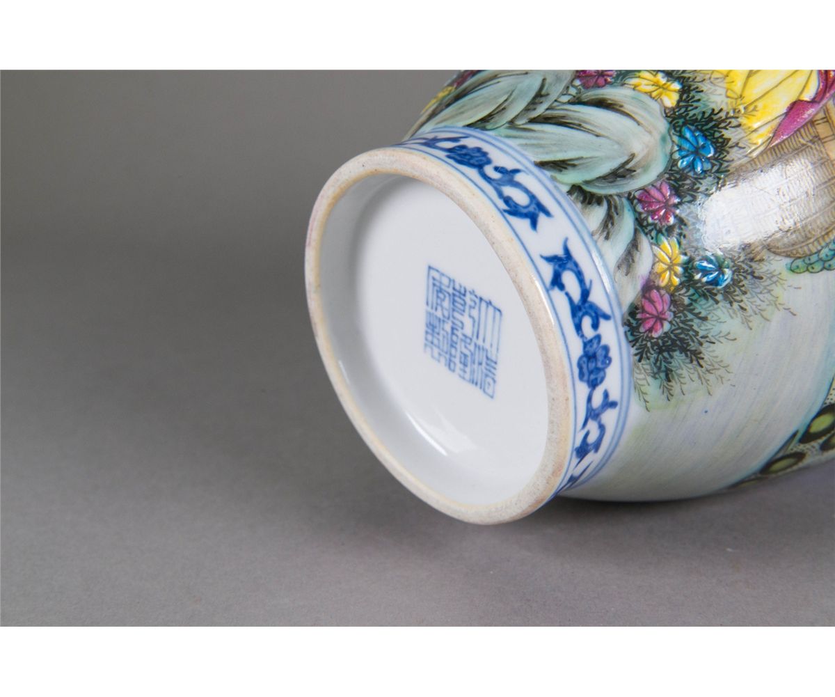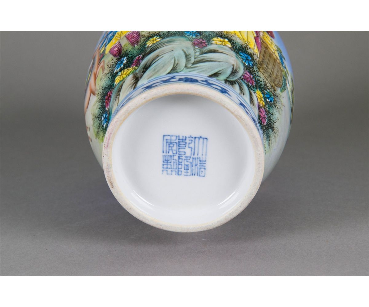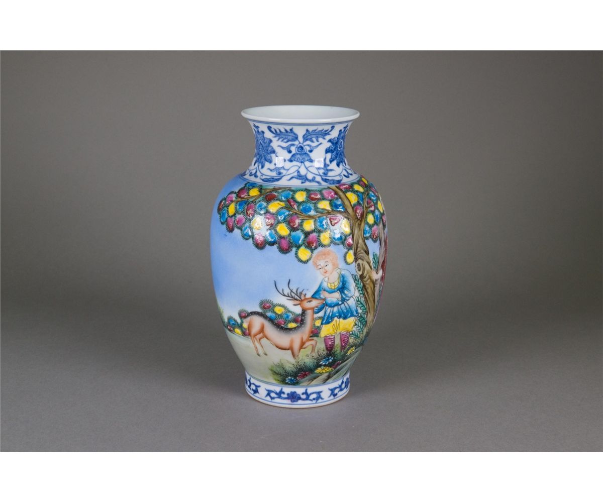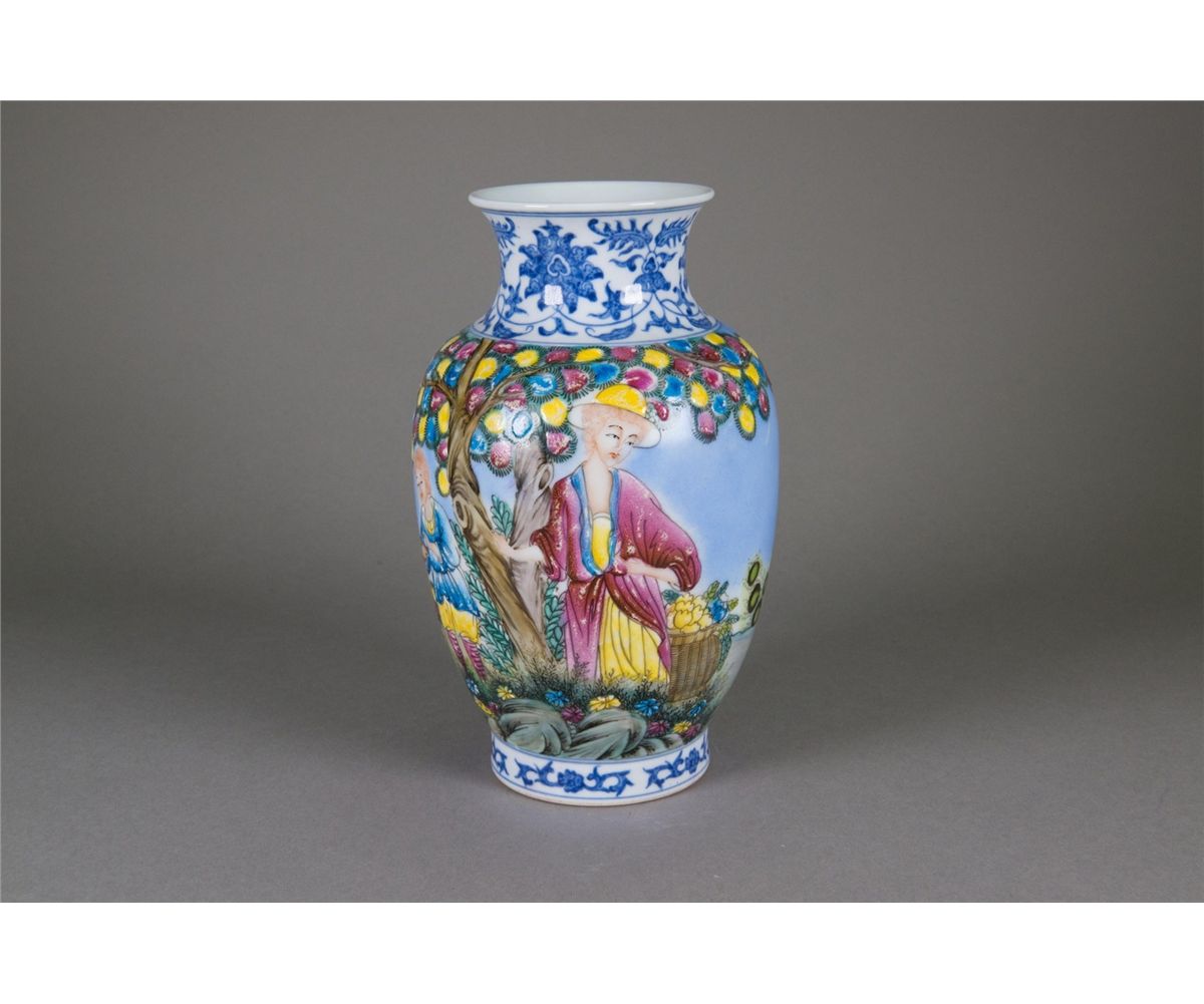 Chinese export figures vase; of blaster form; featuring blue and white scrolling vines on neck and foot rim; featuring Yangcai painting of white women with sika deer on body; six-character Qianlong mark on base and possible peiod; H: 22 cm, D: 13 cm, 802 grams